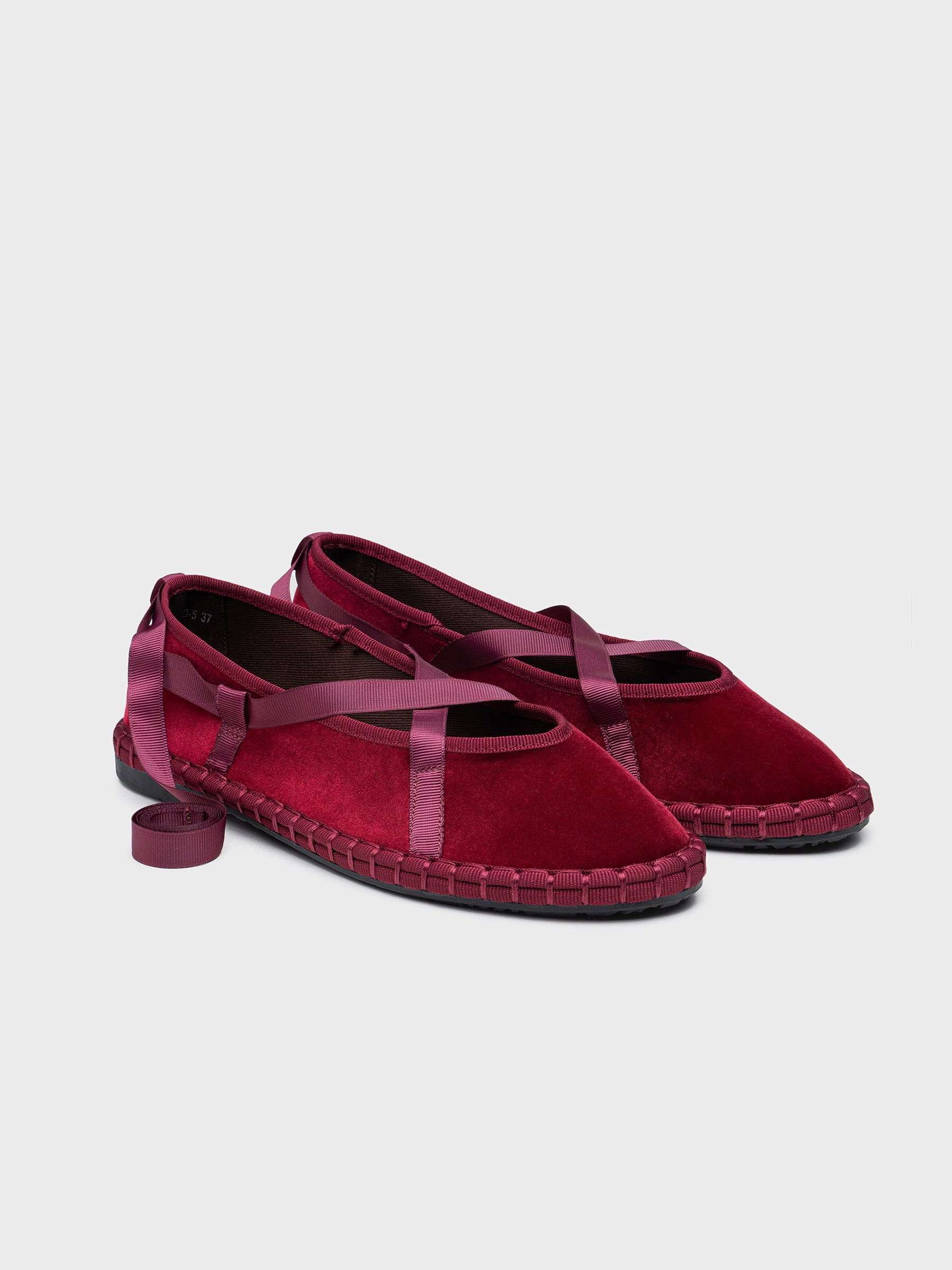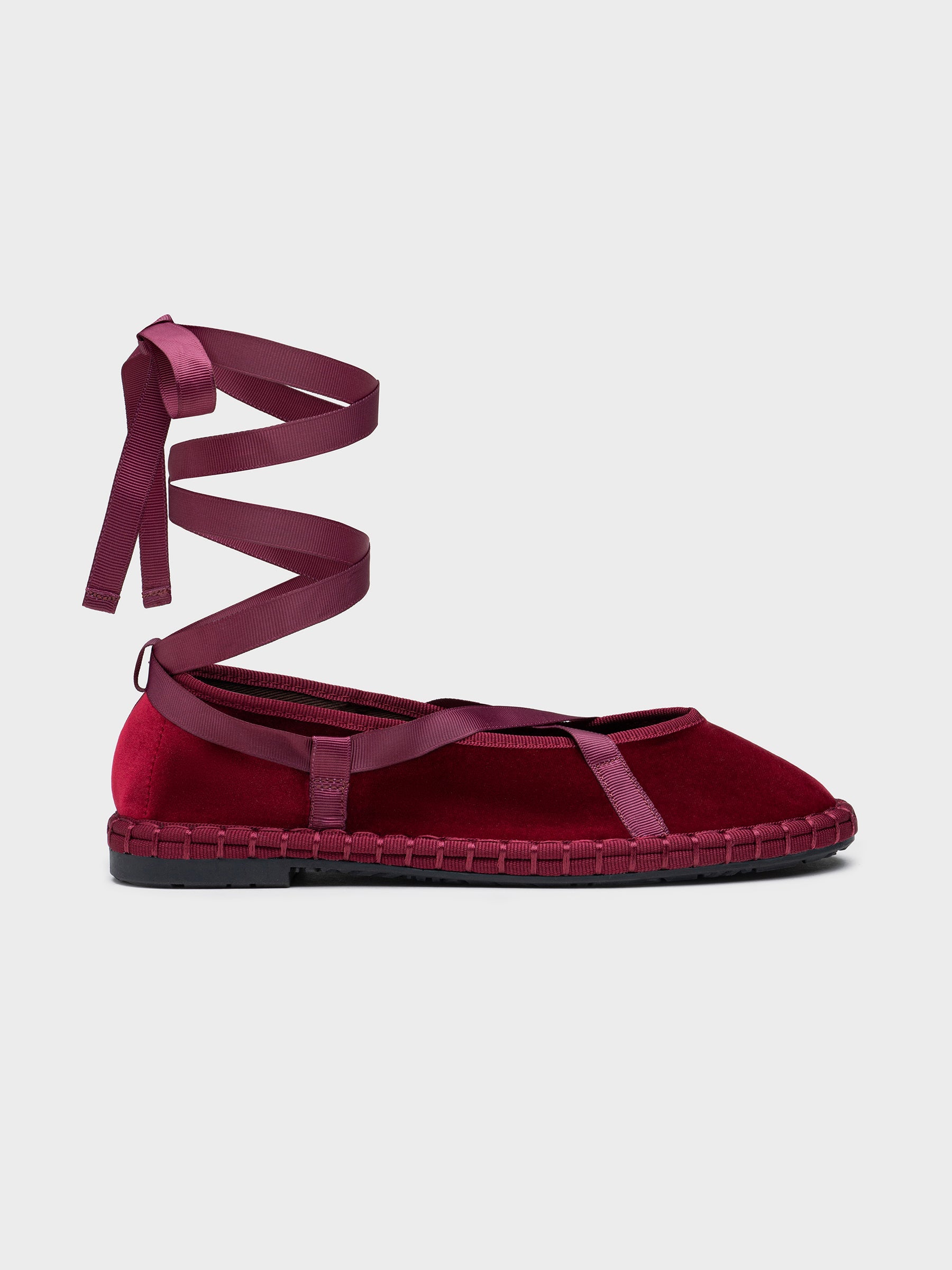 Zapato plano tipo bailarina. Tejido terciopelo. Acabado en punta redonda. Cierre de cordones. Suela plana. Suela de contacto antideslizante. Altura piso:...