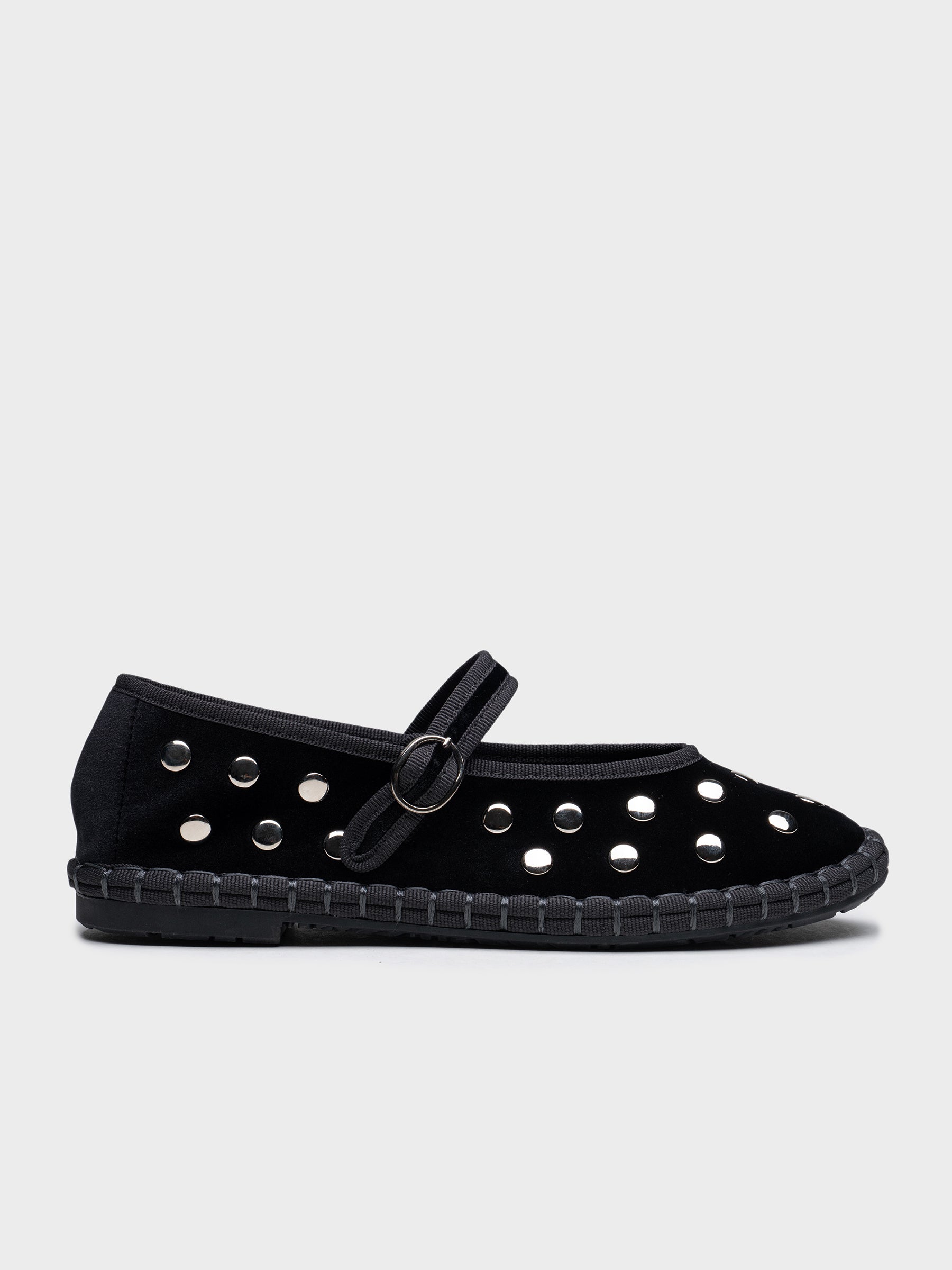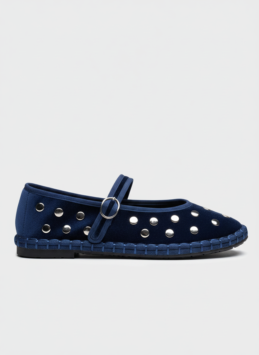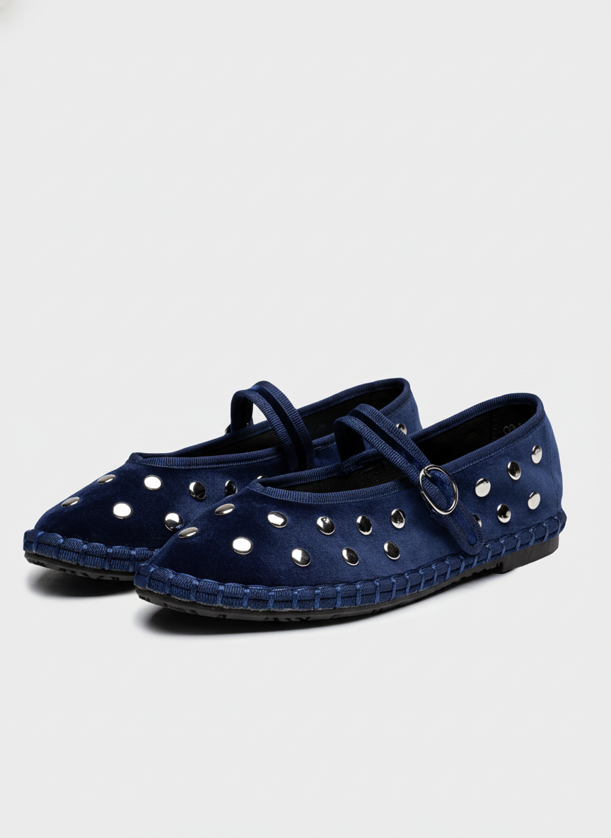Zapato plano tipo bailarina. Tejido terciopelo. Acabado en punta redonda. Detalle tachuelas.Hecho en P.R.C.