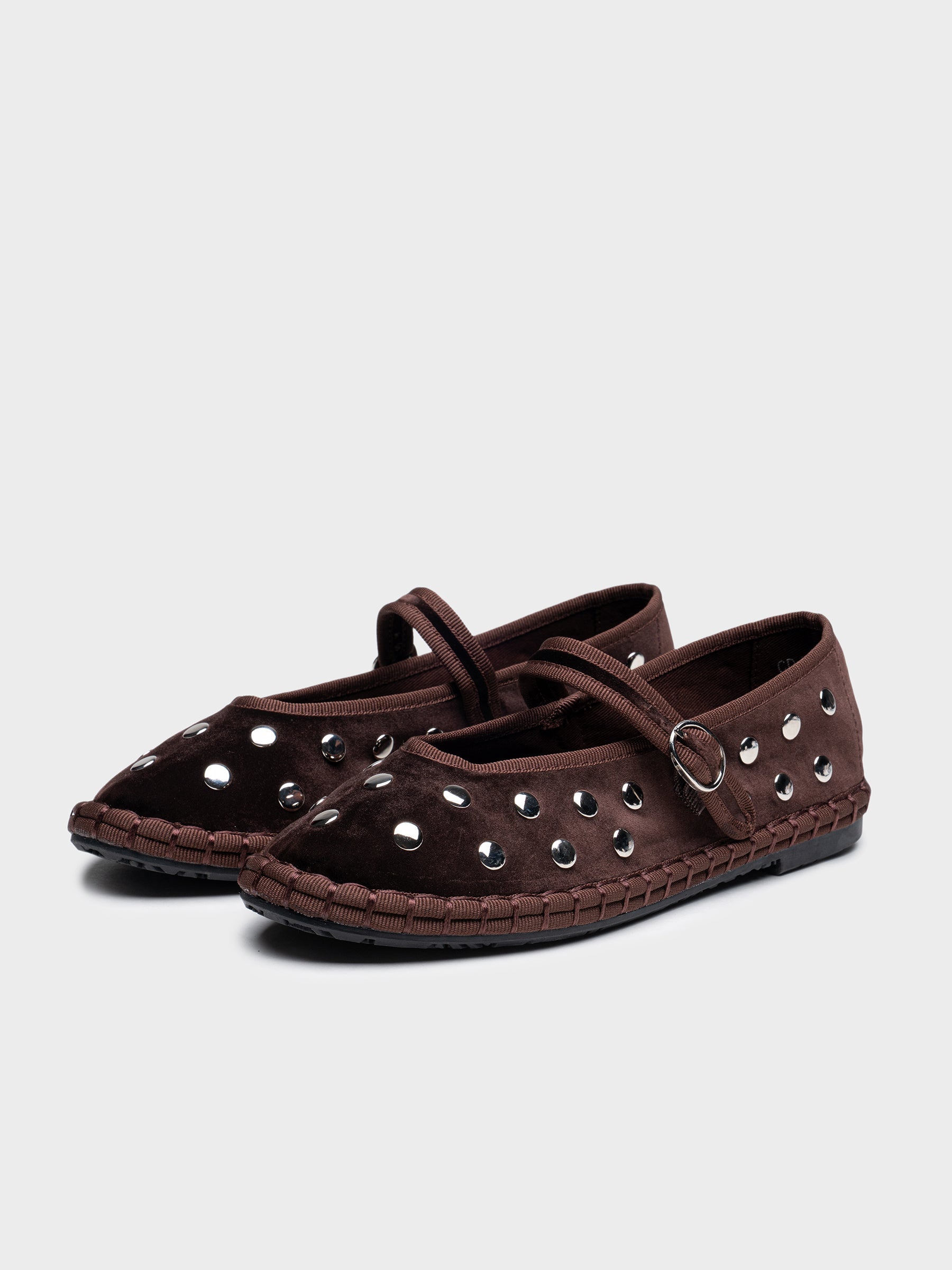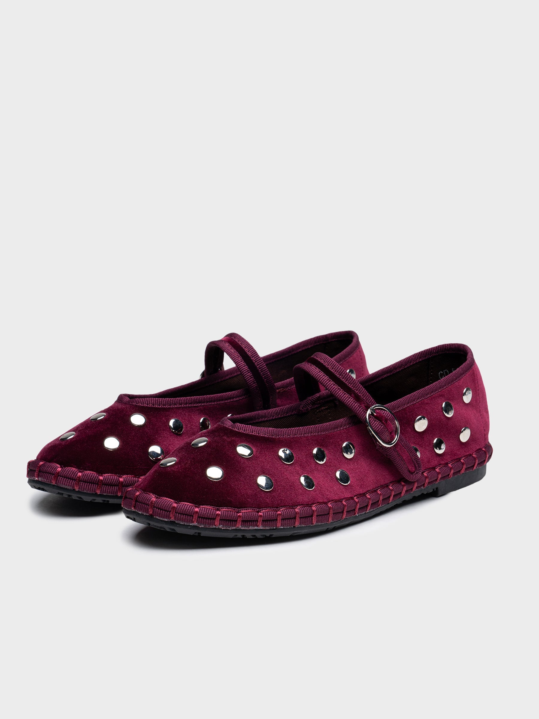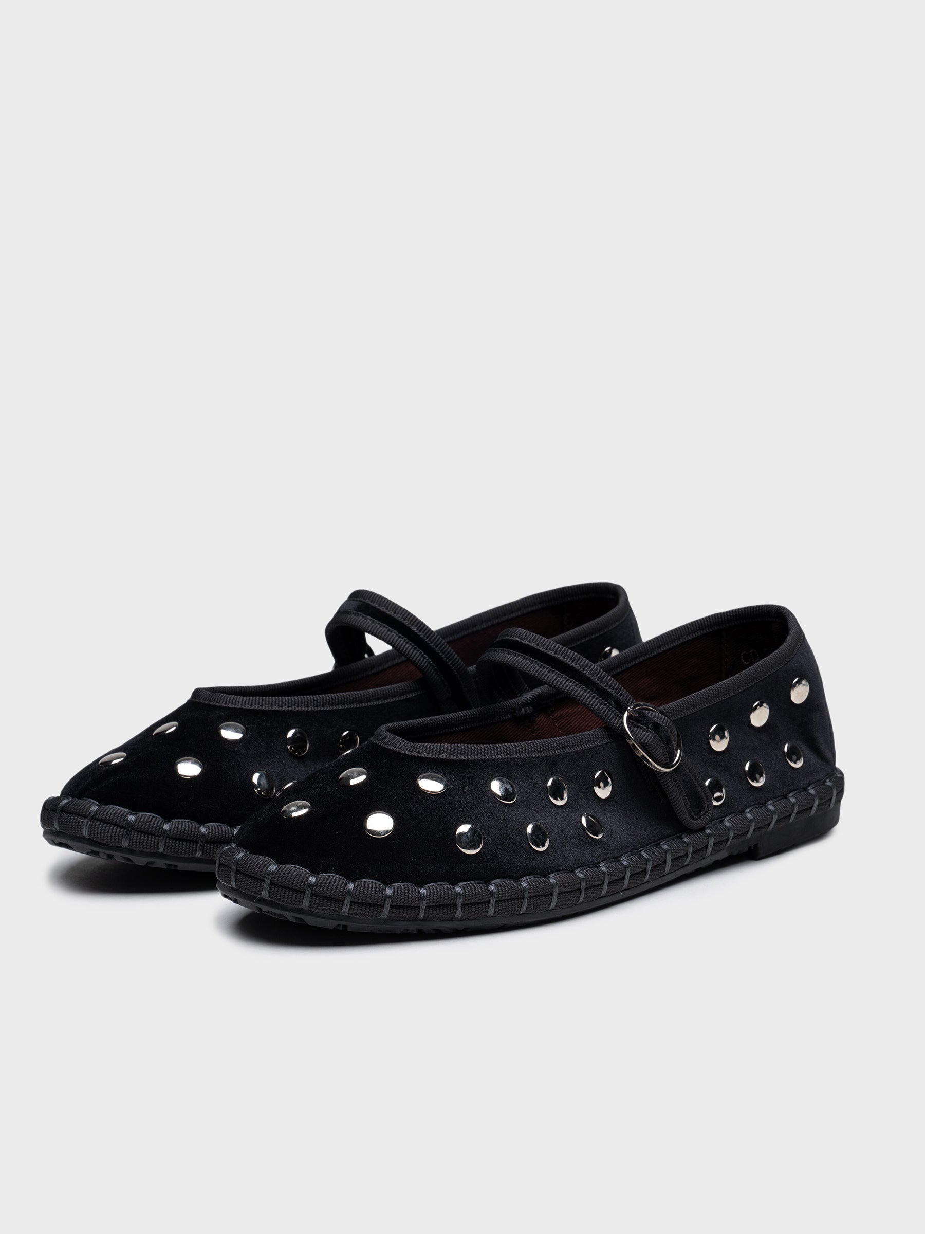 Zapato plano tipo bailarina. Tejido terciopelo. Acabado en punta redonda. Detalle tachuelas.Hecho en P.R.C.