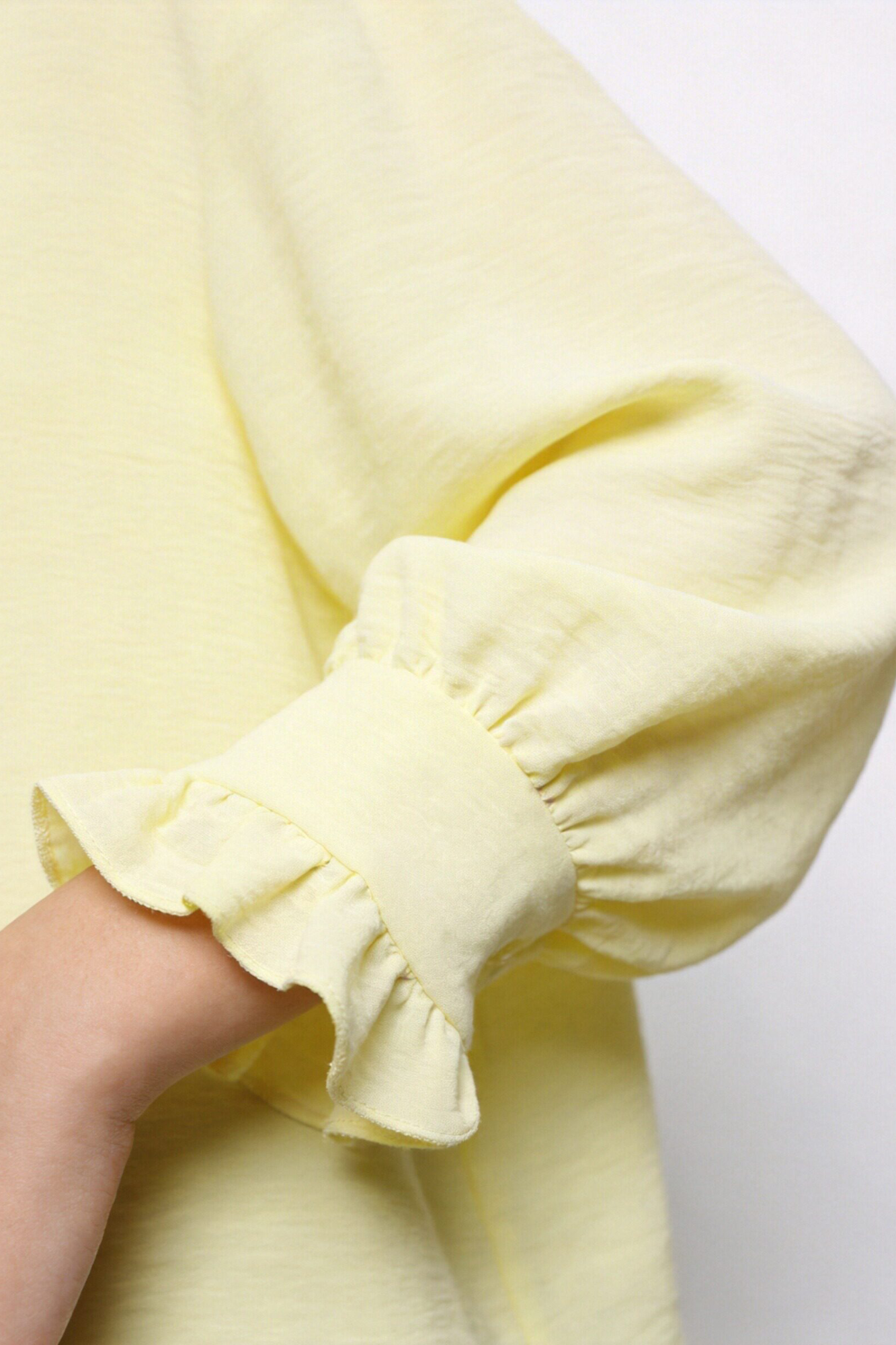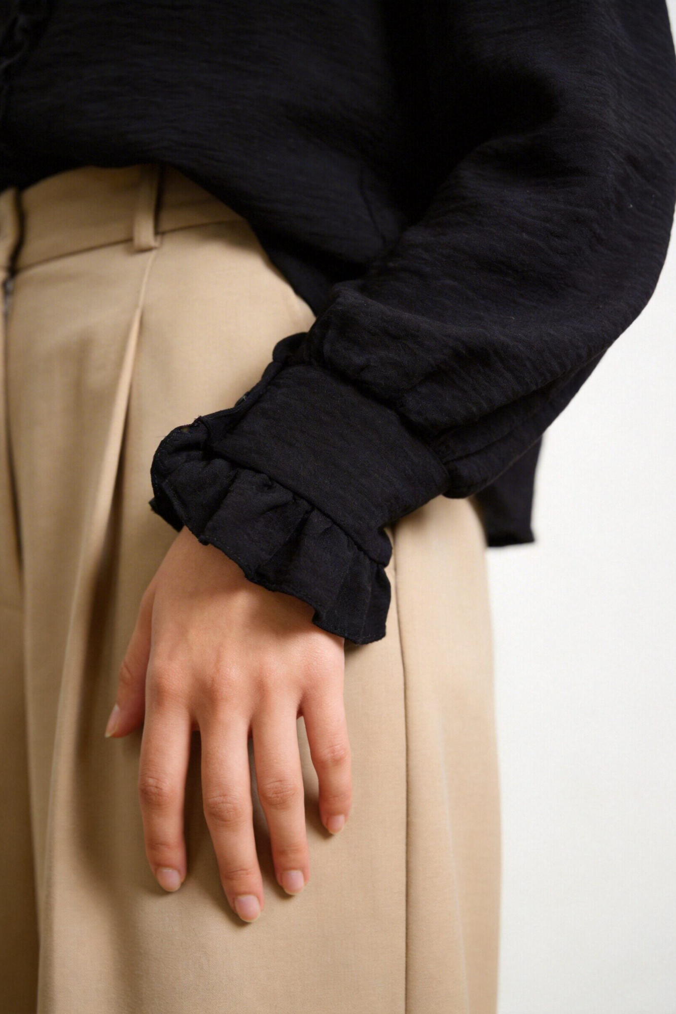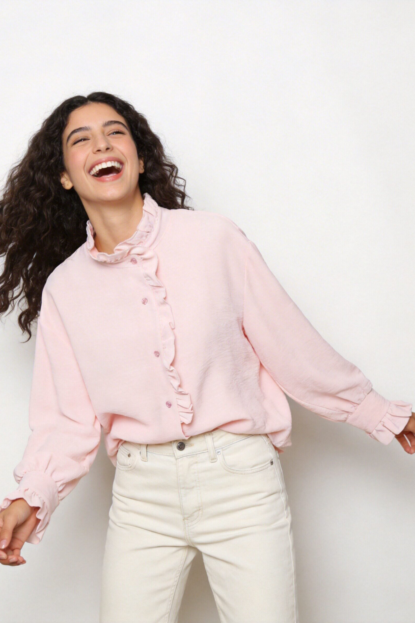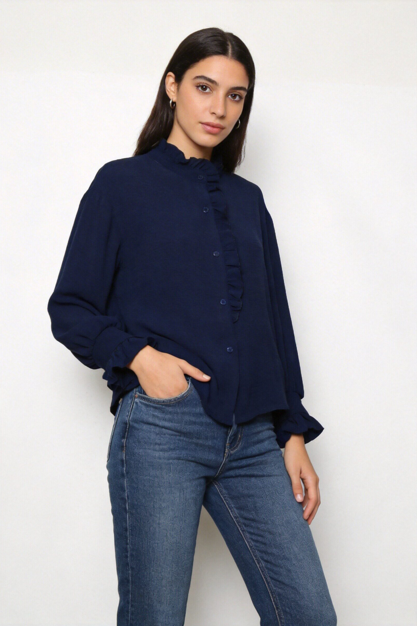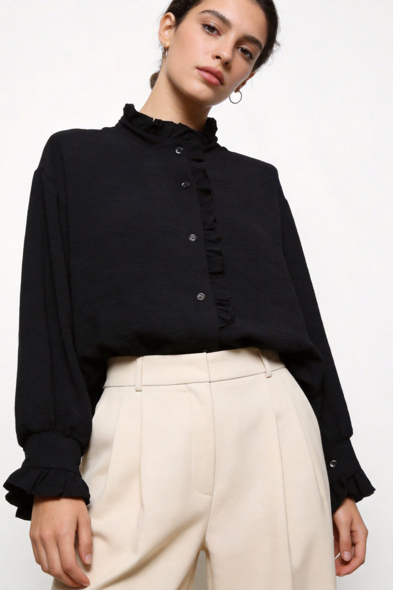 Tejido fluido. Cuello redondo subido. Manga larga. Cierre con botones. Detalle de volantes. Composición: 100% Poliester Hecho en Italia