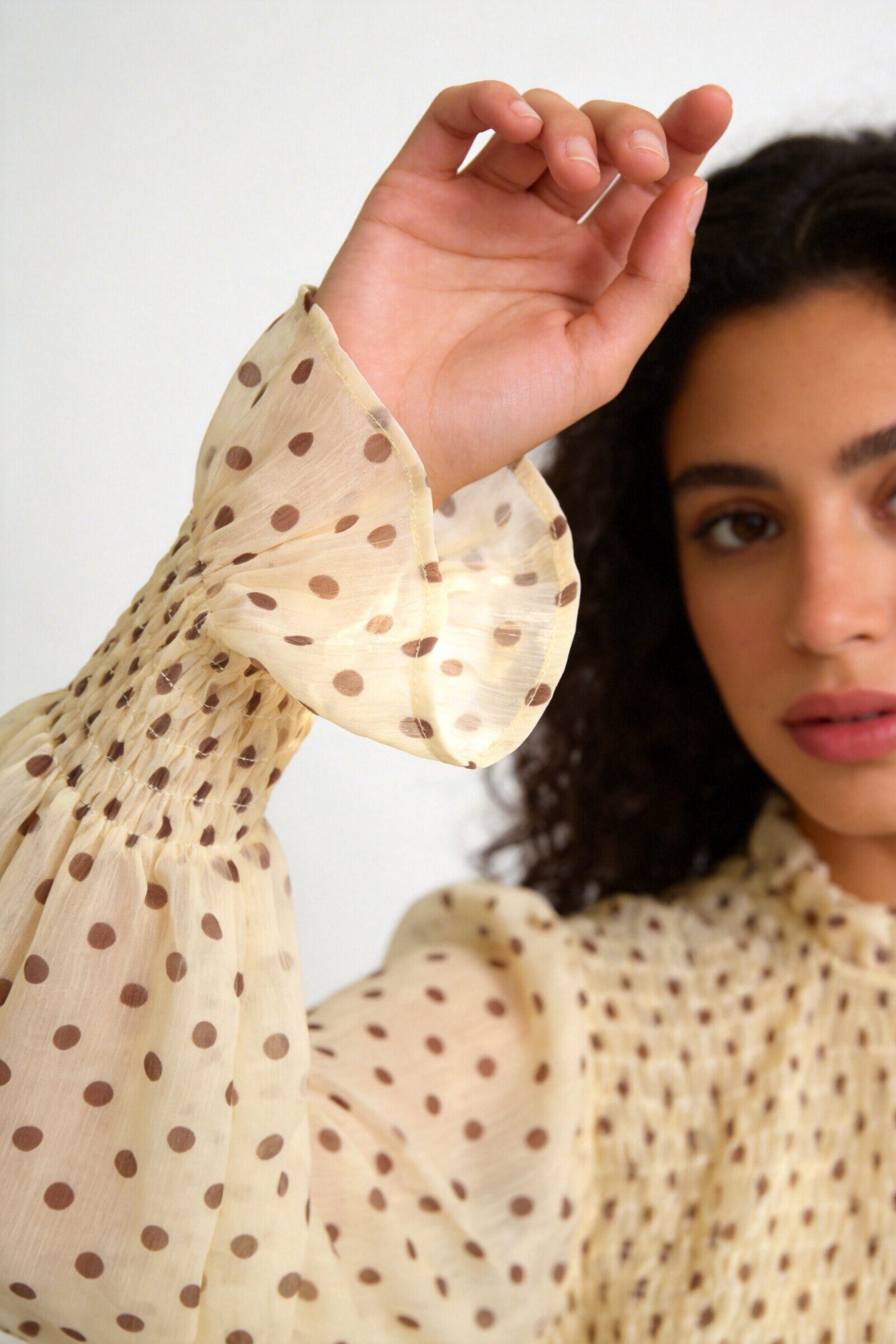 Tejido fluido. Cuello redondo. Manga larga. Cierre botón en el cuello. Cuerpo nido de abeja. Estampado de lunares. Composición: 100% PoliesterHecho Italia
