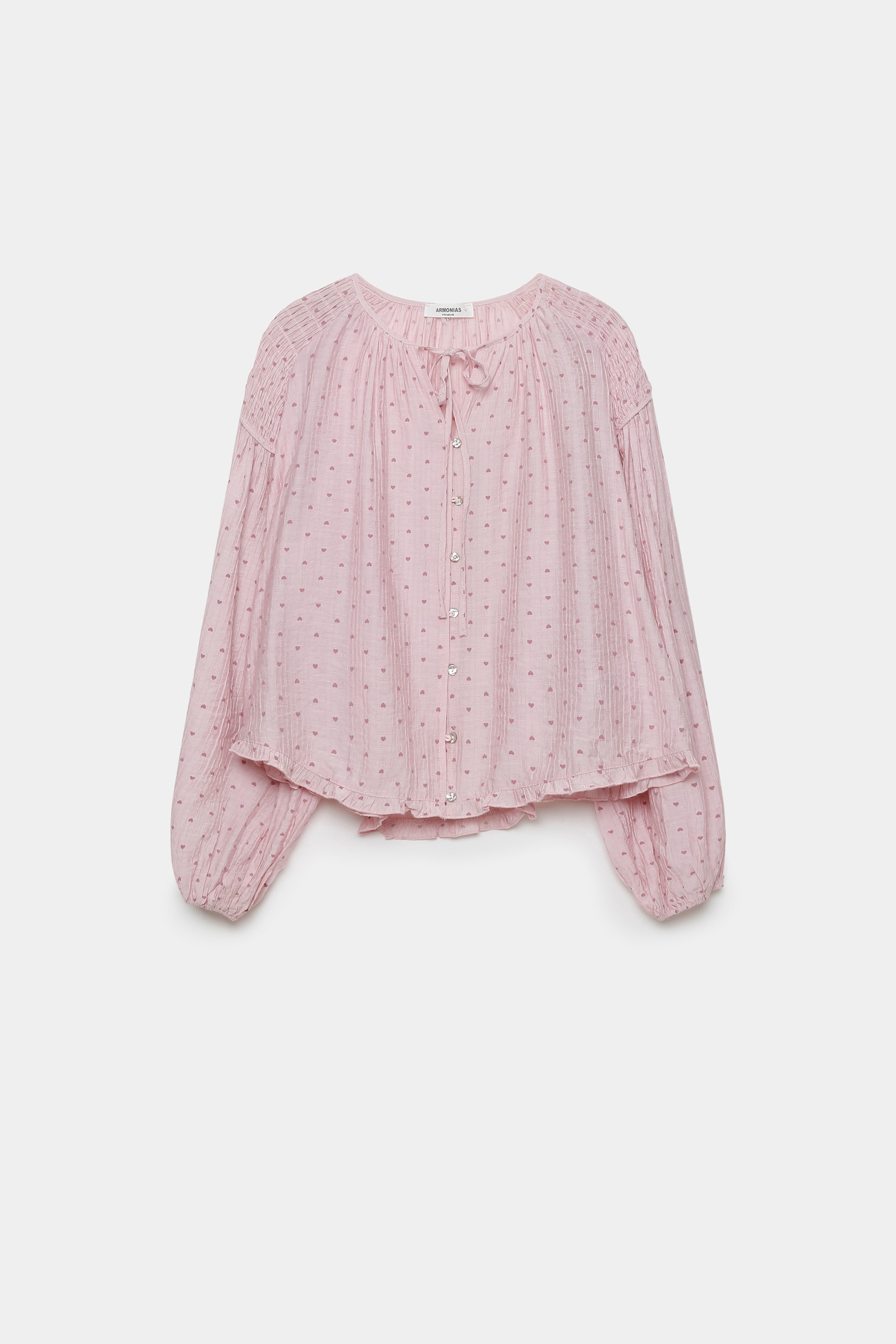 Tejido fluido. Estampado de corazones. Cuello redondo. Manga larga. Cuerpo amplio. Bajo acabado volantes. Cierre de botones y lazada. Composición: 80% Rayon, 20%...