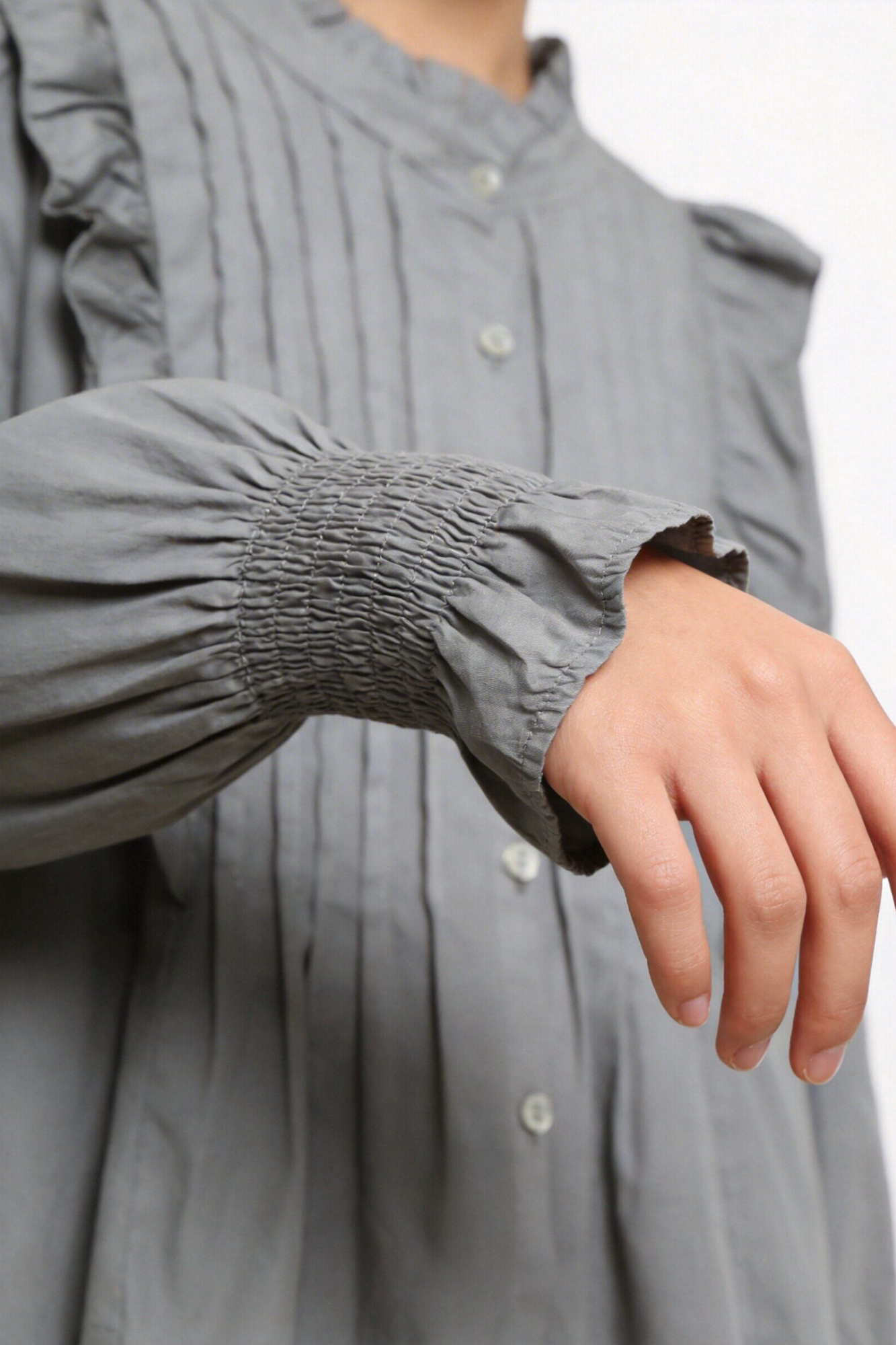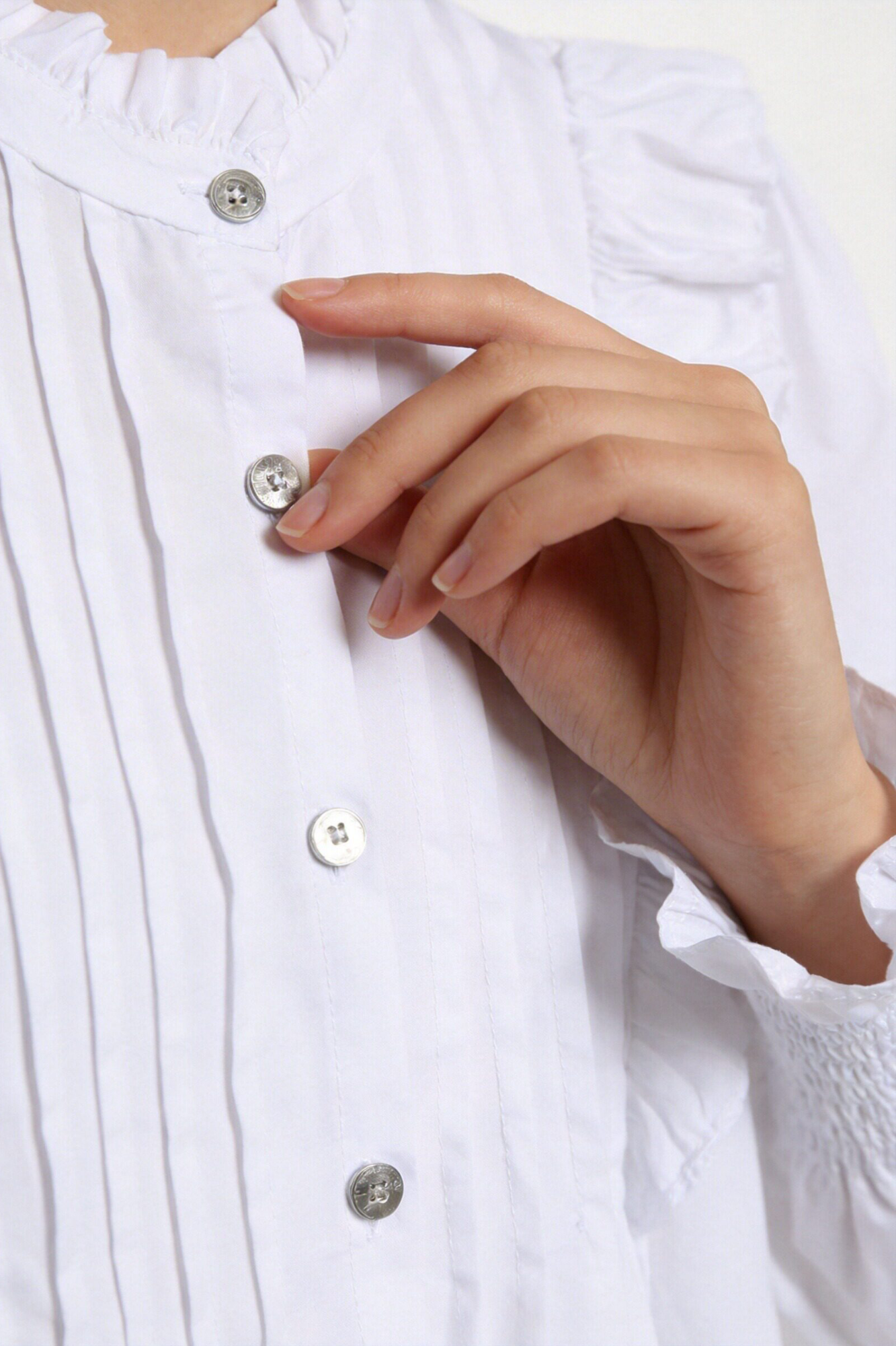 Tejido mezcla de algodón. Cuello redondo subido. Manga larga. Cierre con botones. Detalle de volantes y pliegues. Composición: 90% Algodón, 10% ElastanoHecho Italia