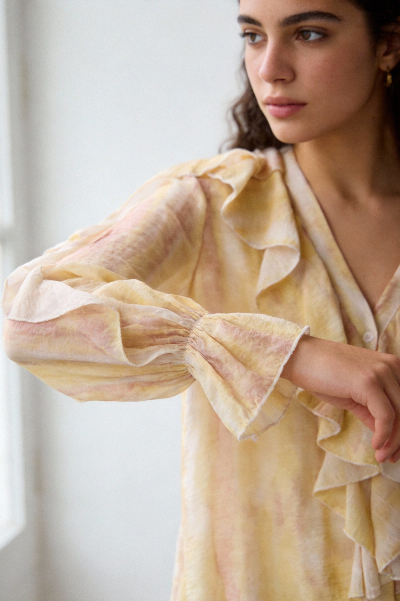 Tejido fluido. Escote pico. Manga larga. Detalle de volantes. Cierre con botones.Composición: 85% Tencel, 15% PoliesterHecho en Italia