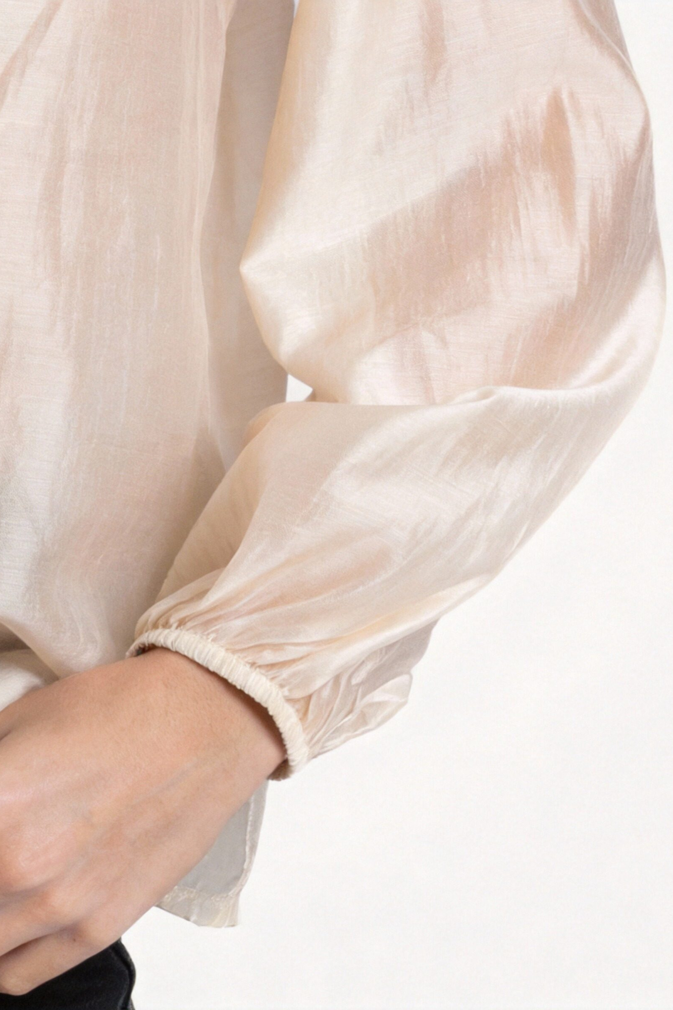 Tejido estilo gasa. Cuello redondo con lazada. Manga larga. Detalle de capas. Composición: 85% Tencel, 15% Poliester Hecho en Italia