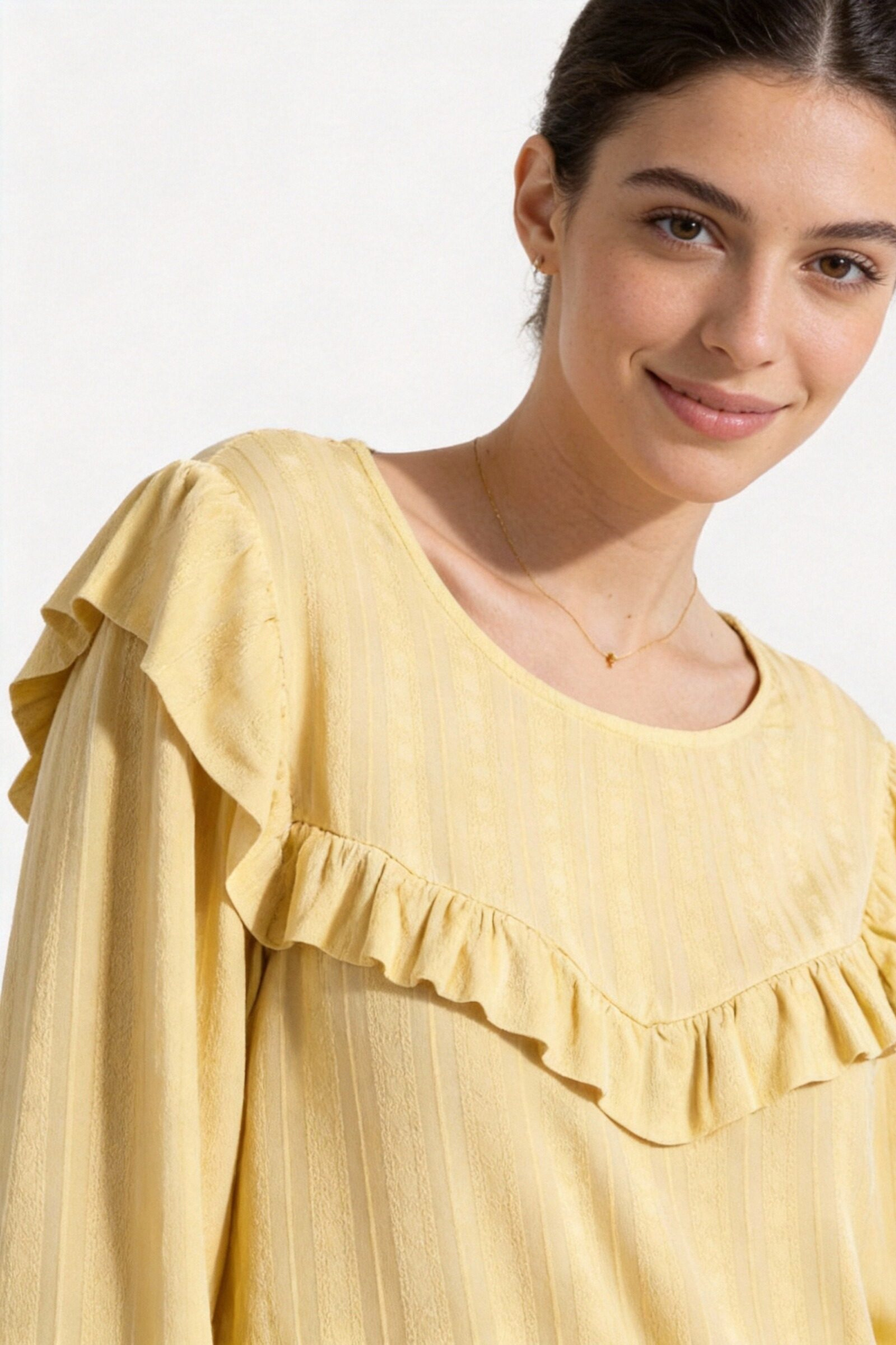Tejido fluido. Cuello redondo. Manga larga. Cierre en la trasera con botón. Detalle de volantes. Composición: 100% Viscosa Hecho en Italia