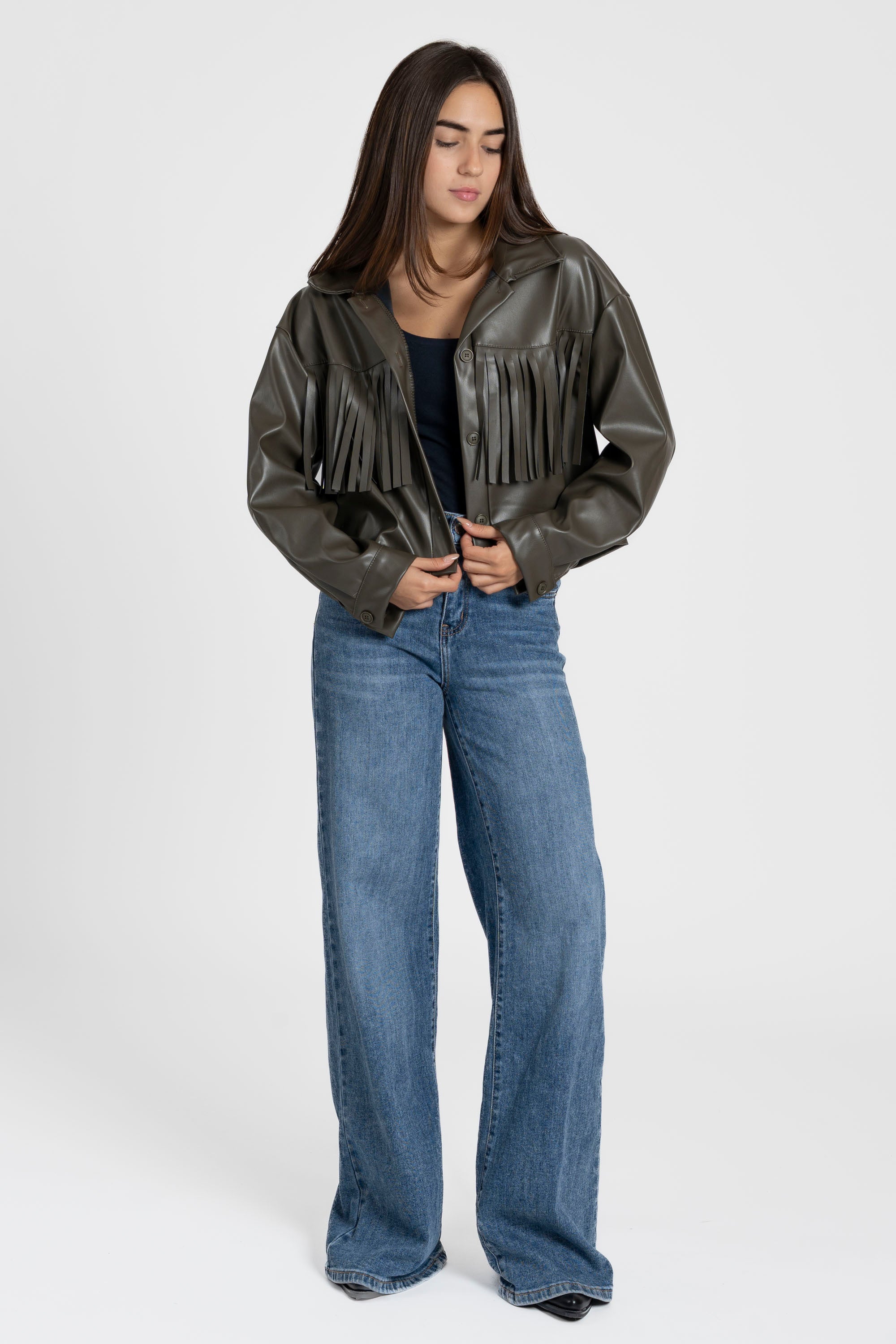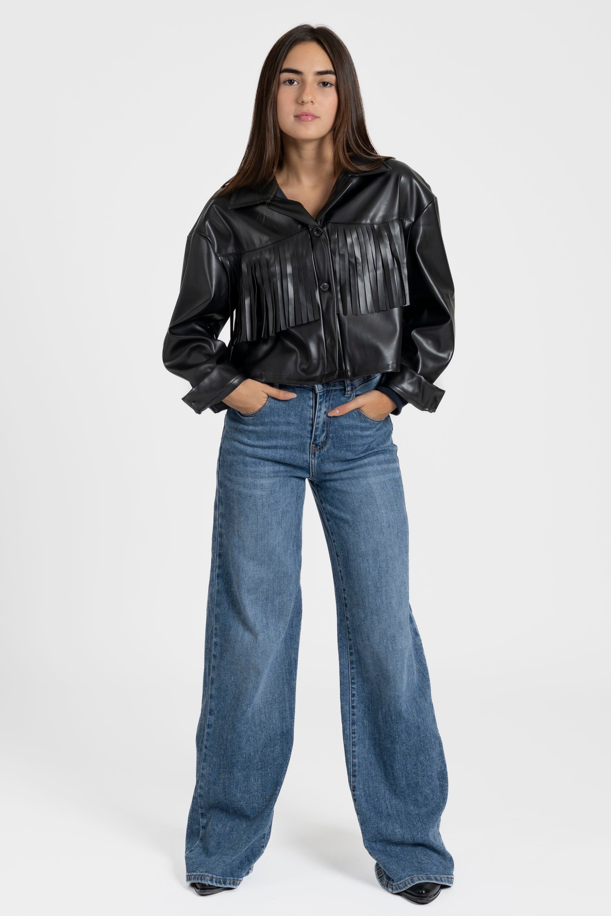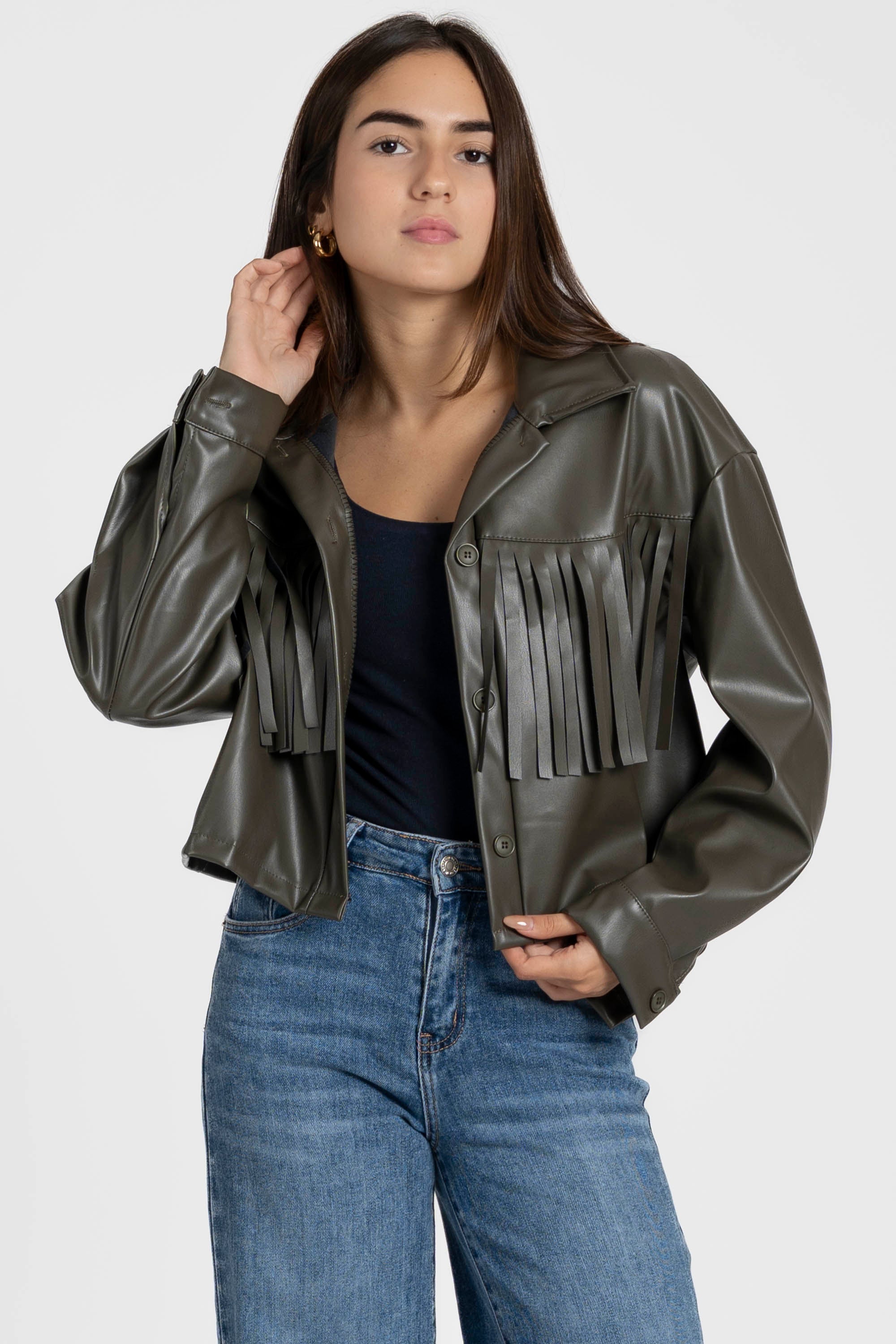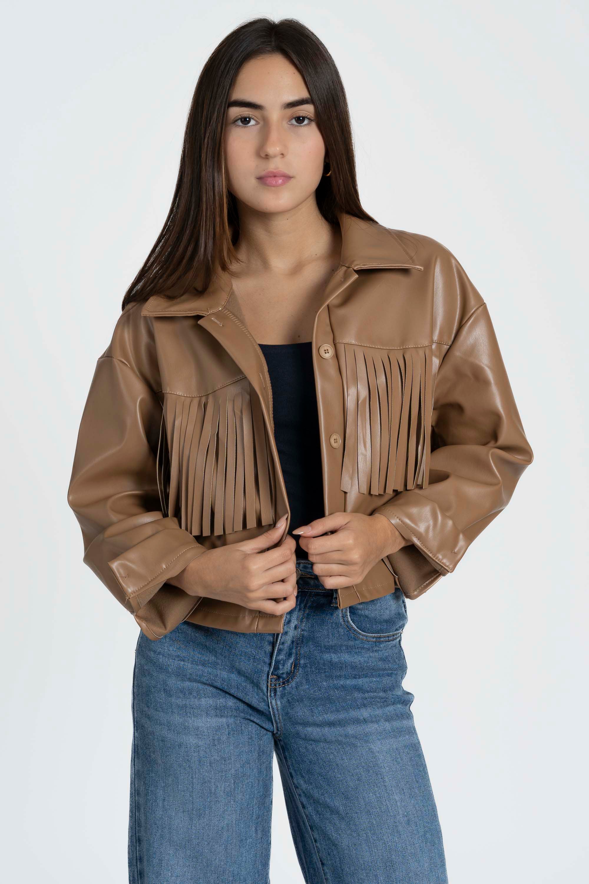 Tejido efecto piel. Cuello solapa. Detalle de flecos. Manga larga. Cierre de botones. Composición: 70% Poliéster, 30% PUHecho en Italia