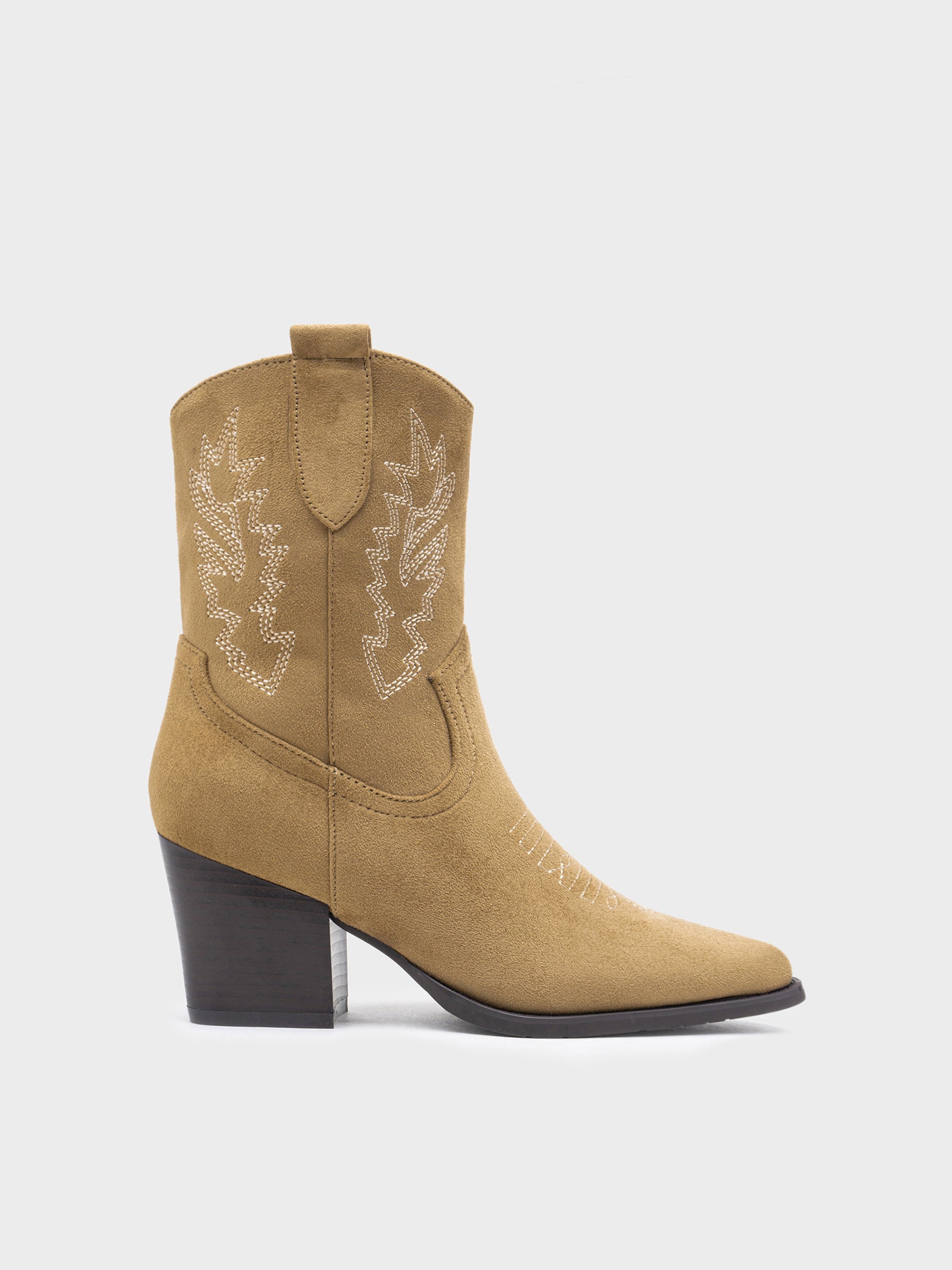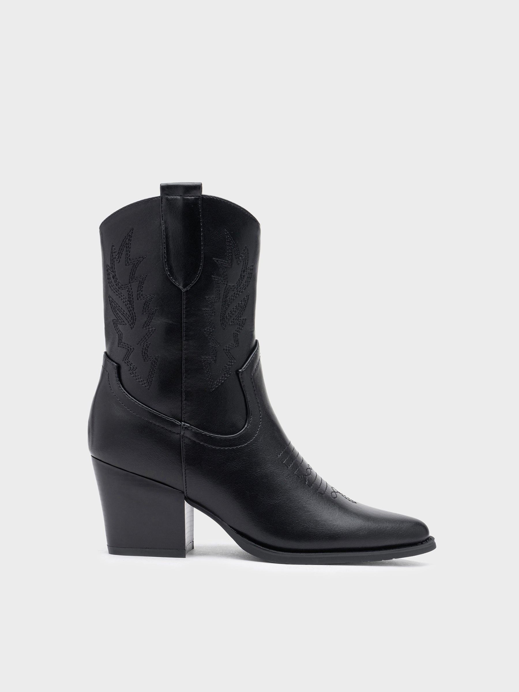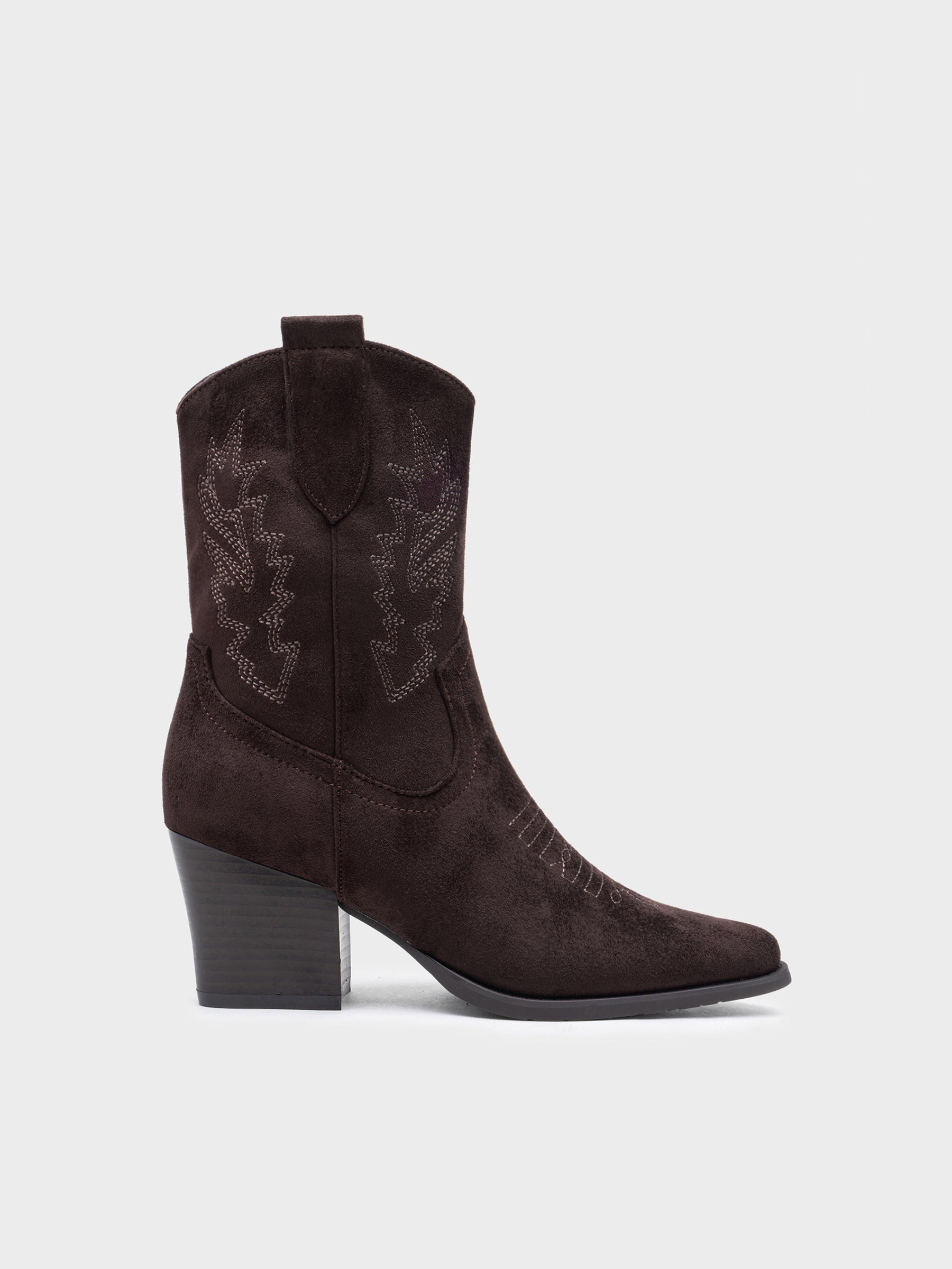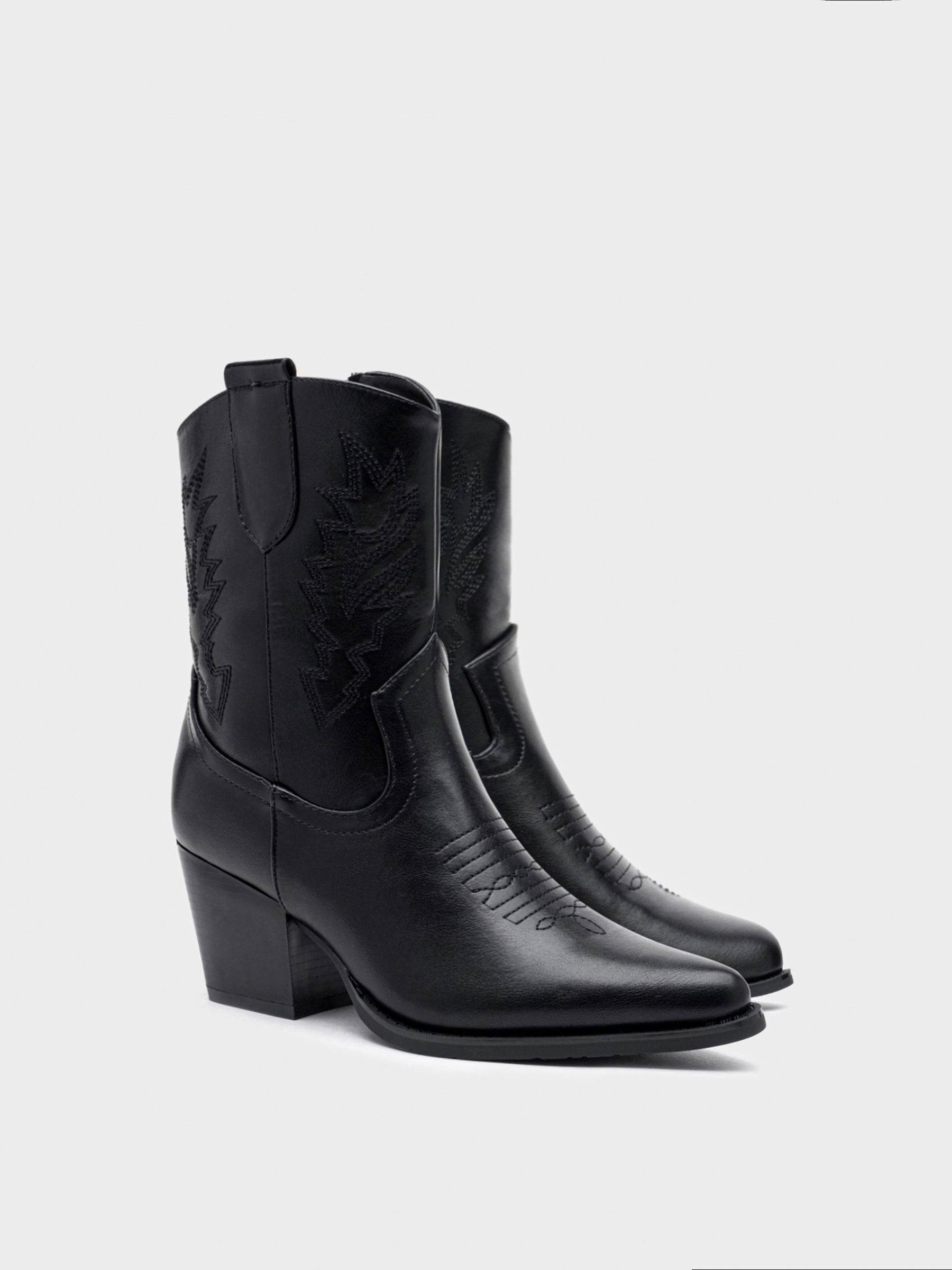 Botines estilo cowboy. Detalle de tiradores en caña y cosido. Se recomienda pedir una talla más. Altura tacón 7 cm.Hecho en P.R.C.