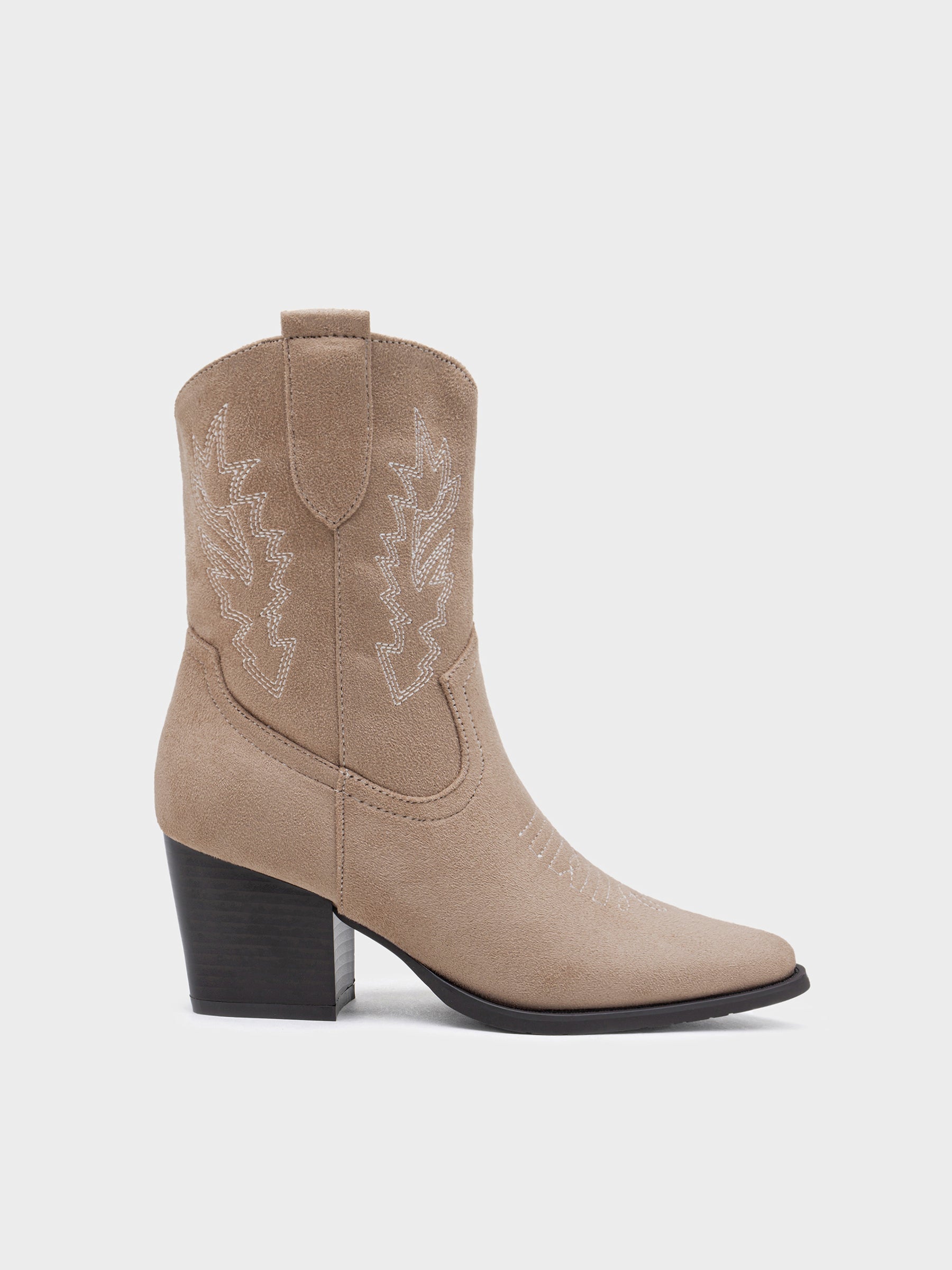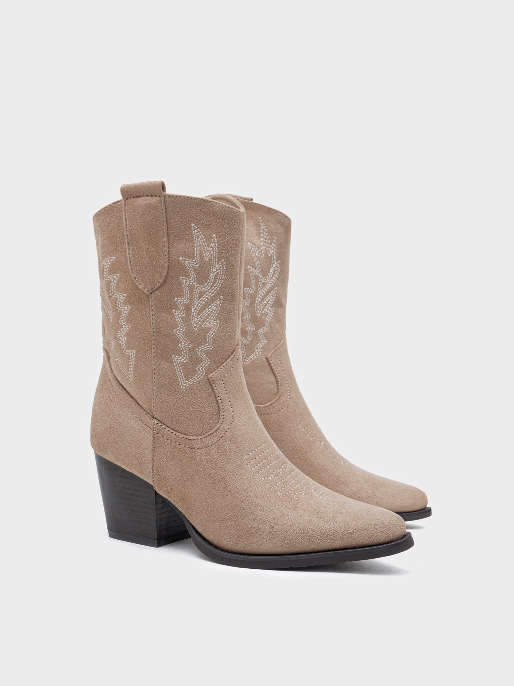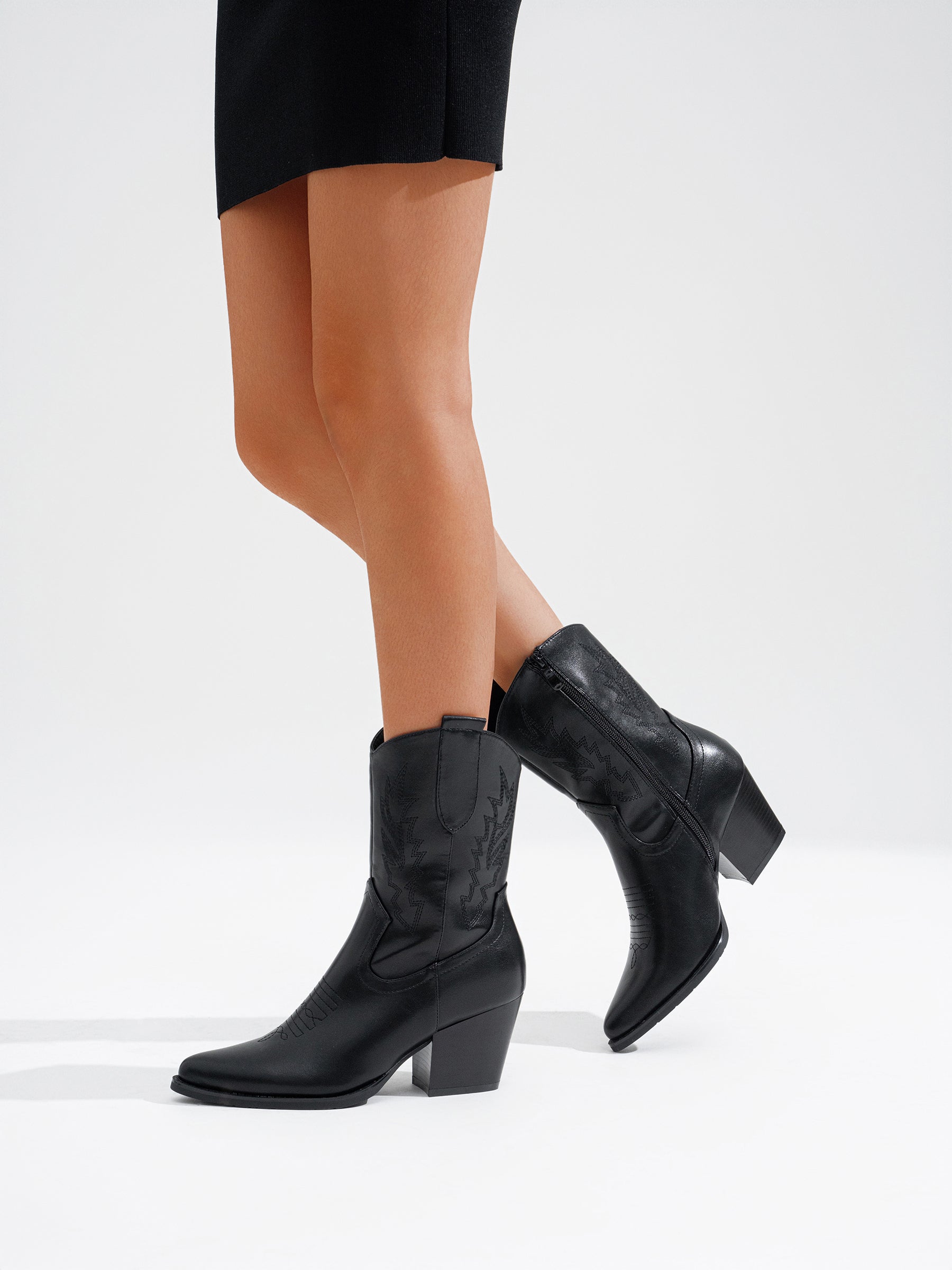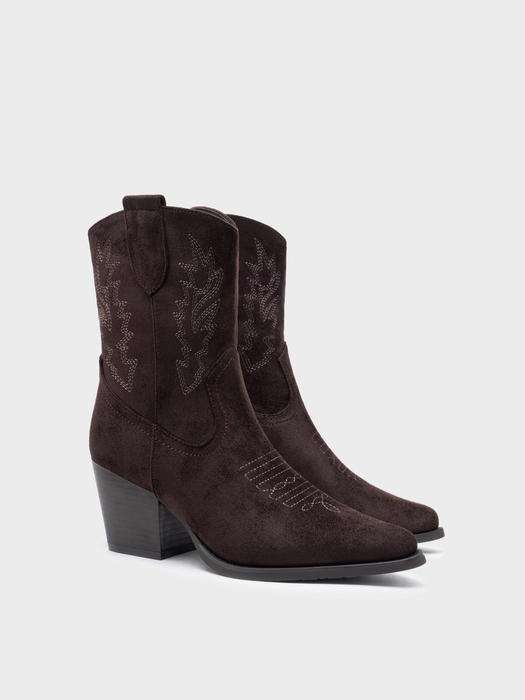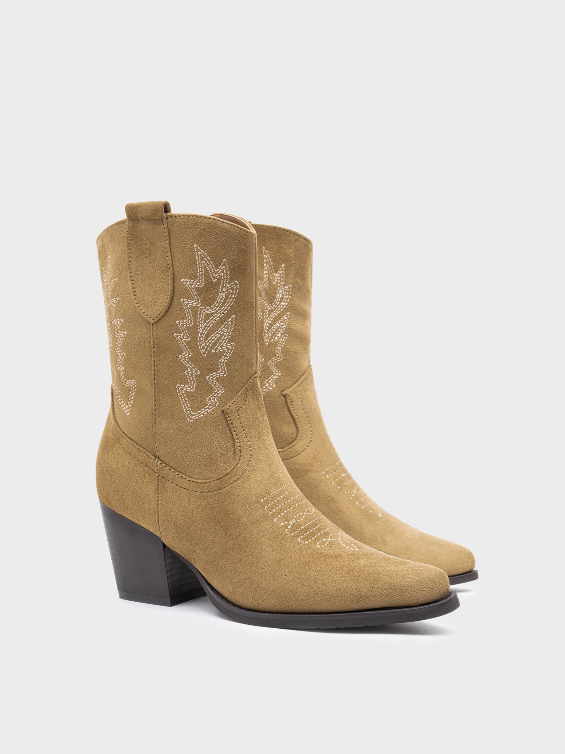 Botines estilo cowboy. Detalle de tiradores en caña y cosido. Se recomienda pedir una talla más. Altura tacón 7 cm.Hecho en P.R.C.