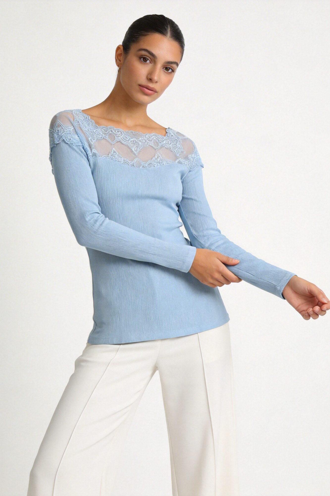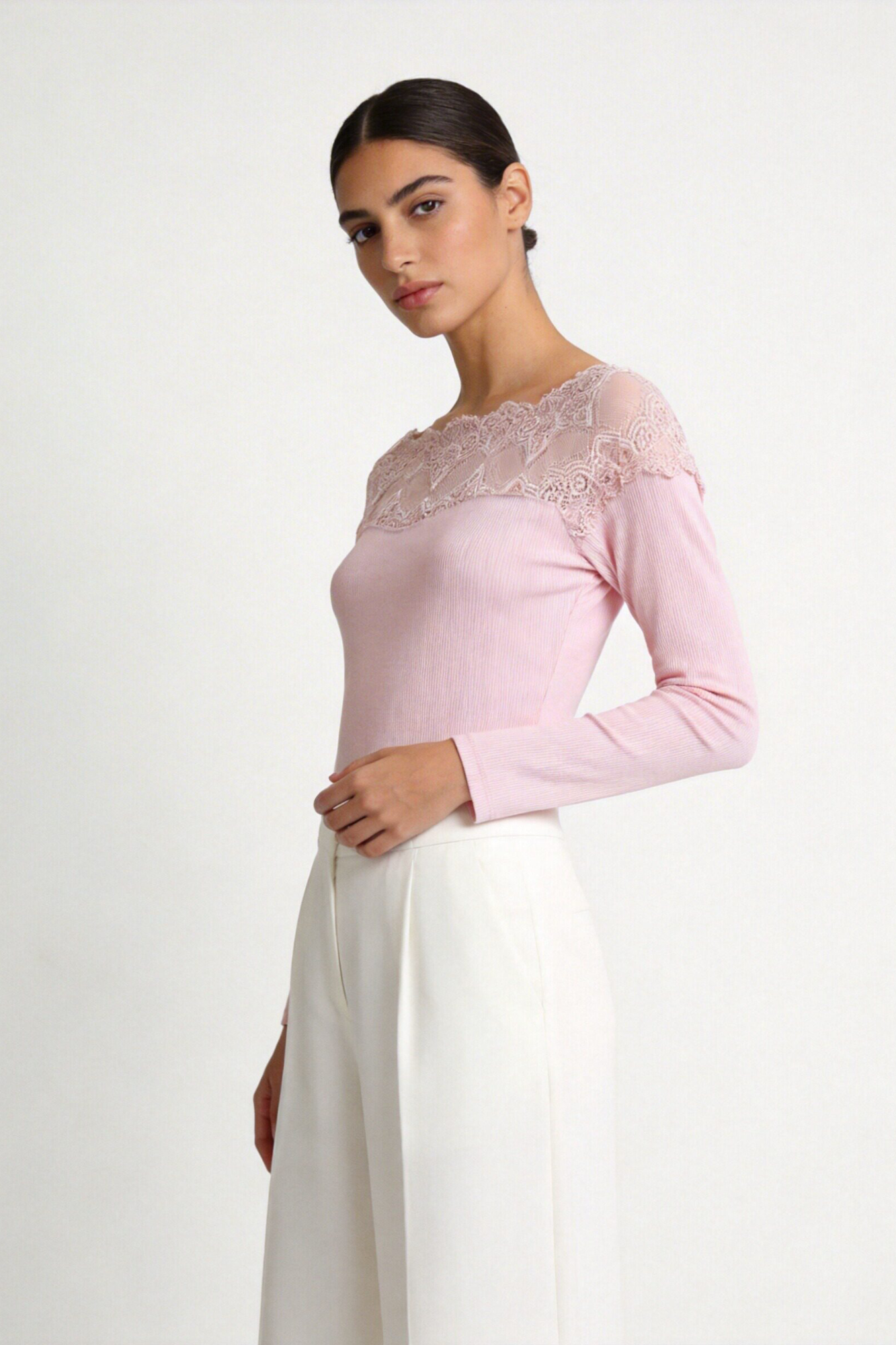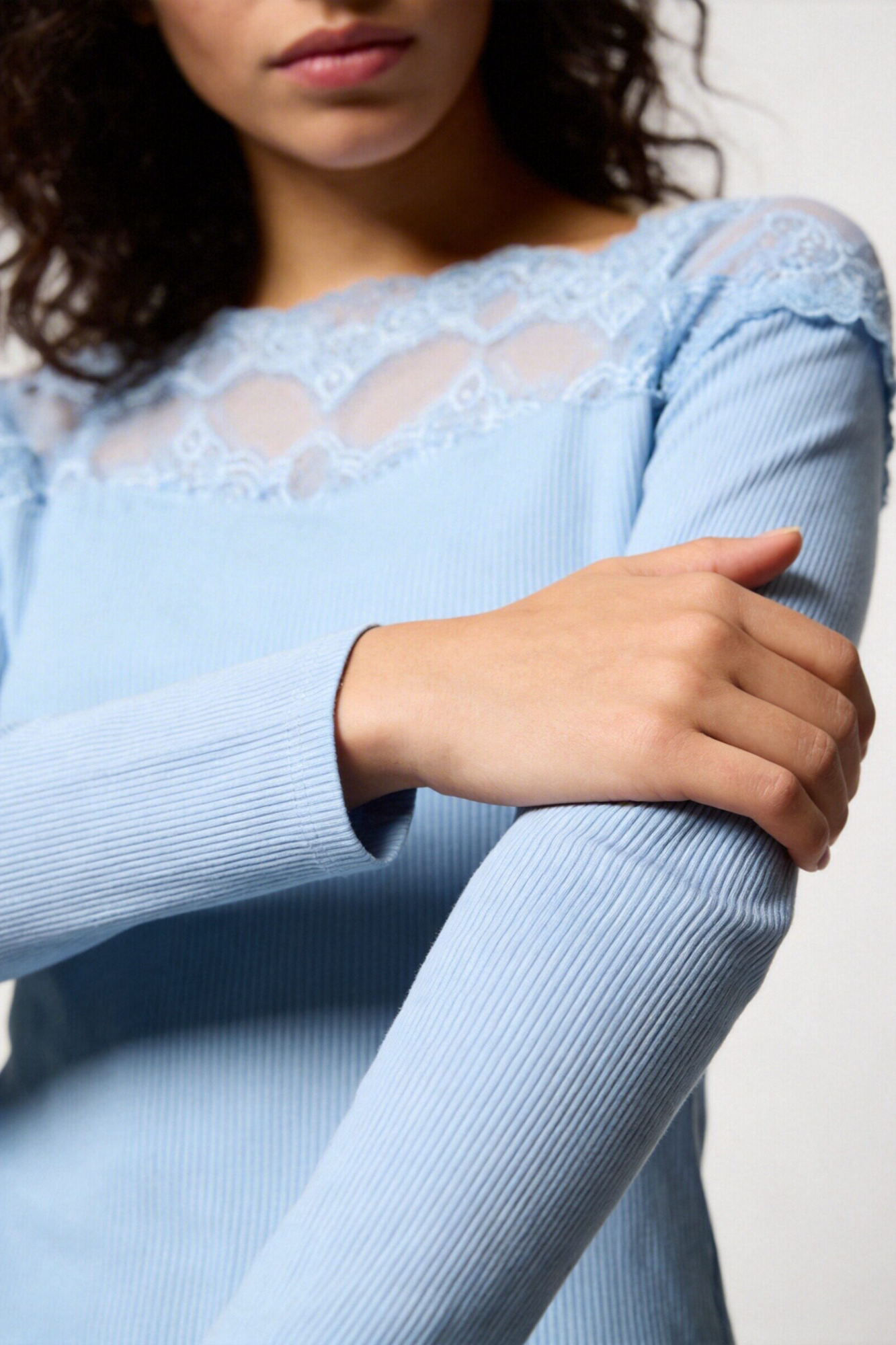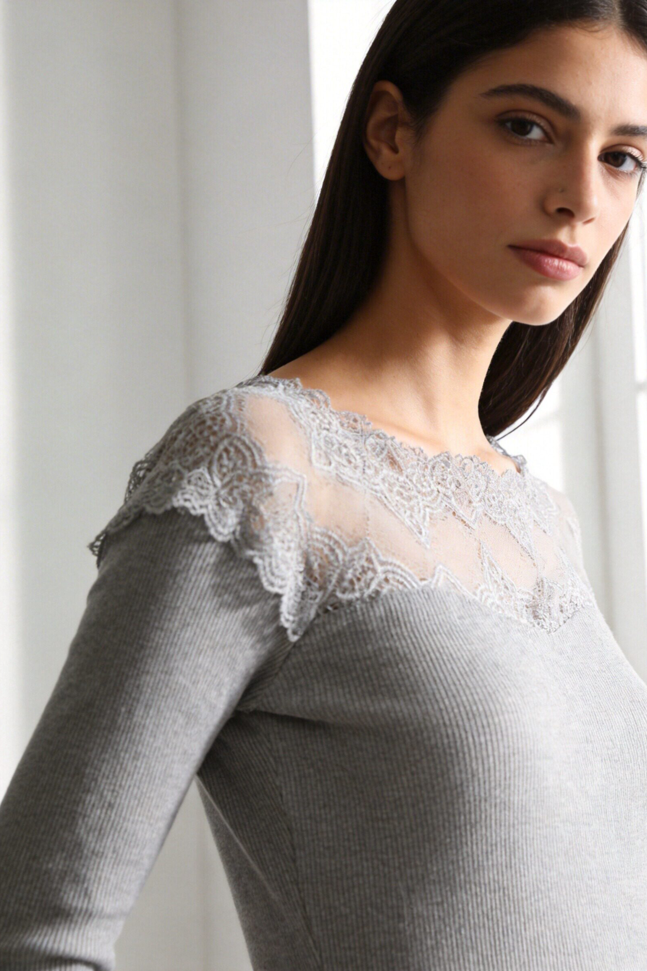 Tejido canalé. Cuello redondo. Manga larga. Encaje combinado. Altura modelo: 180 cm. Talla S.Composición: 95% Viscosa, 5% Elastano Hecho en Italia