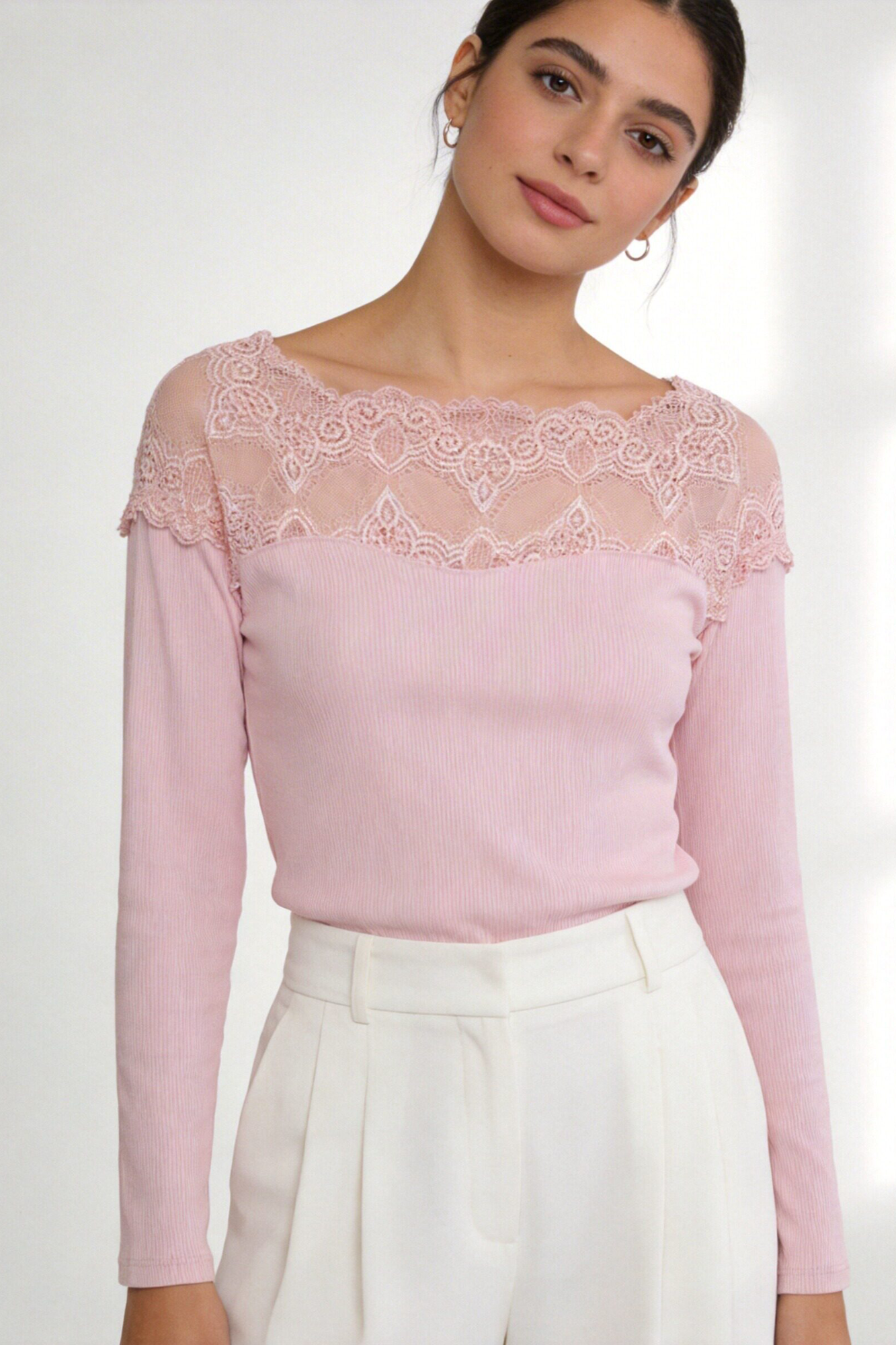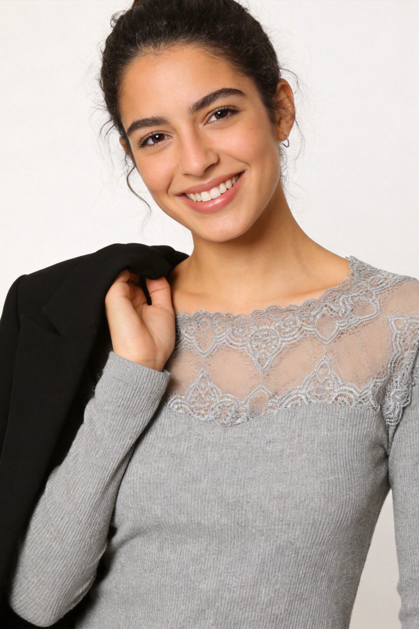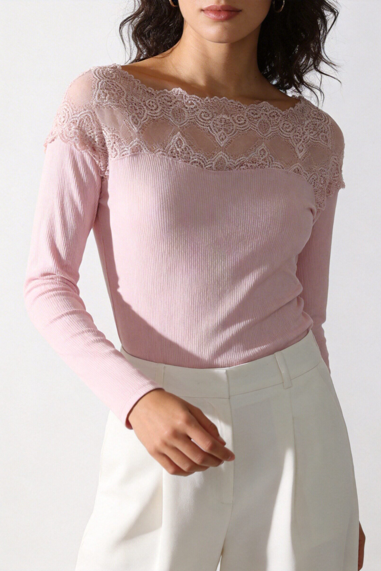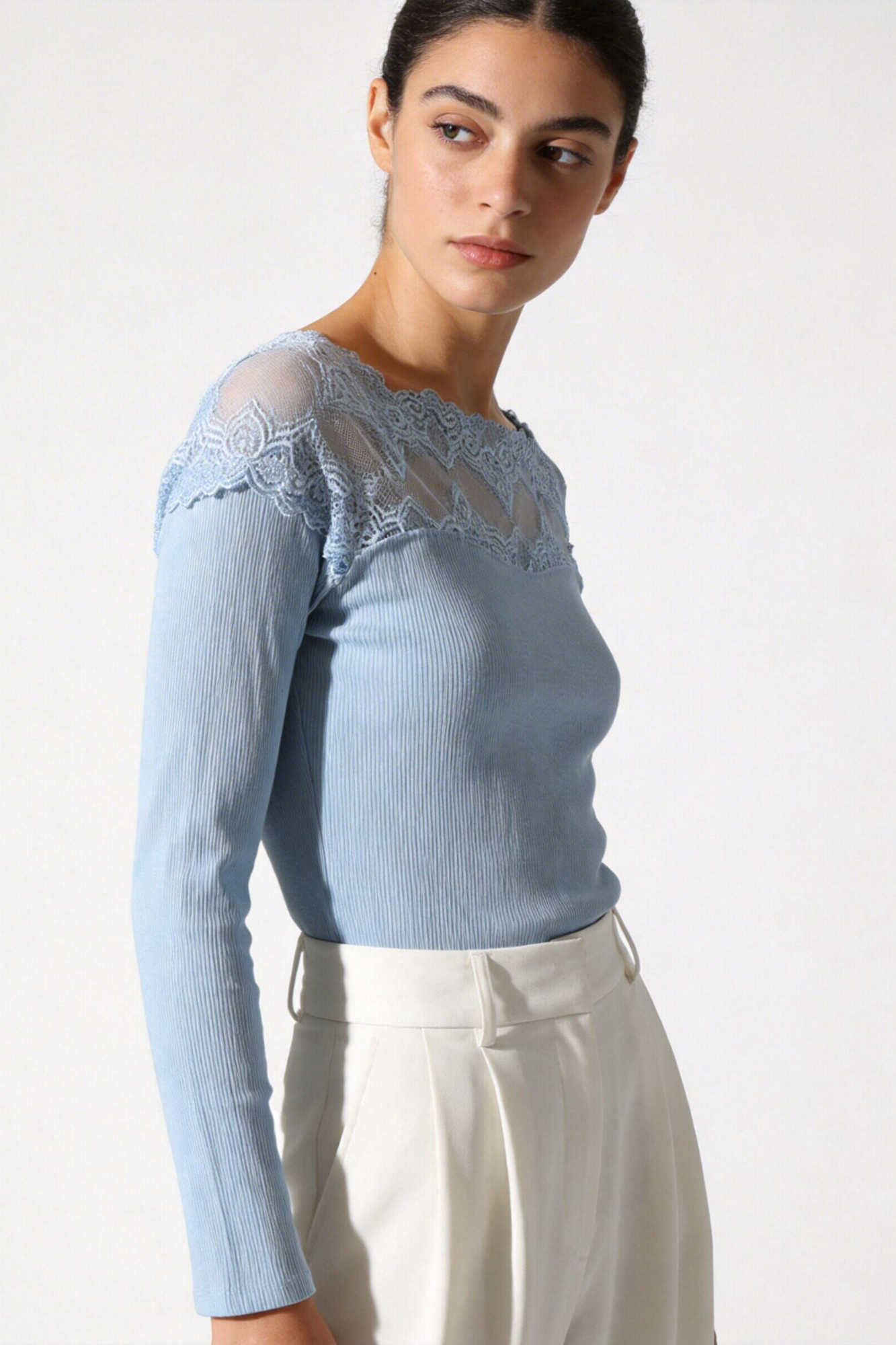 Tejido canalé. Cuello redondo. Manga larga. Encaje combinado. Altura modelo: 180 cm. Talla S.Composición: 95% Viscosa, 5% Elastano Hecho en Italia