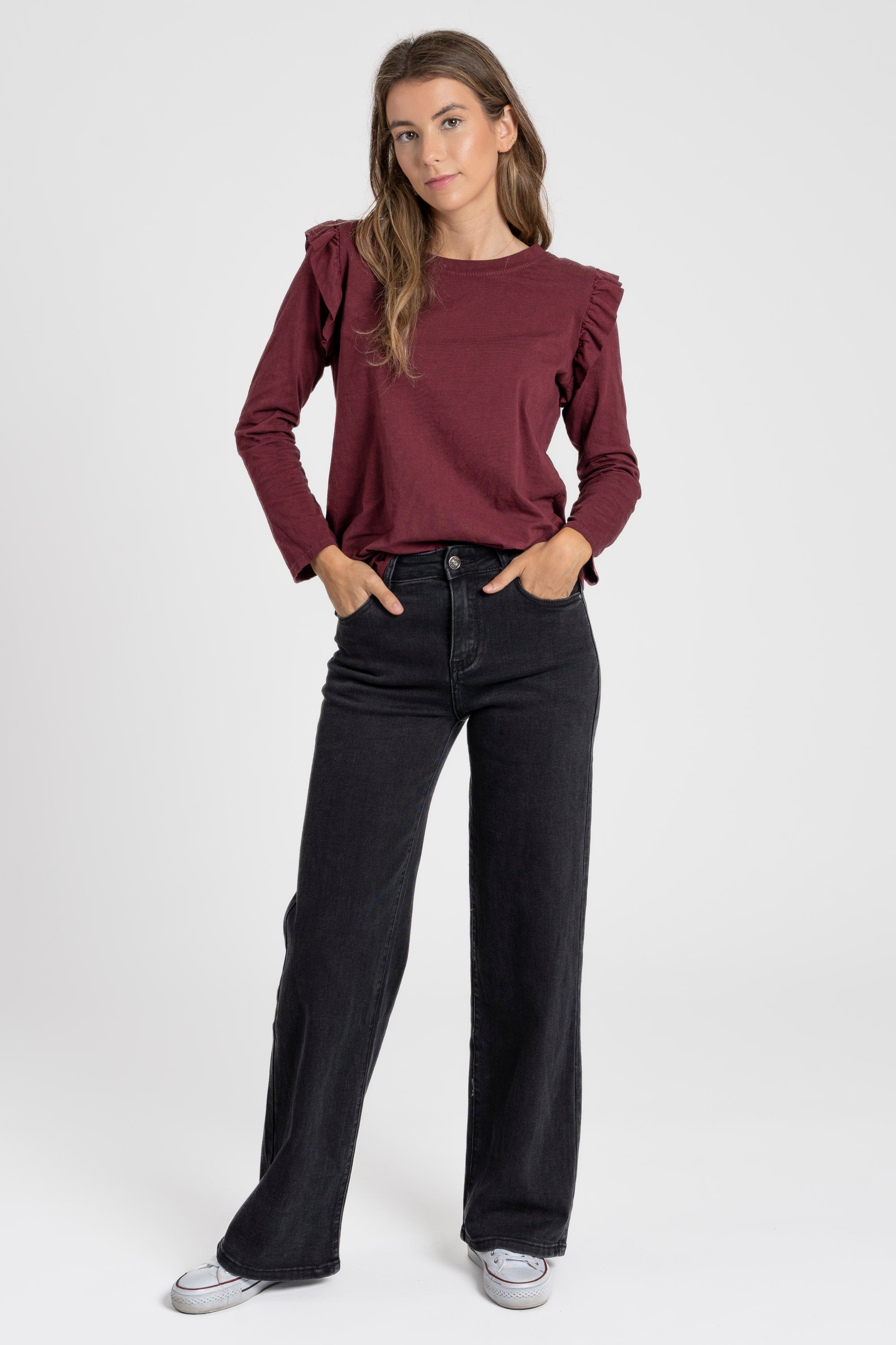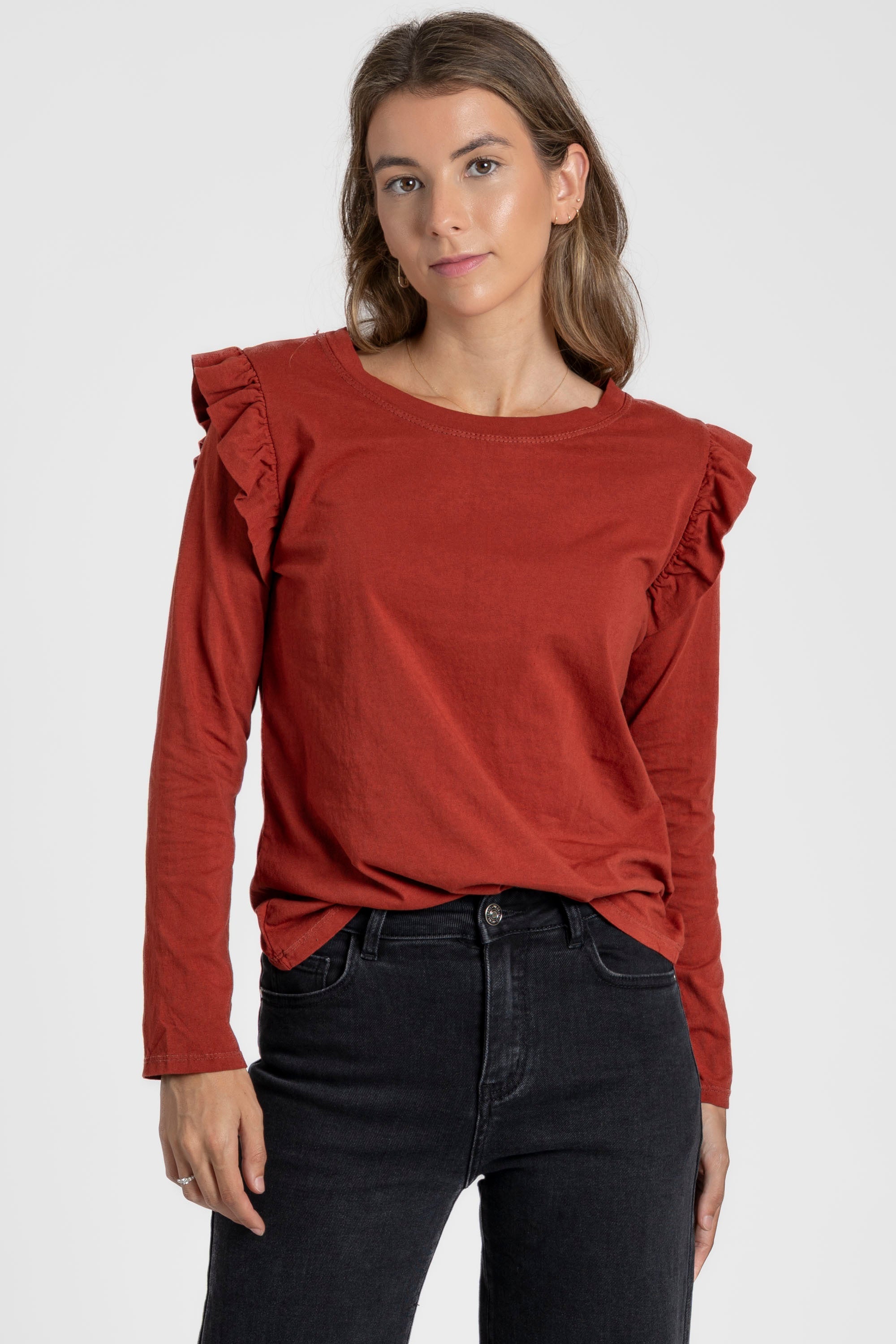 Tejido de algodón. Cuello redondo. Manga larga. Detalle volantes.Composición: 95% Algodón, 5% Elastano Hecho en Italia