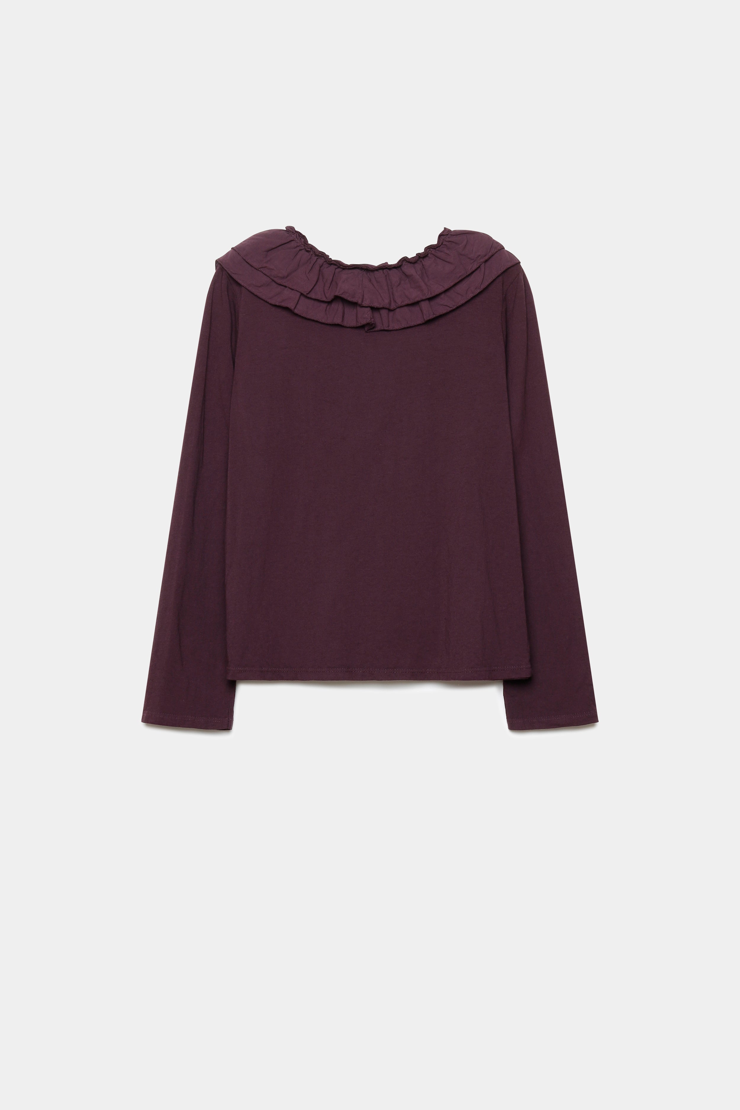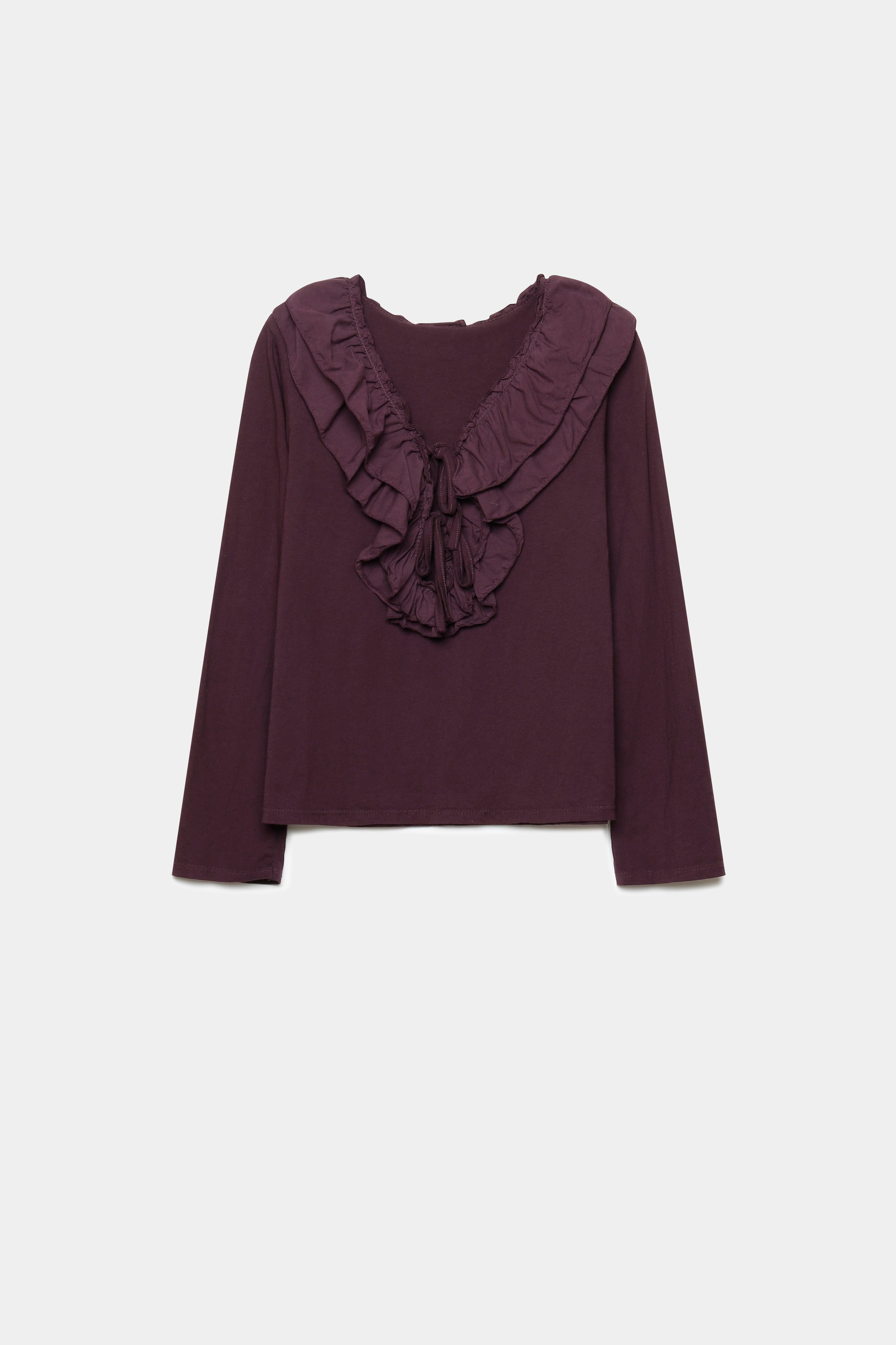 Tejido de algodón. Escote pico. Manga larga. Detalle volantes. Composición: 95% Algodón, 5% Elastano Hecho en Italia