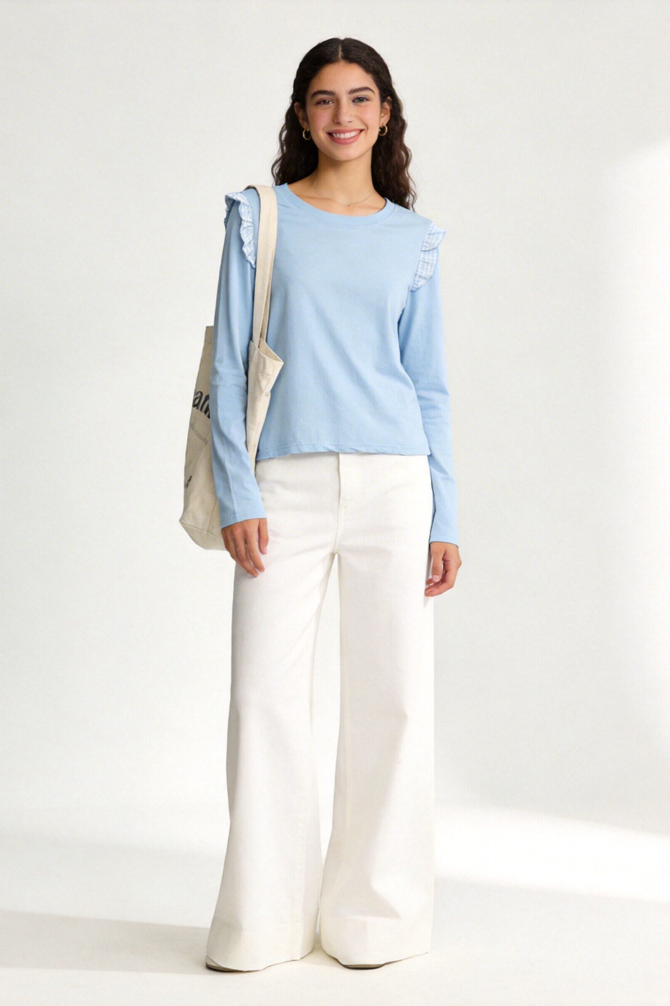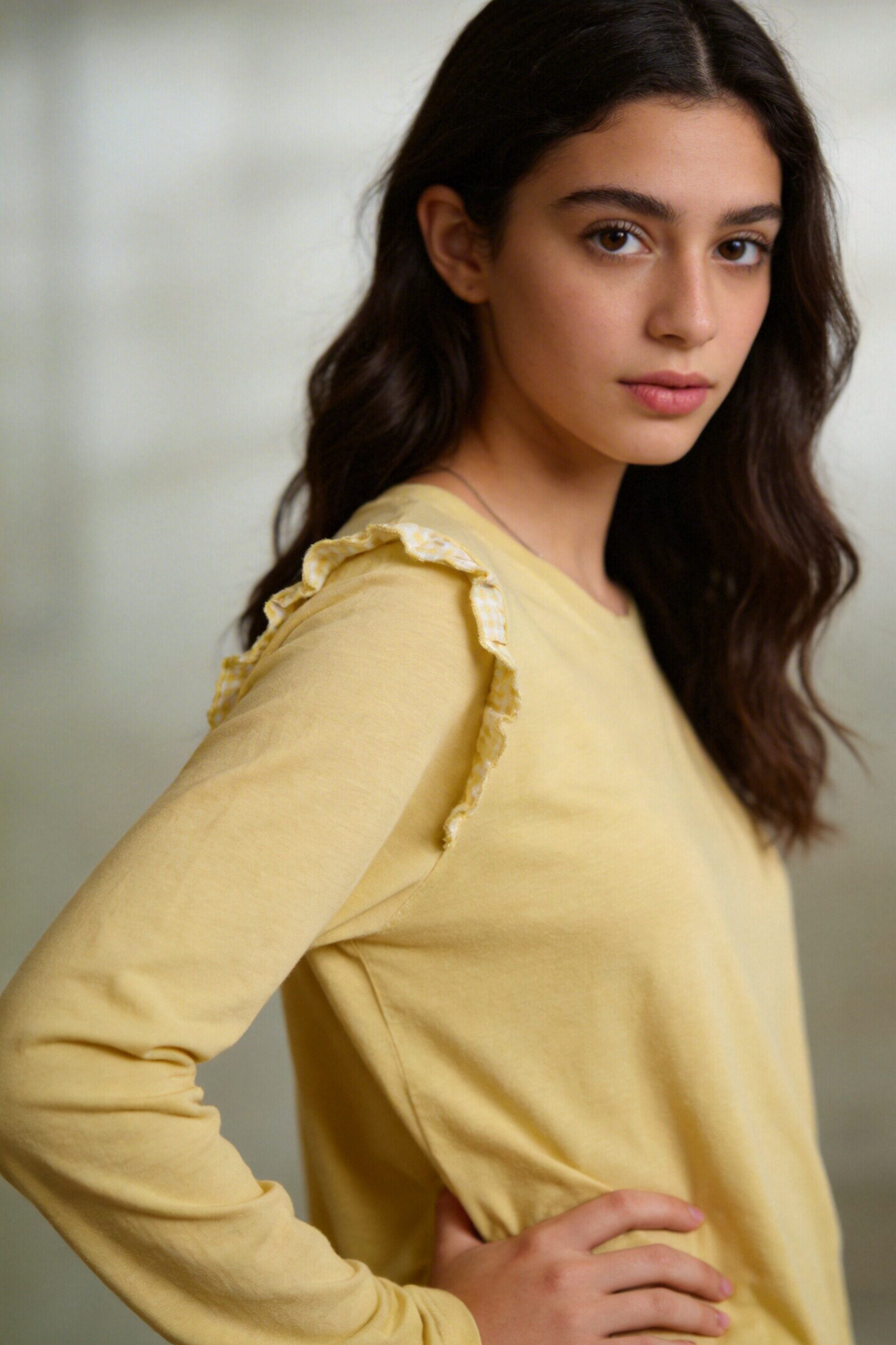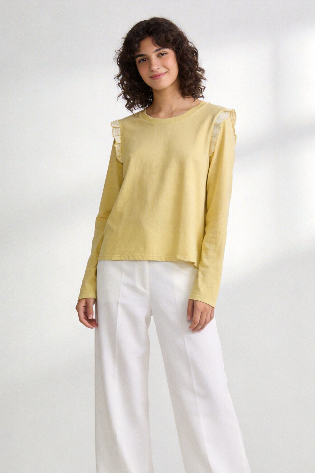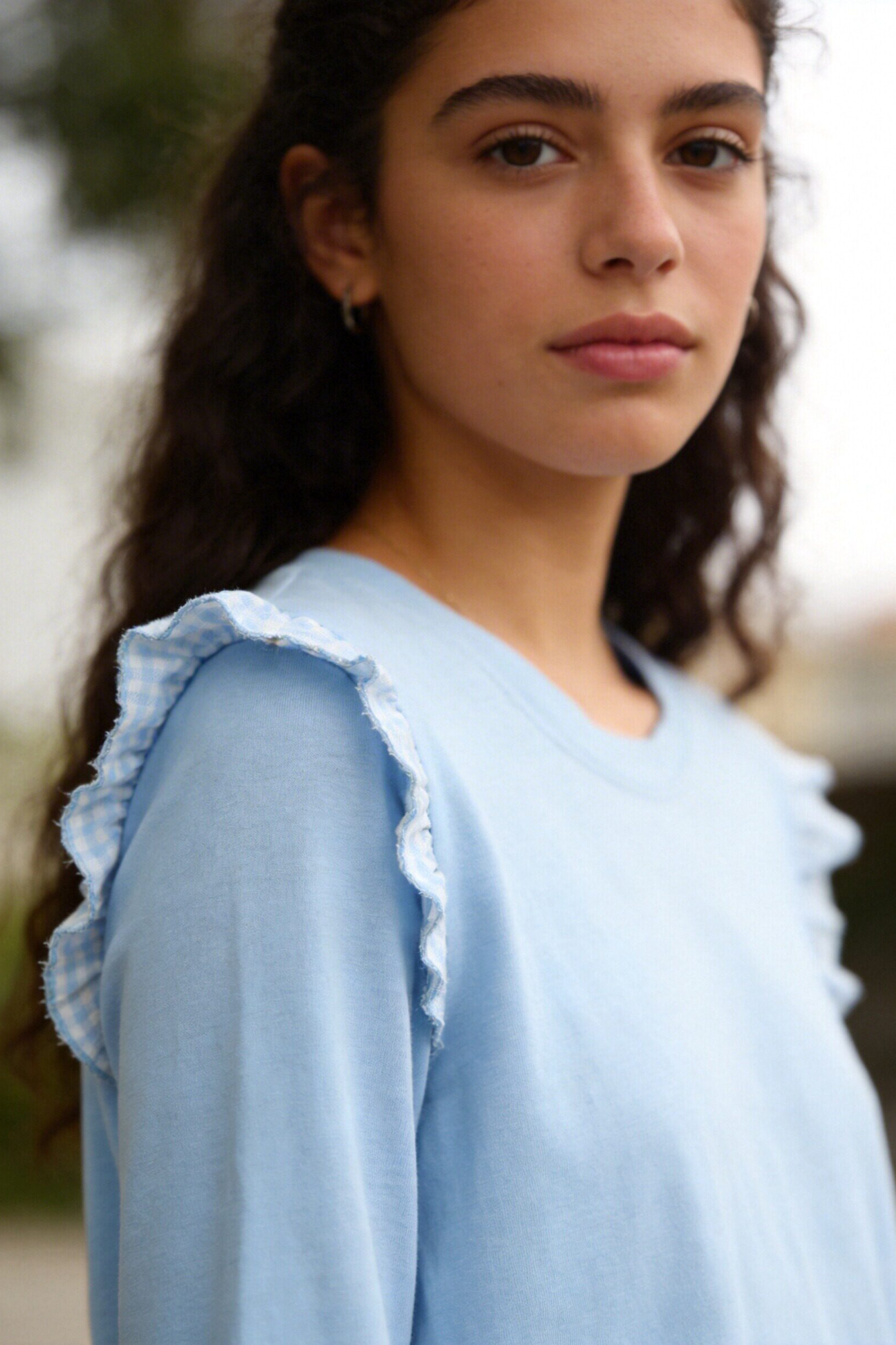 Tejido mezcla de algodón. Cuello redondo. Manga larga. Detalle volantes cuadros.Composición: 95% Algodón, 5% ElastanoHecho en Italia