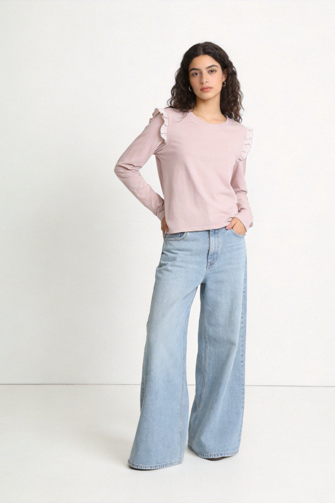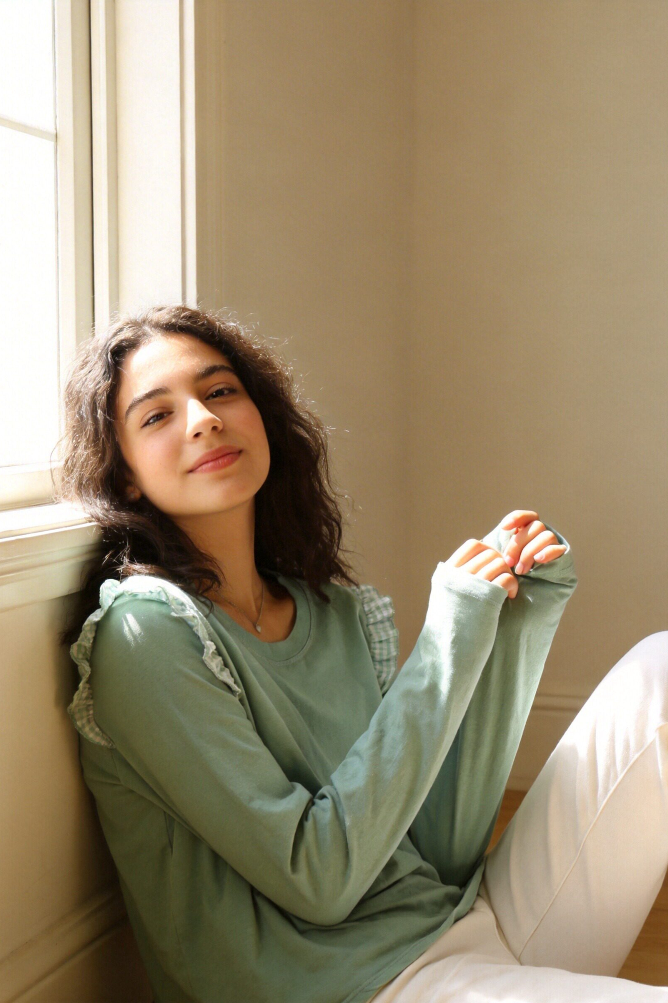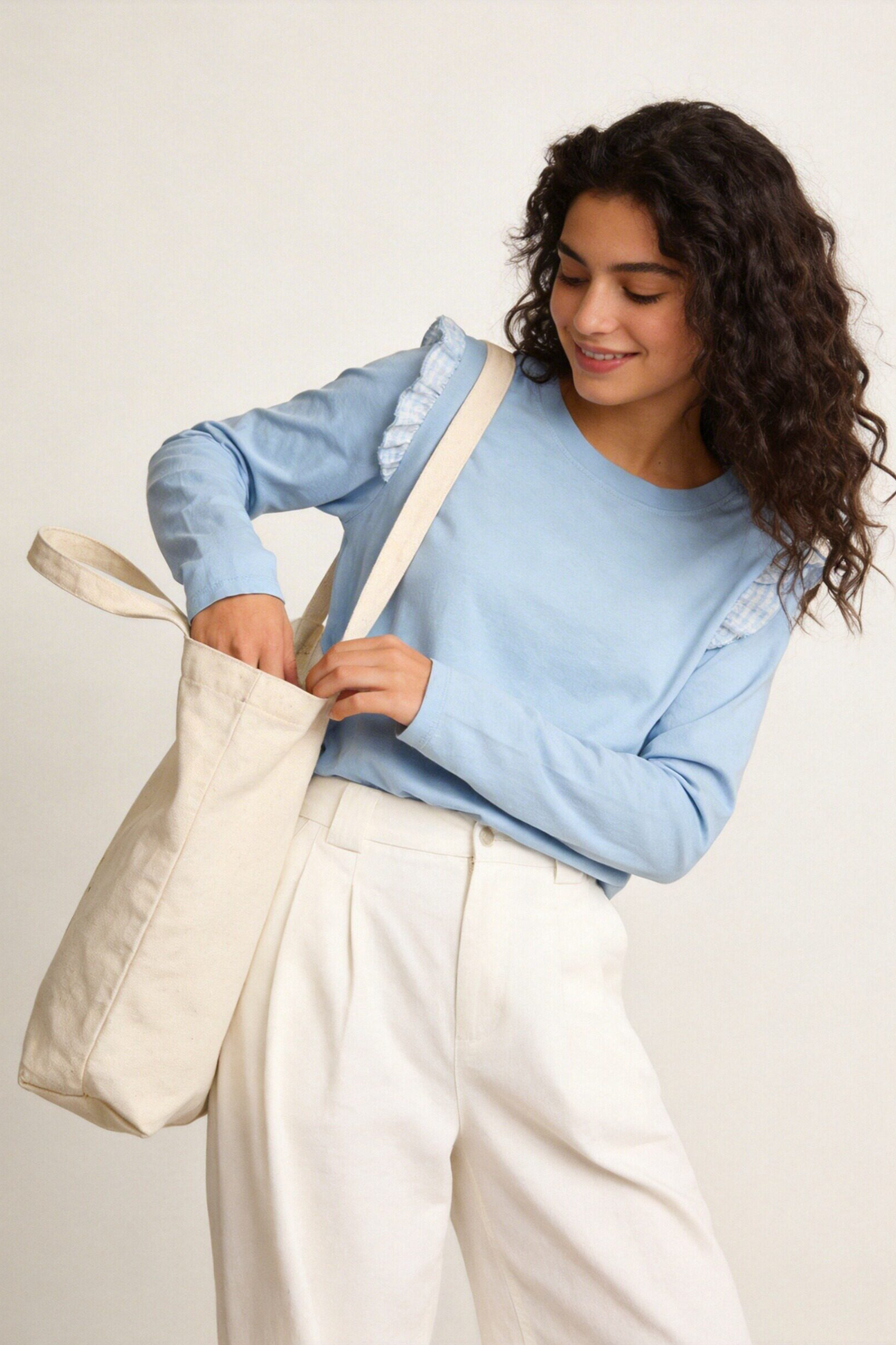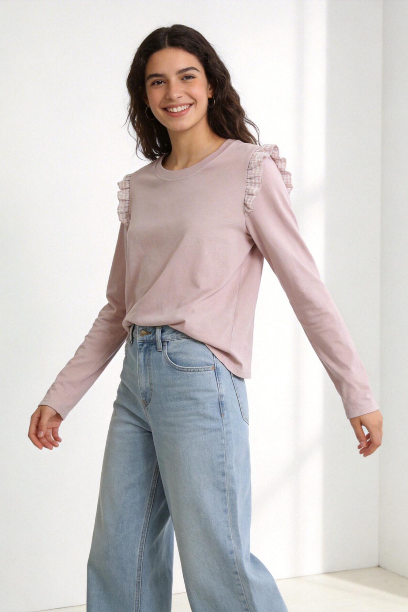 Tejido mezcla de algodón. Cuello redondo. Manga larga. Detalle volantes cuadros.Composición: 95% Algodón, 5% ElastanoHecho en Italia