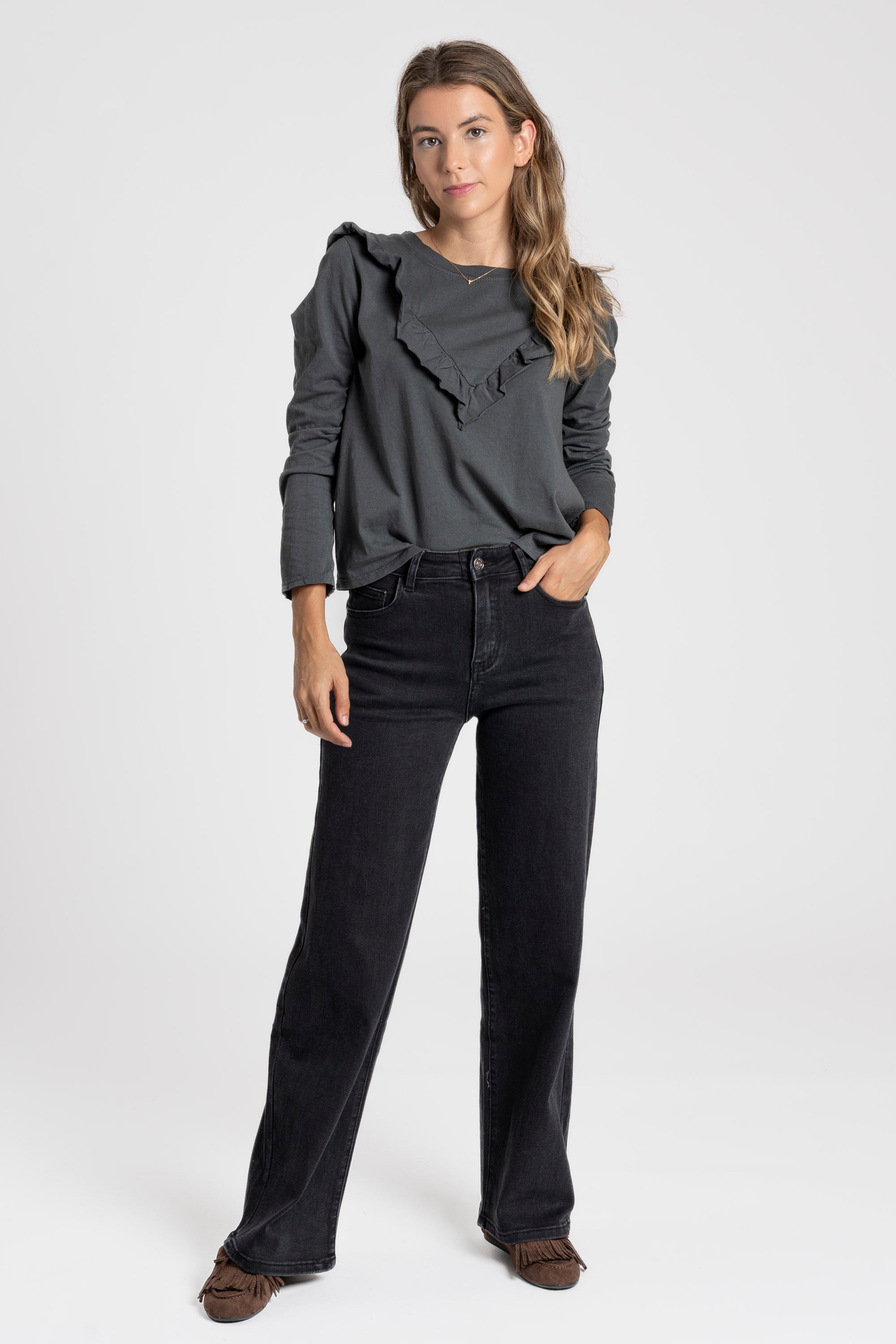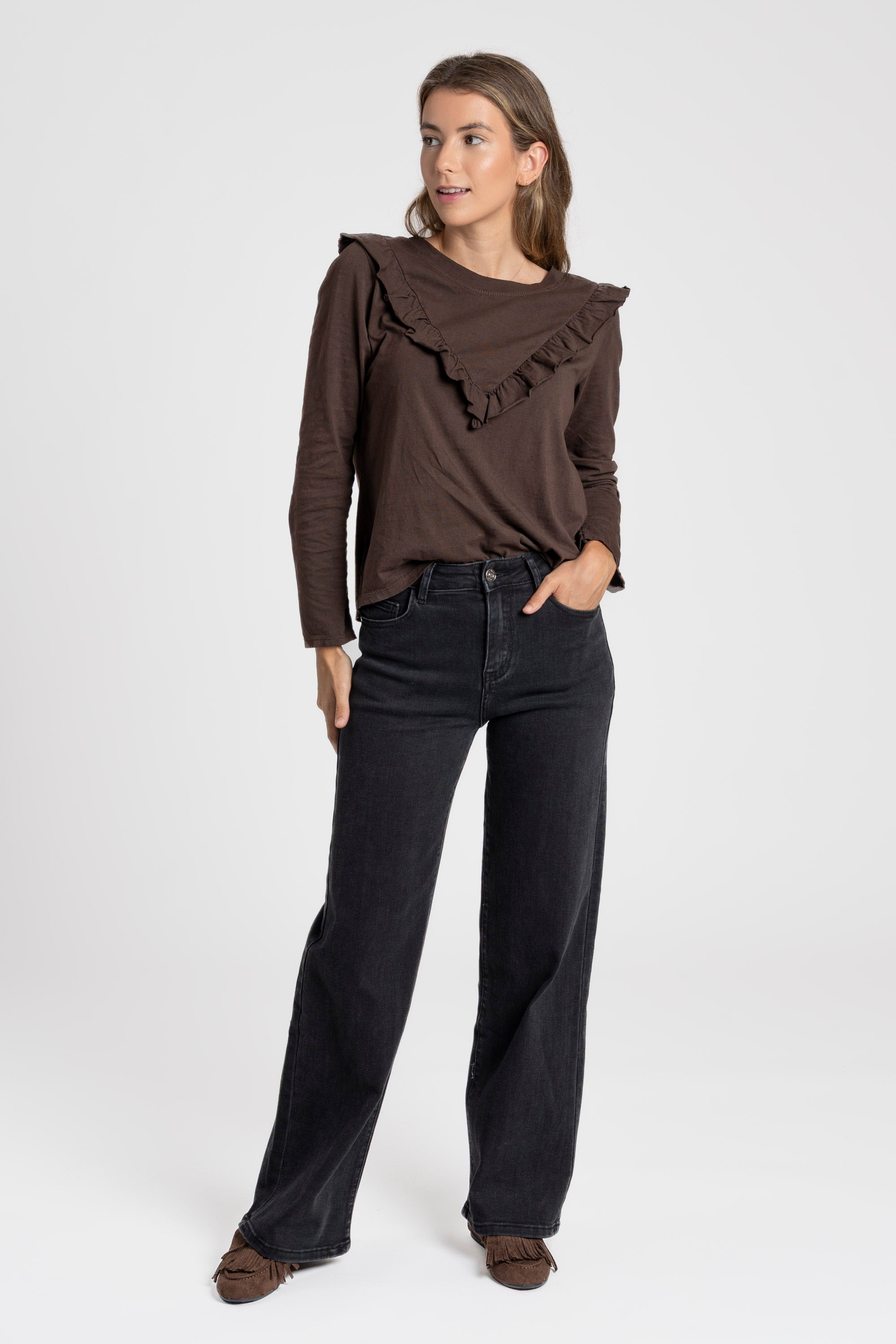Tejido de algodón. Cuello redondo. Detalle volantes. Manga larga.Composición: 95% Algodón, 5% ElastanoHecho en Italia