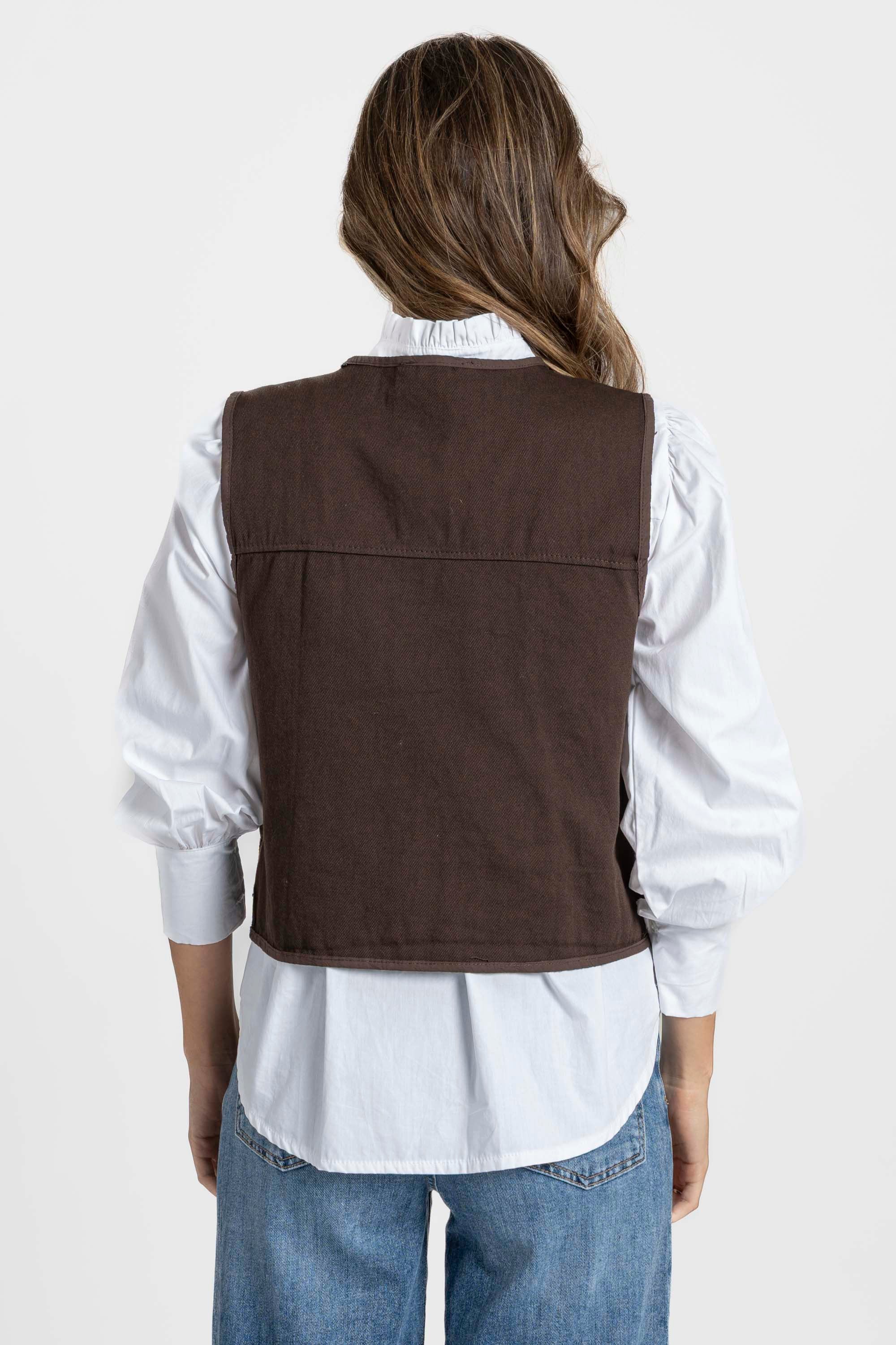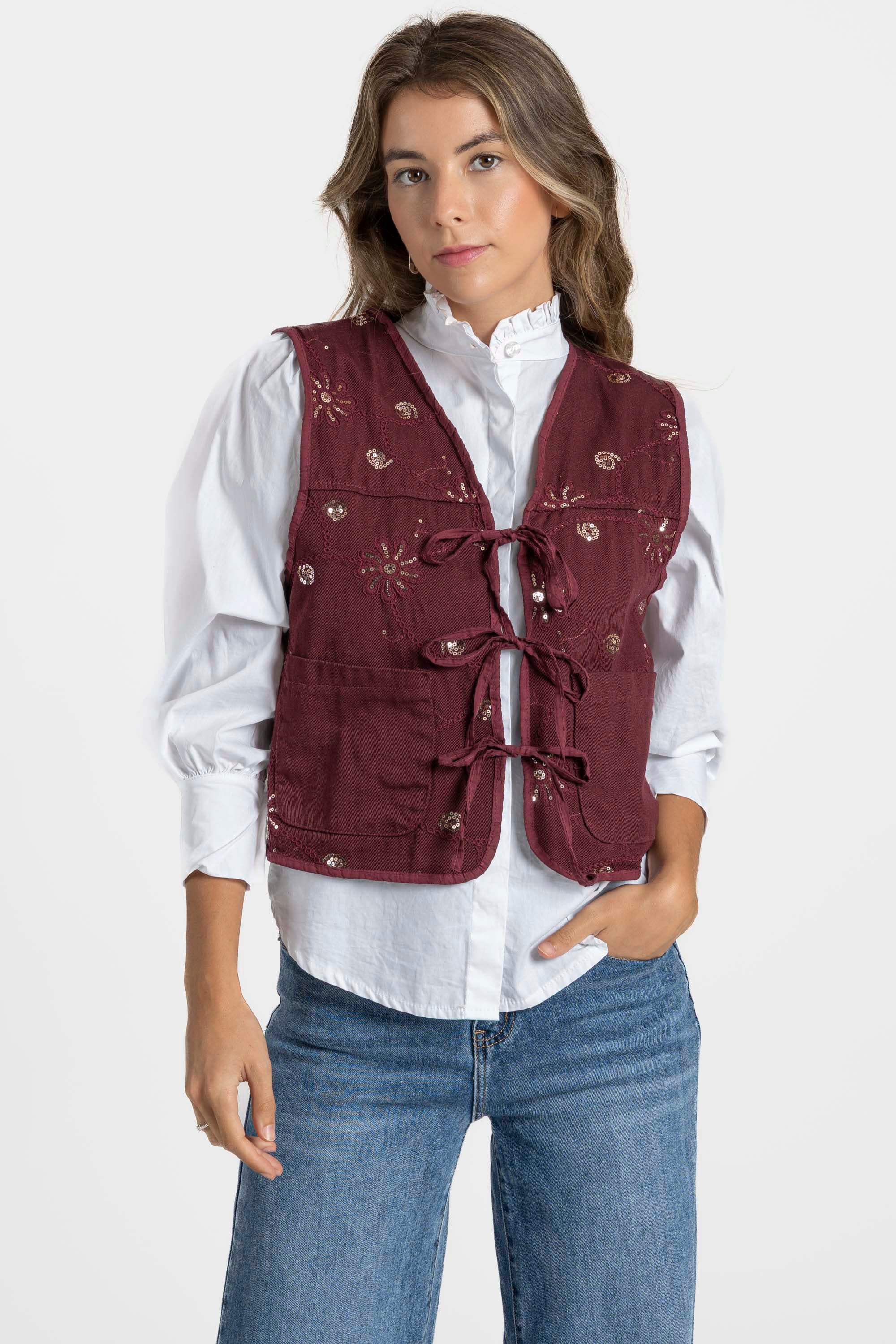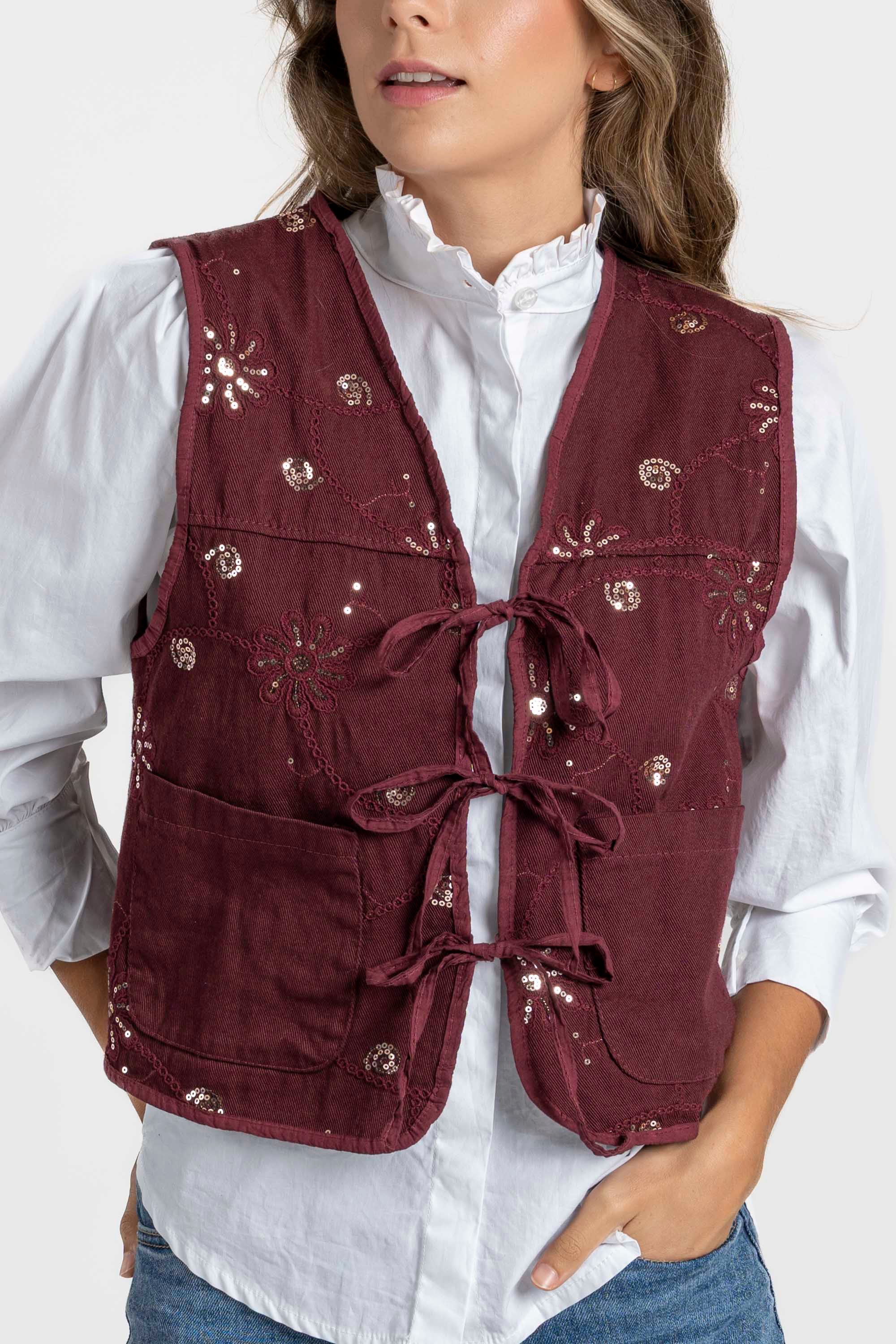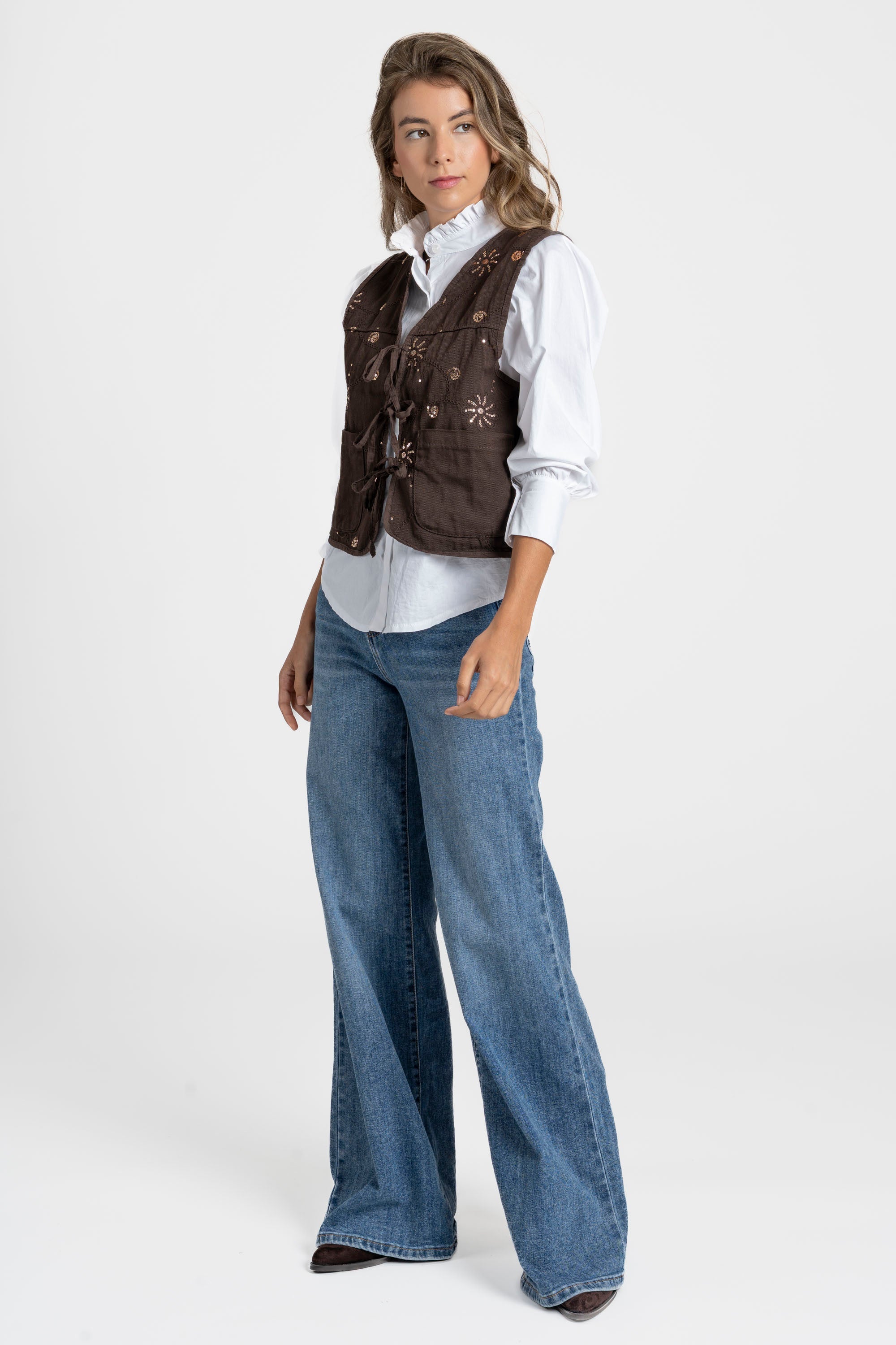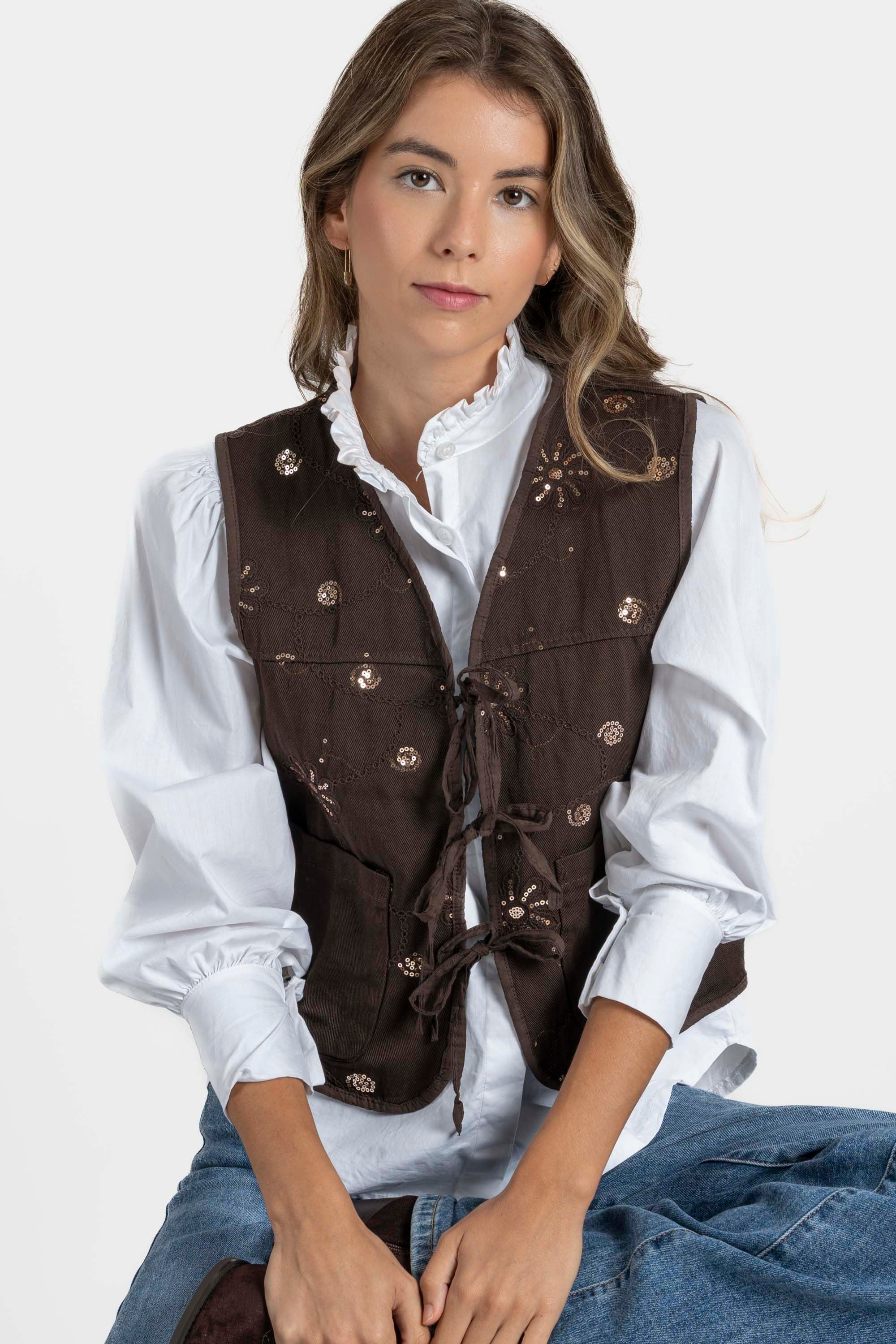 Tejido mezcla de algodón. Escote pico. Manga sisa. Cierre con lazos. Bolsillos delanteros. Composición: 95% Algodón, 5% Elastano Hecho en Italia