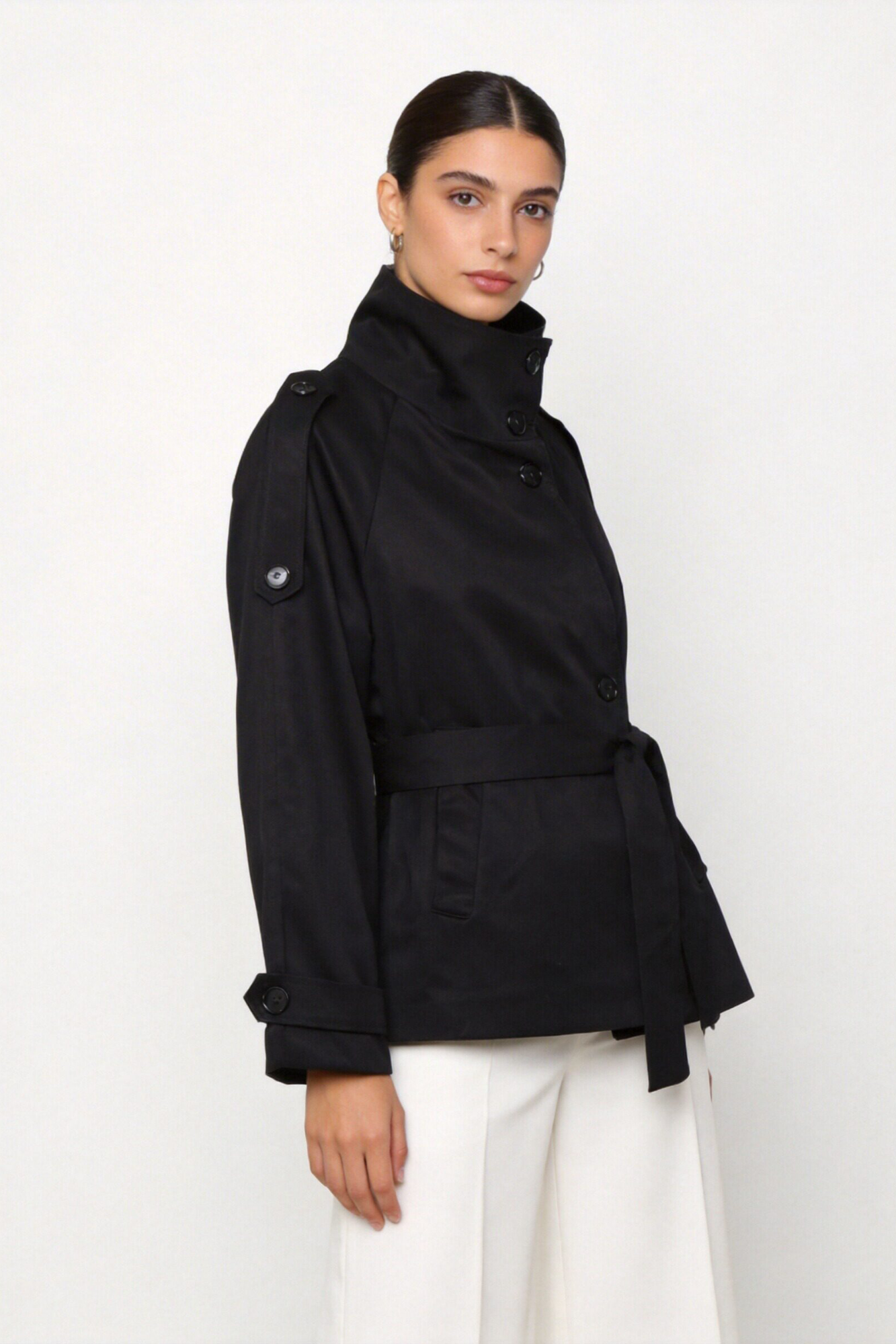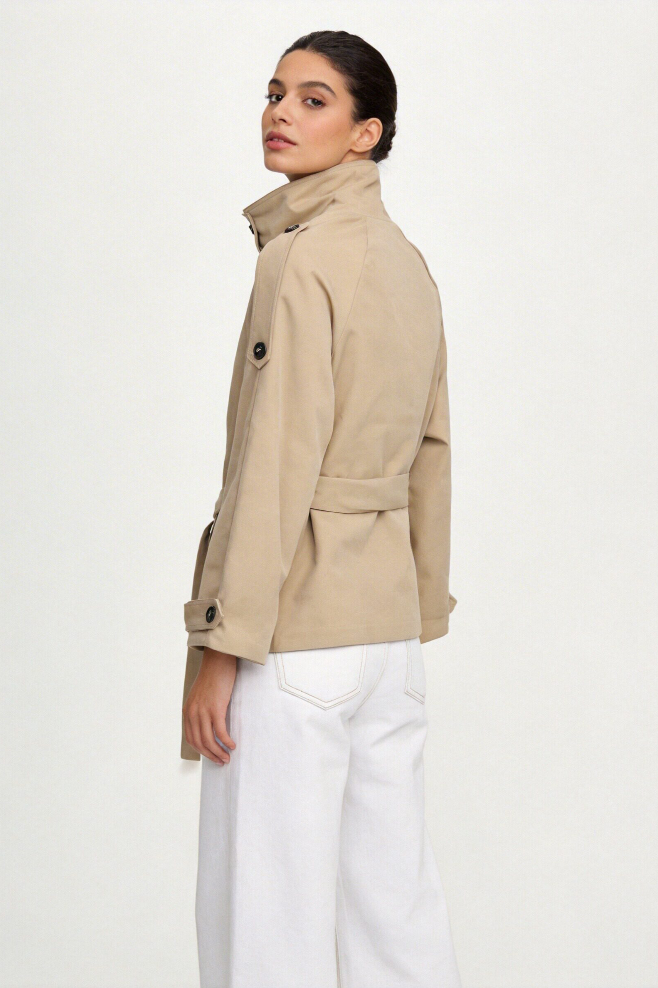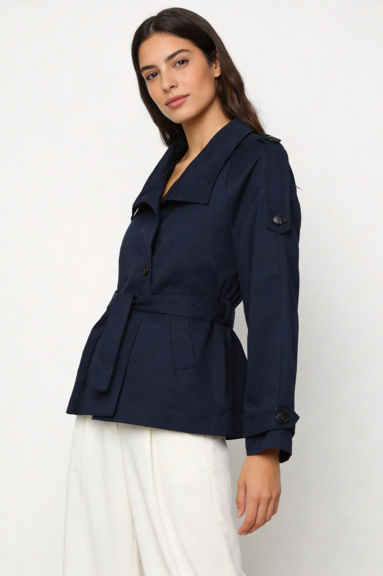 Tejido estilo garbadina. Cuello subido. Manga larga. Cierre con botones. Cinturón combinado de mismo tejido. Bolsillos laterales. Interior forrado. Composición: 100%...