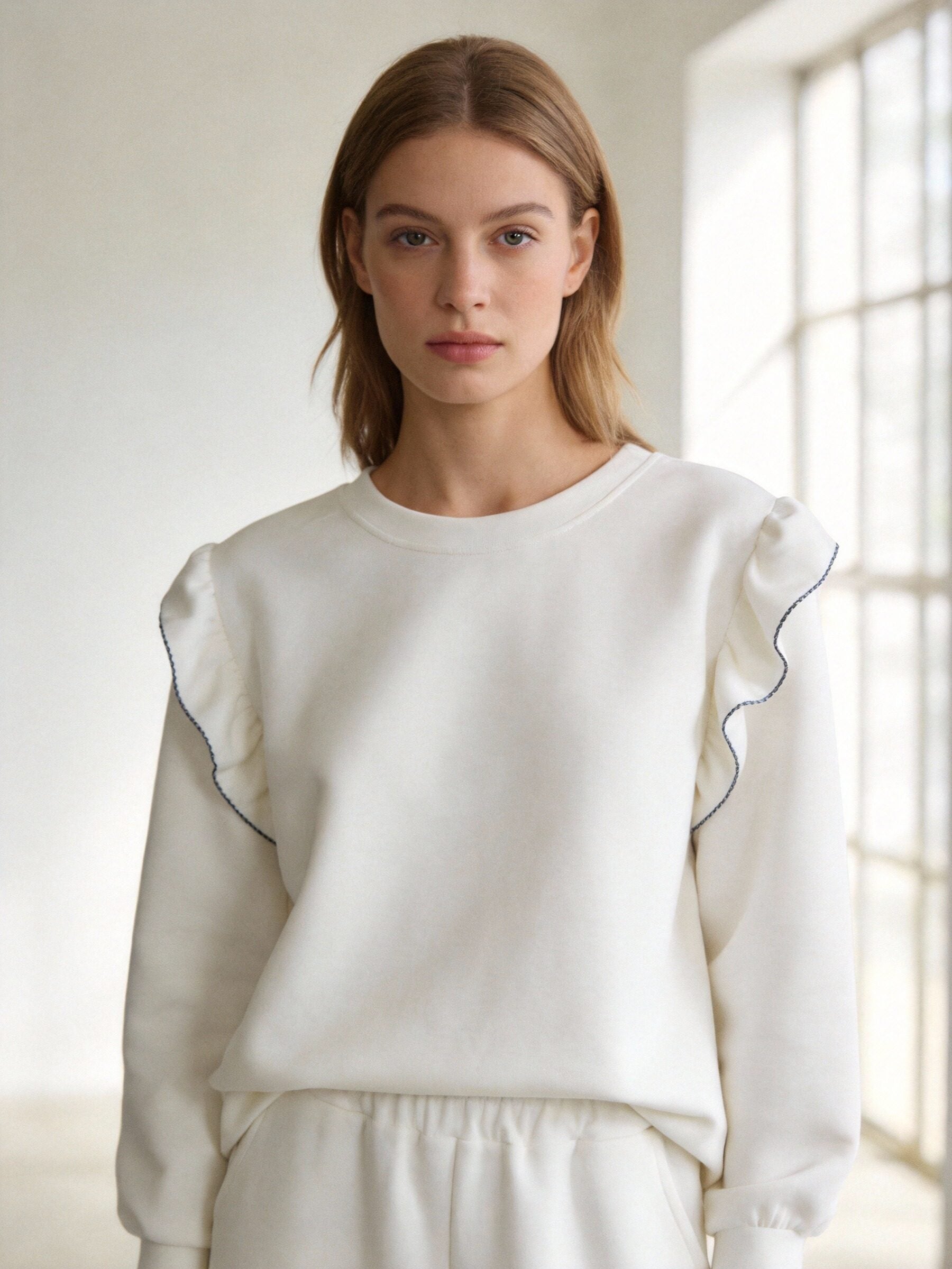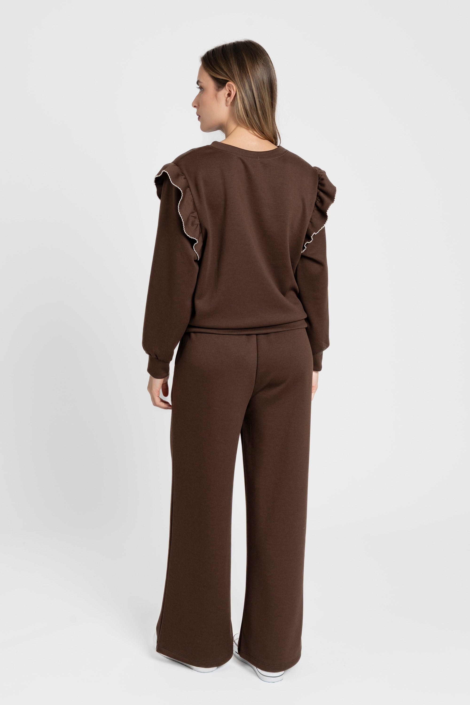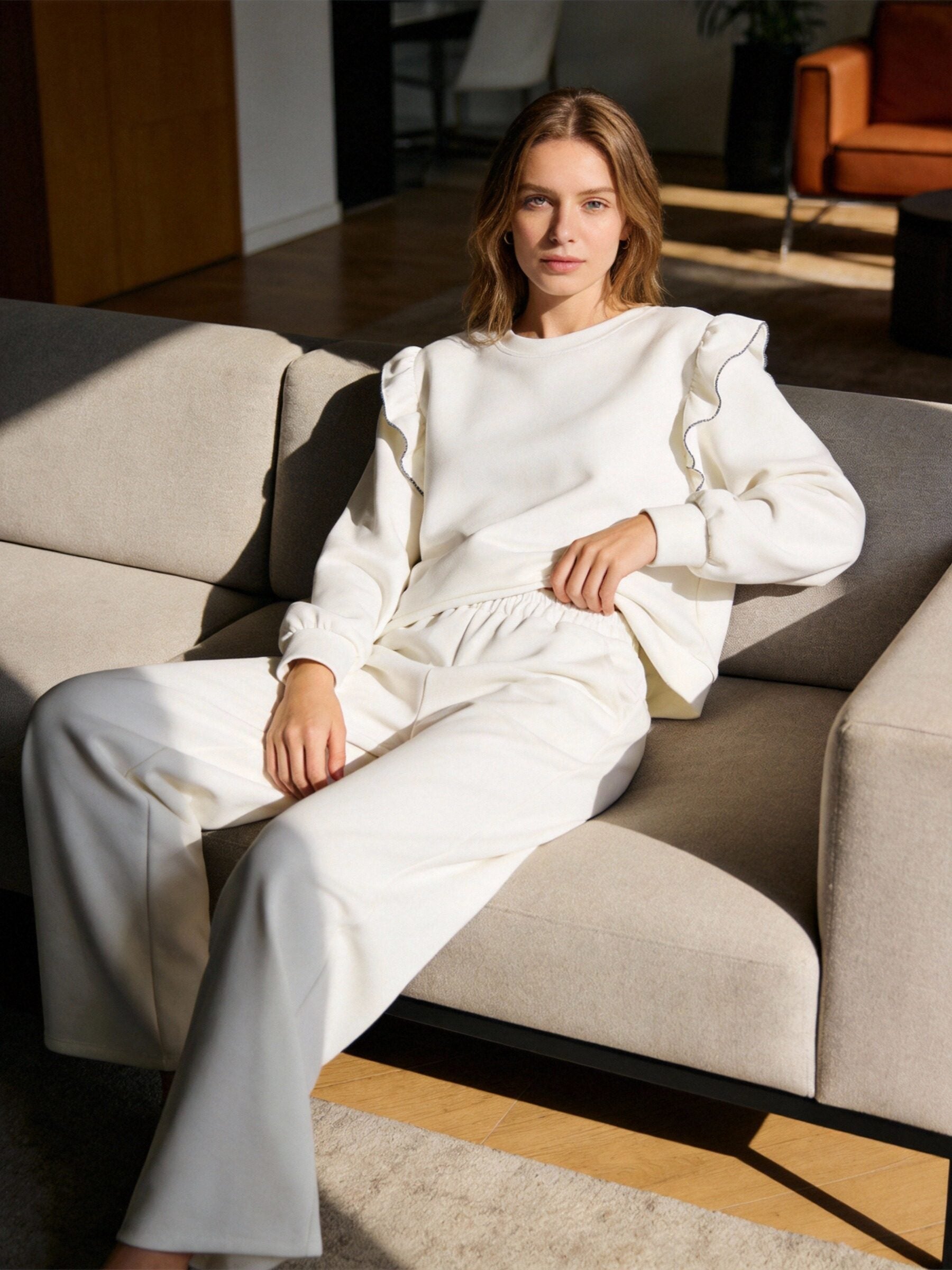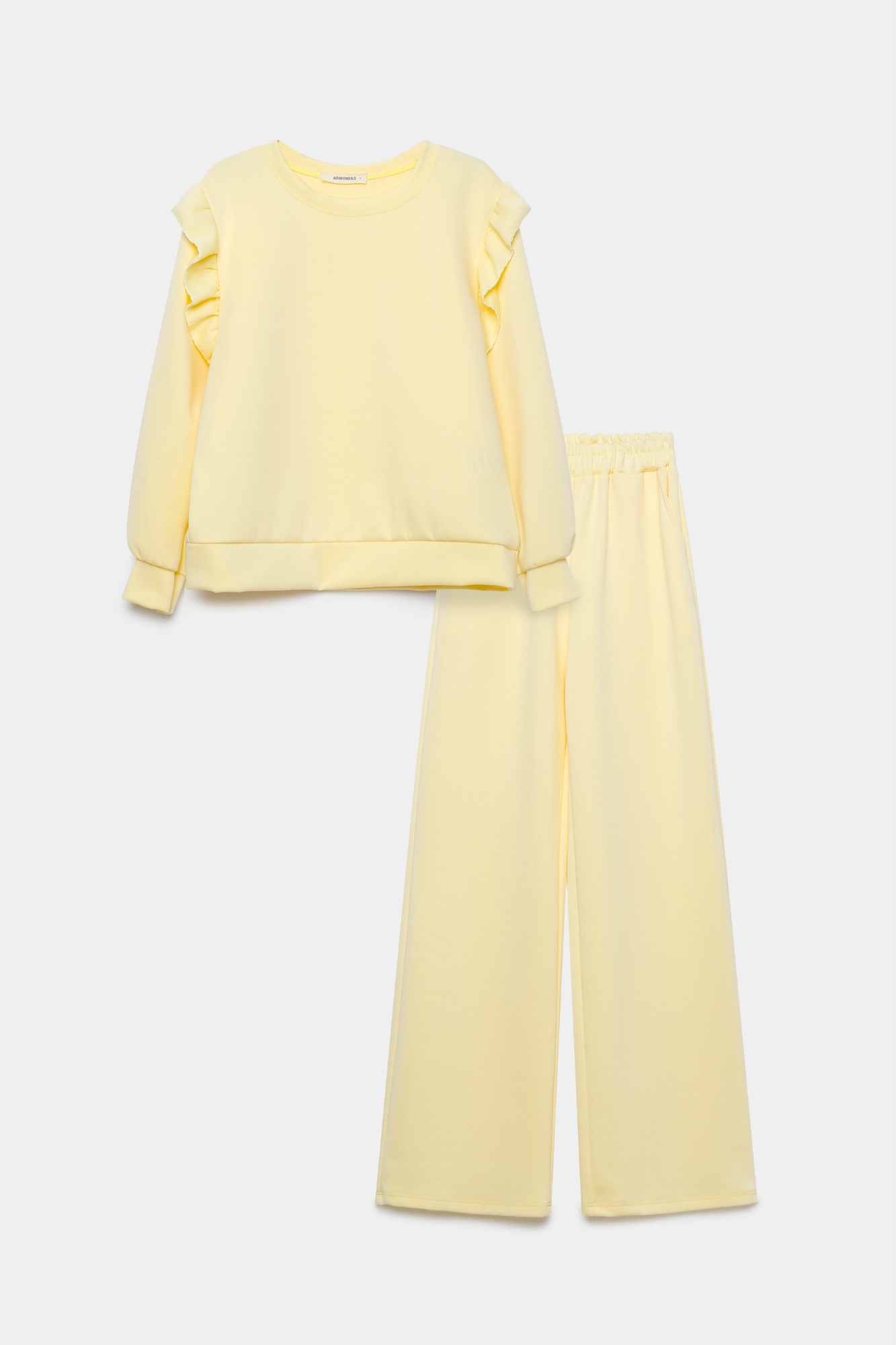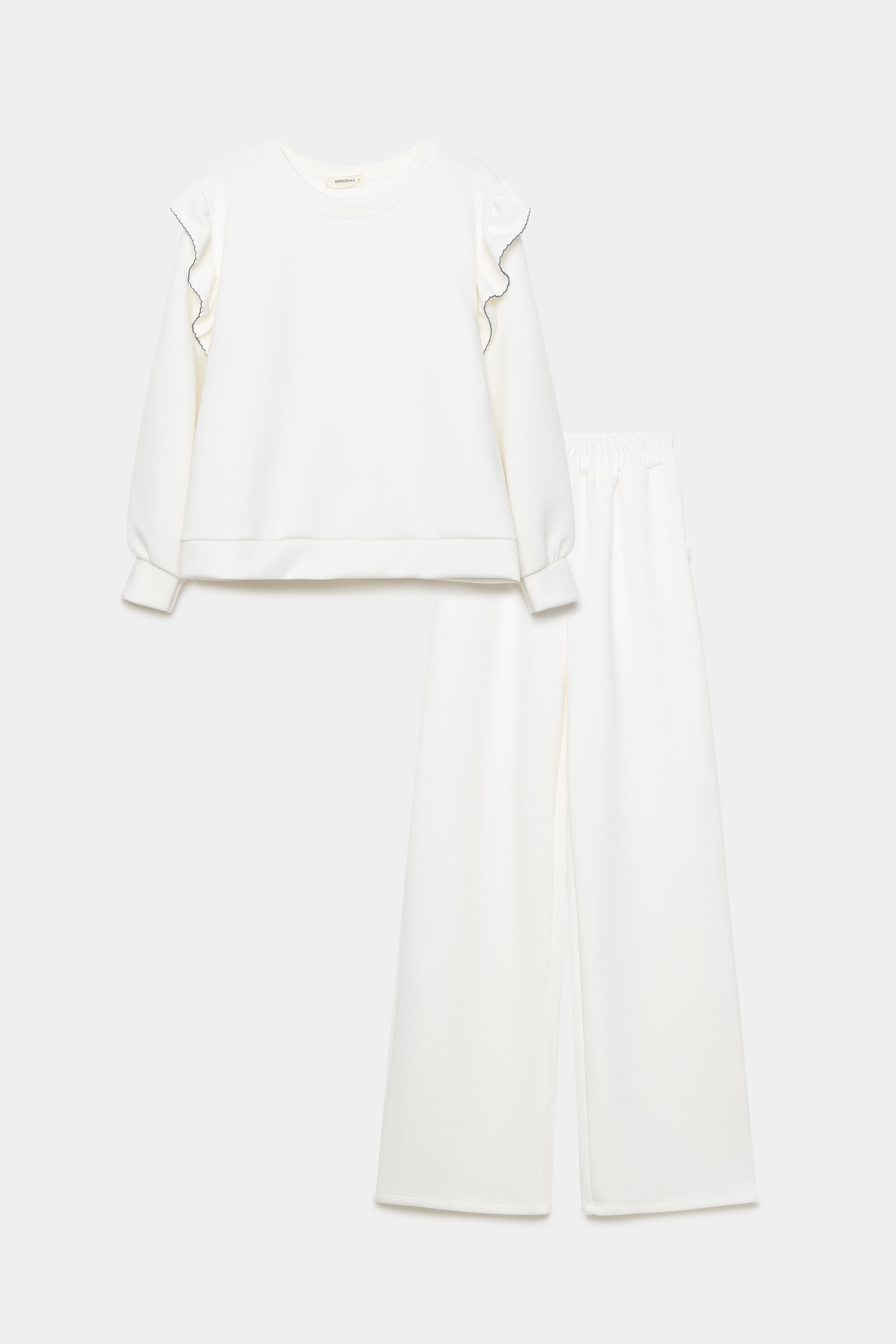 Conjunto de dos piezas. Sudadera de cuello redondo. Manga larga. Detalle de volantes bordados. Pantalón de tiro medio. Cintura elástica....
