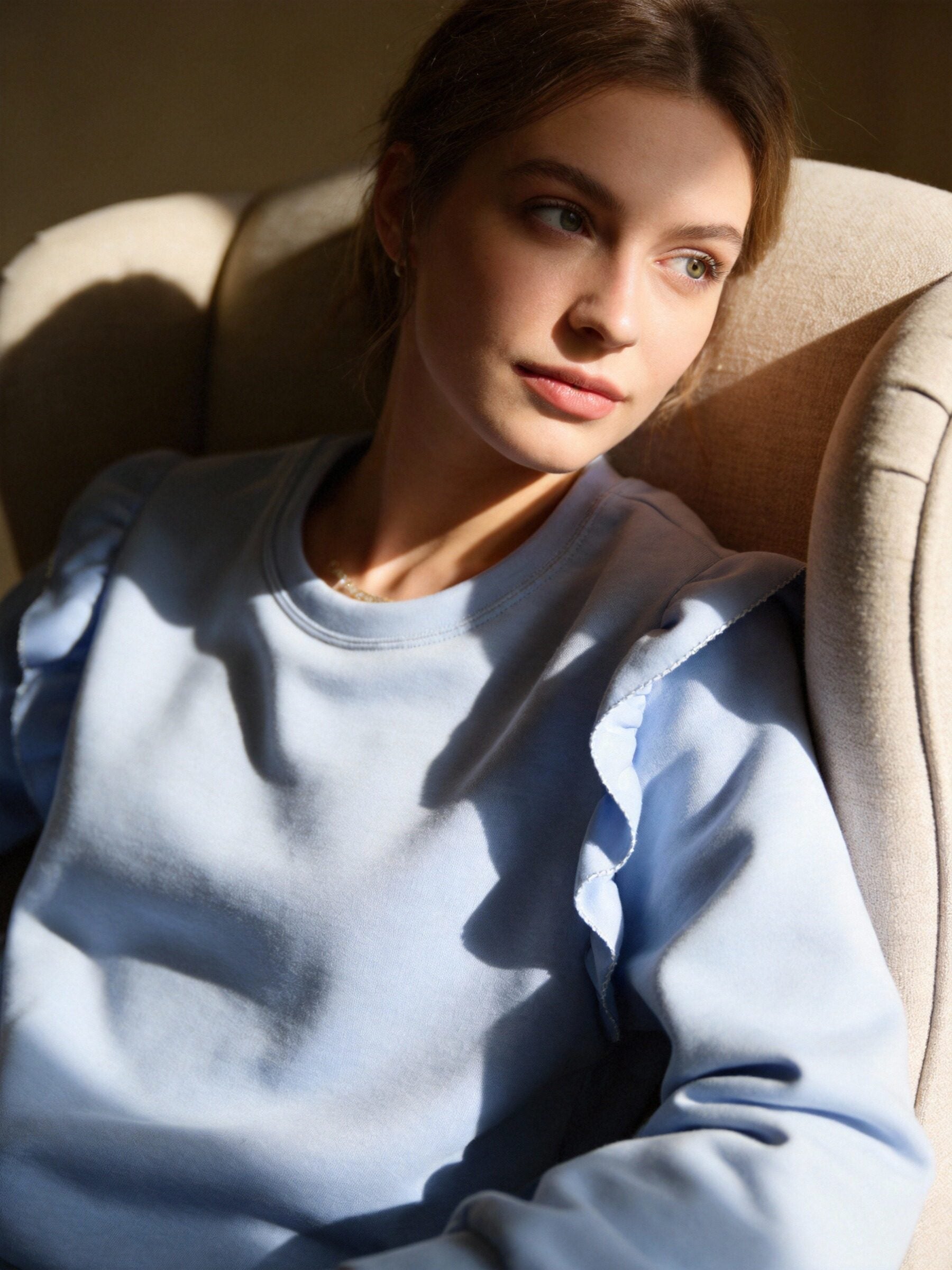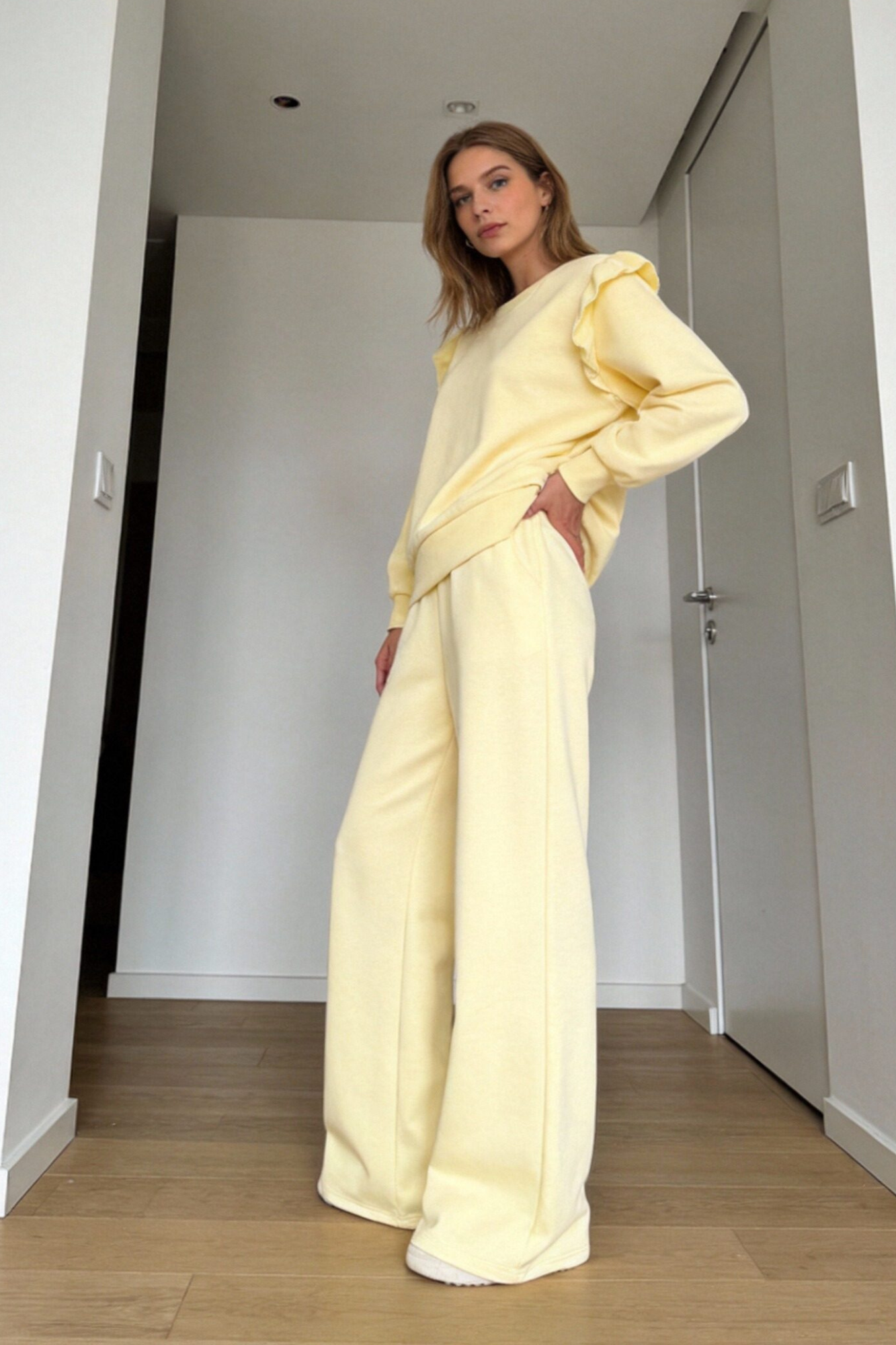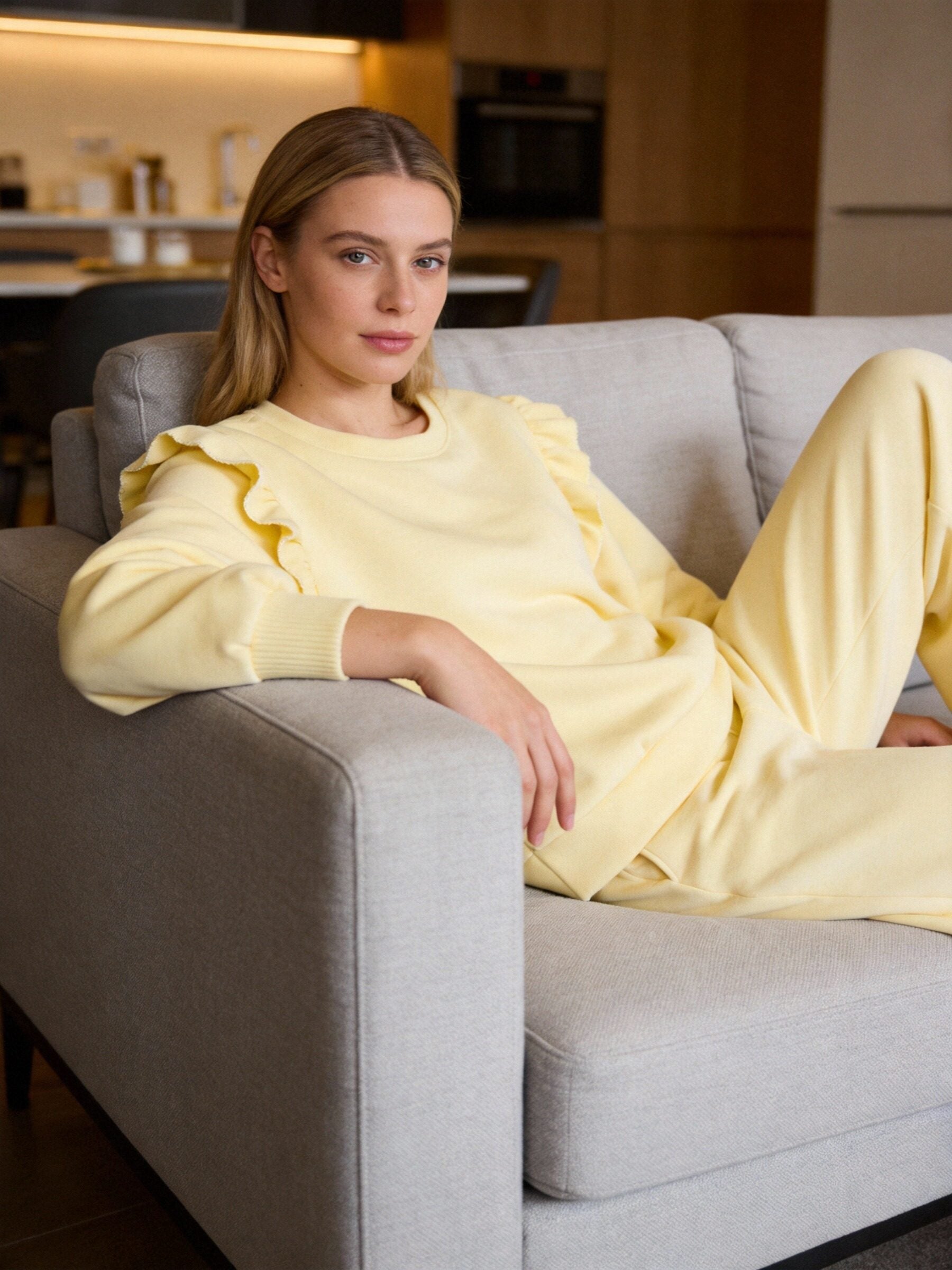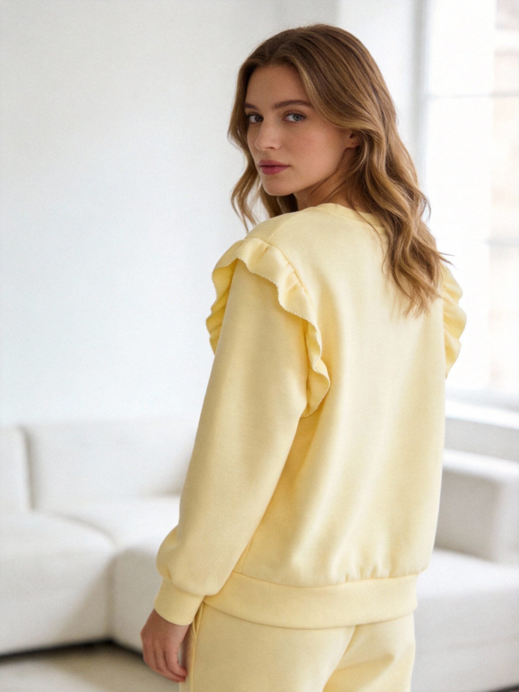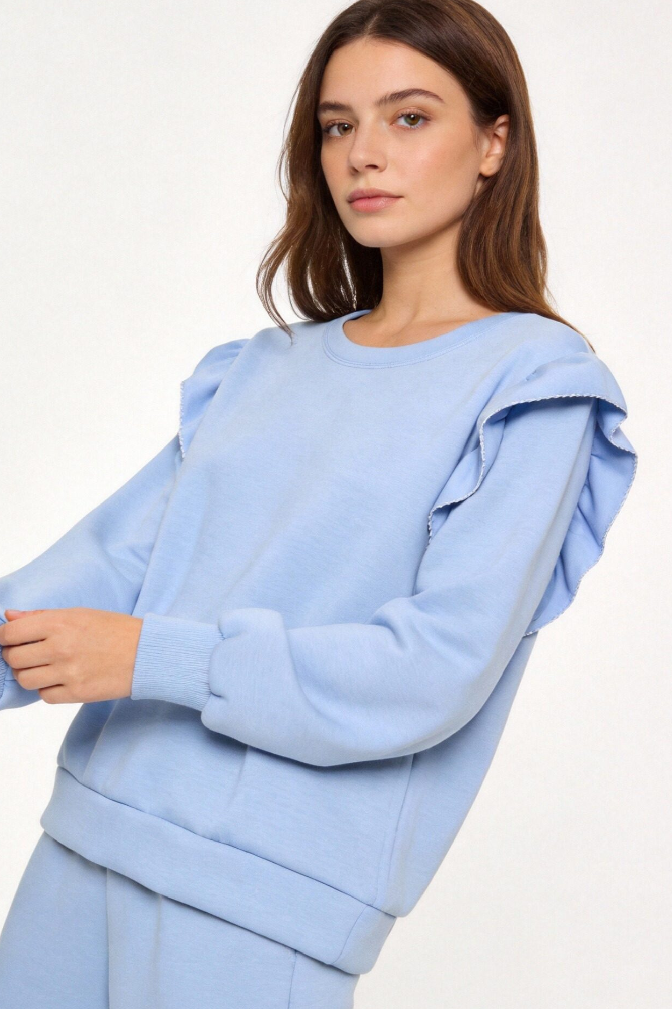 Conjunto de dos piezas. Sudadera de cuello redondo. Manga larga. Detalle de volantes bordados. Pantalón de tiro medio. Cintura elástica....