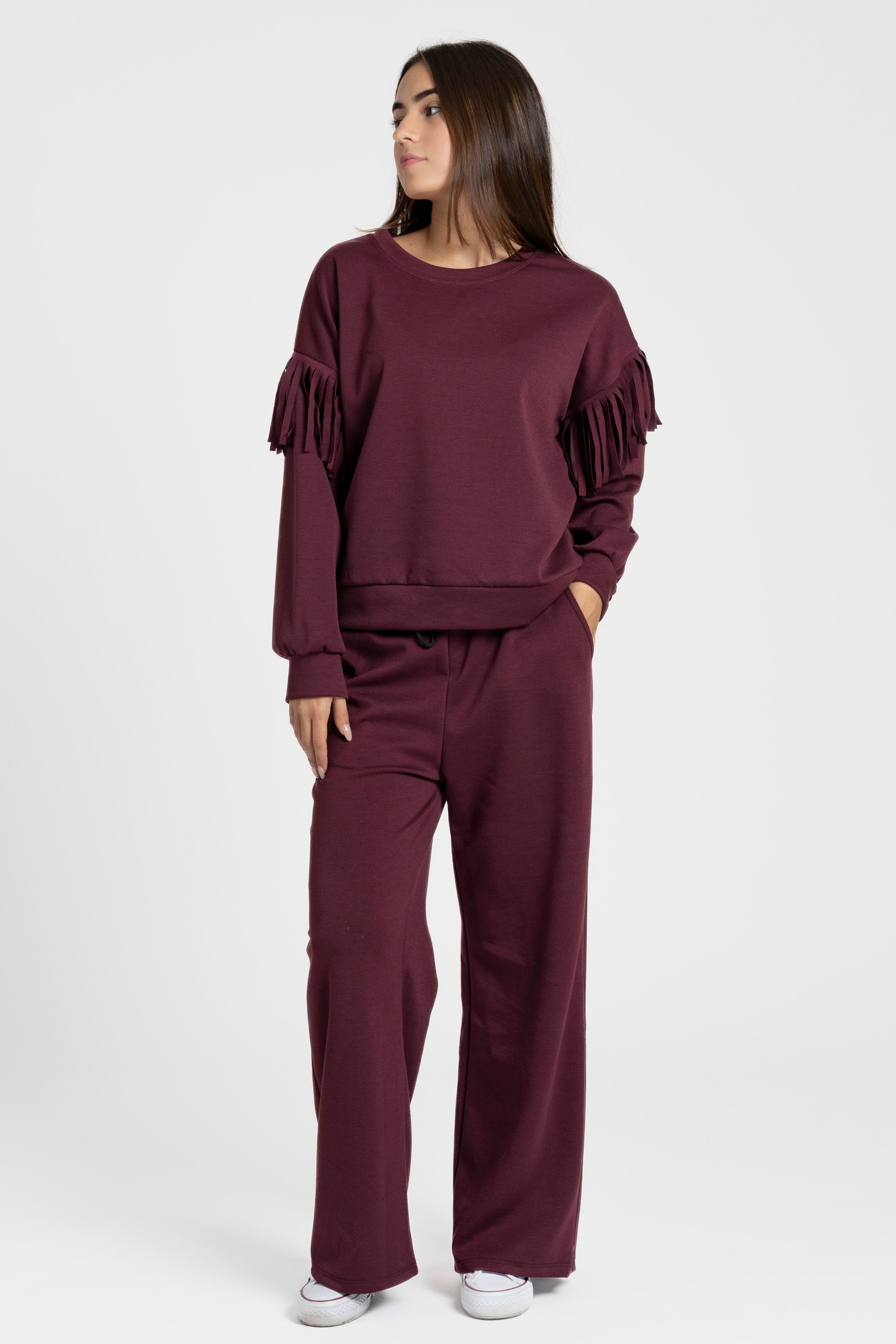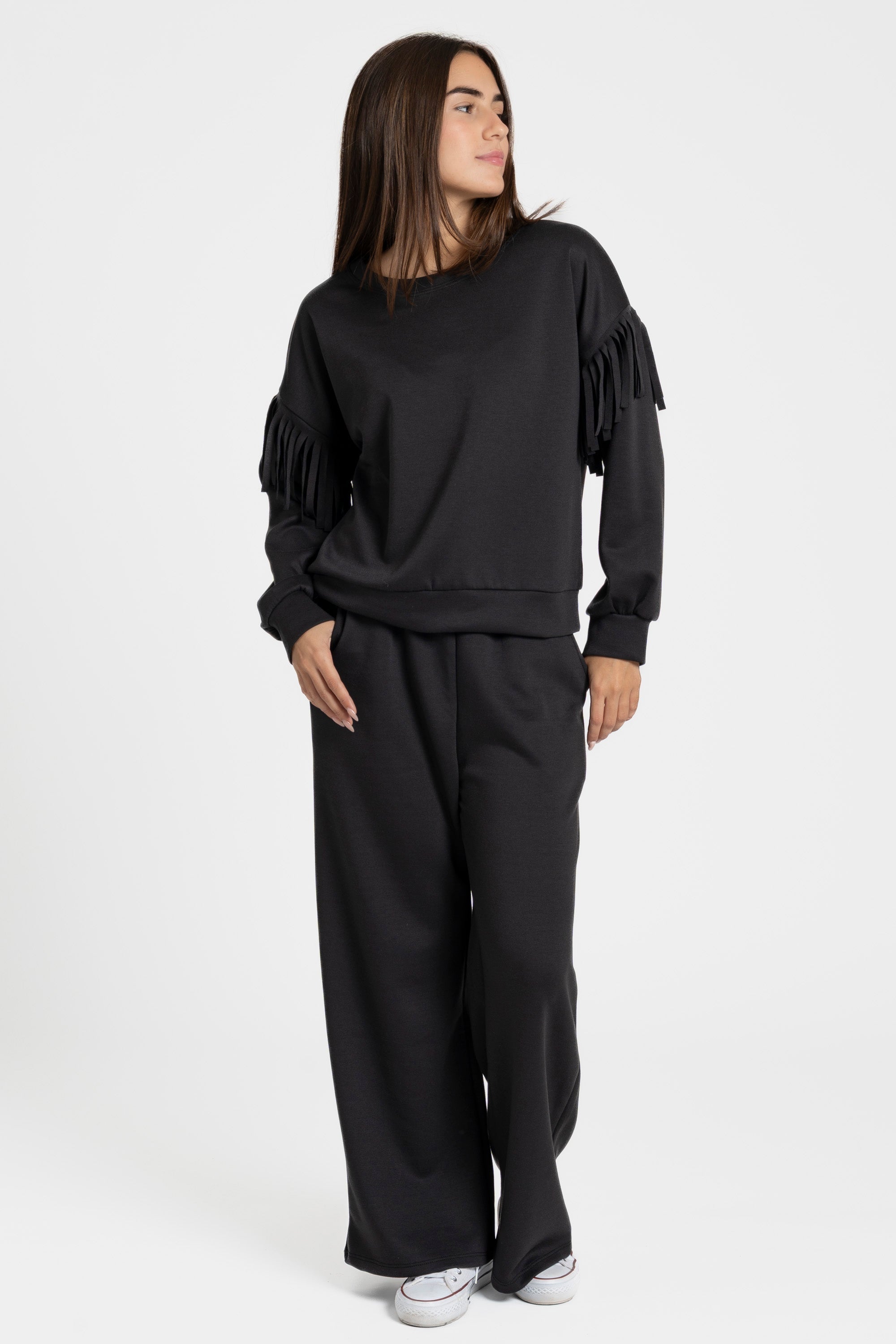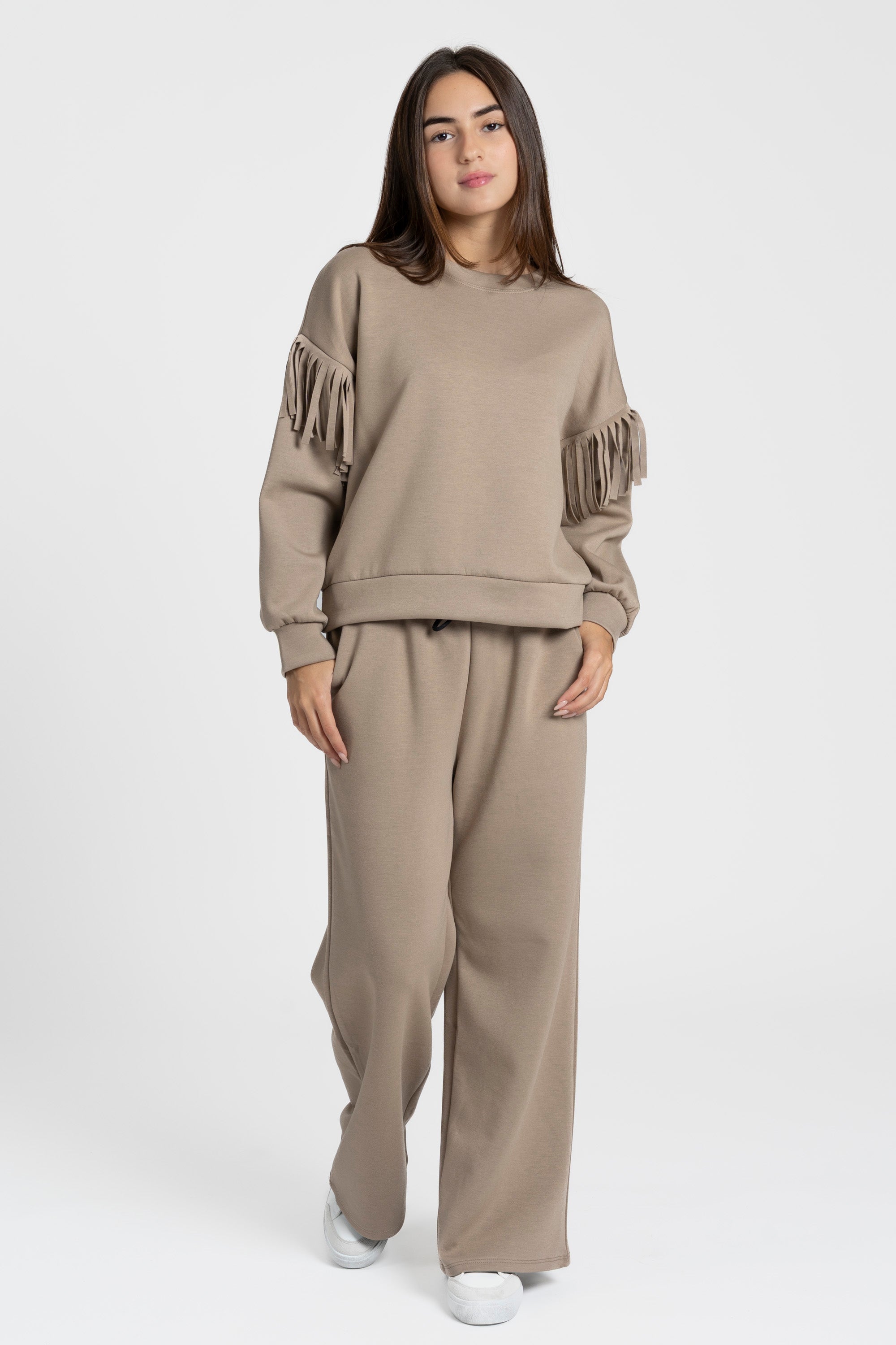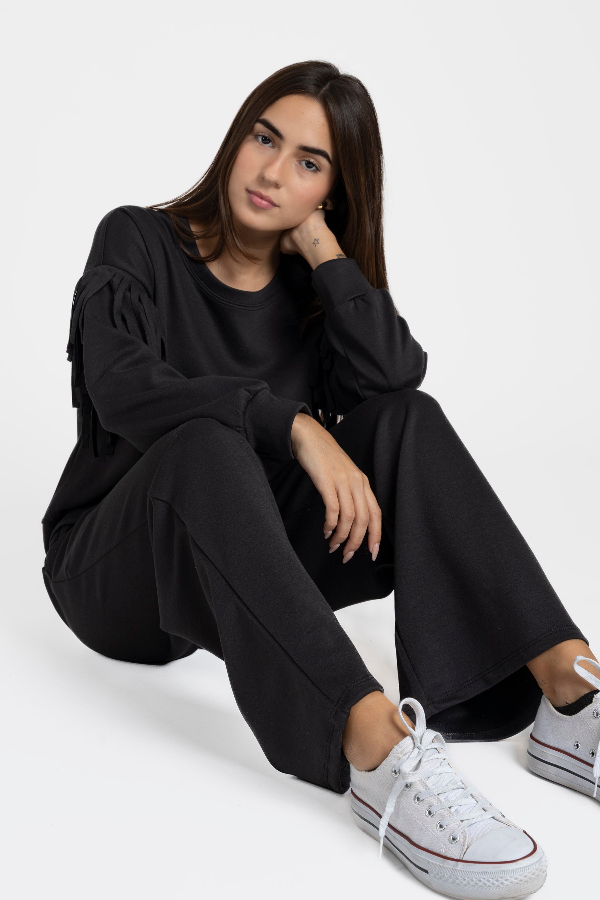 Conjunto de tejido estilo felpa. Sudadera de cuello redondo. Manga larga con flecos. Pantalón de tiro medio. Cintura elástica. Bolsillos...
