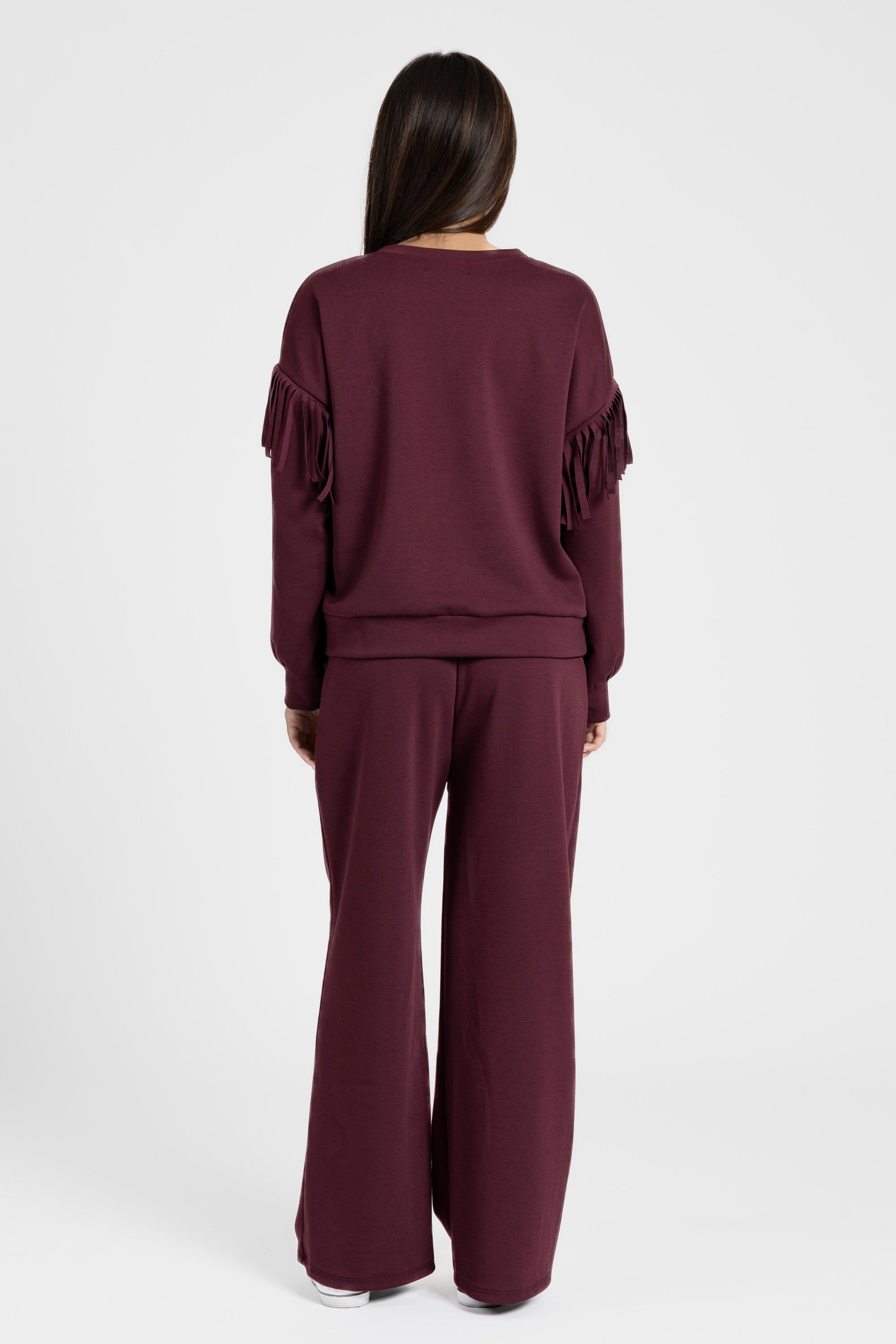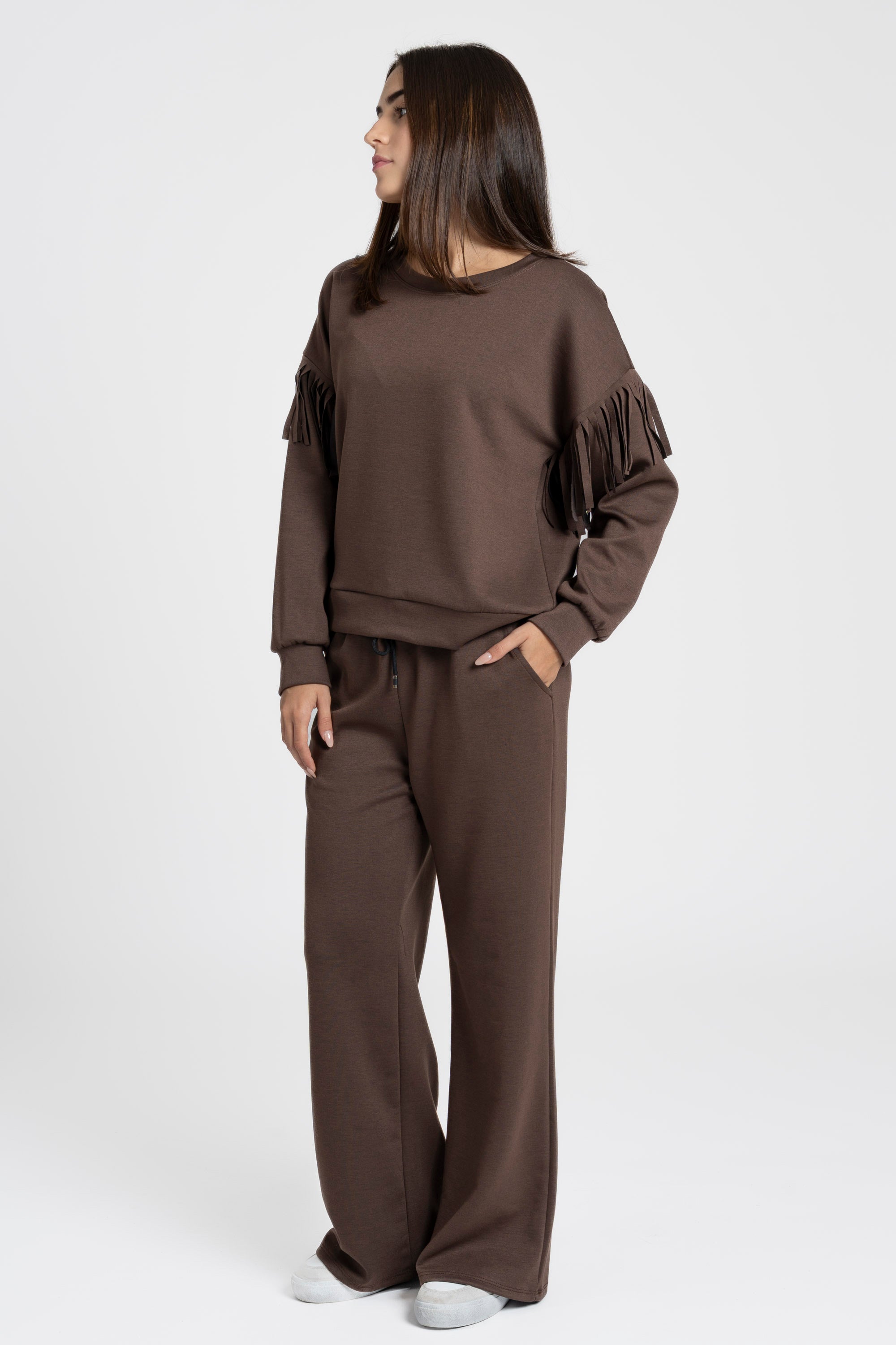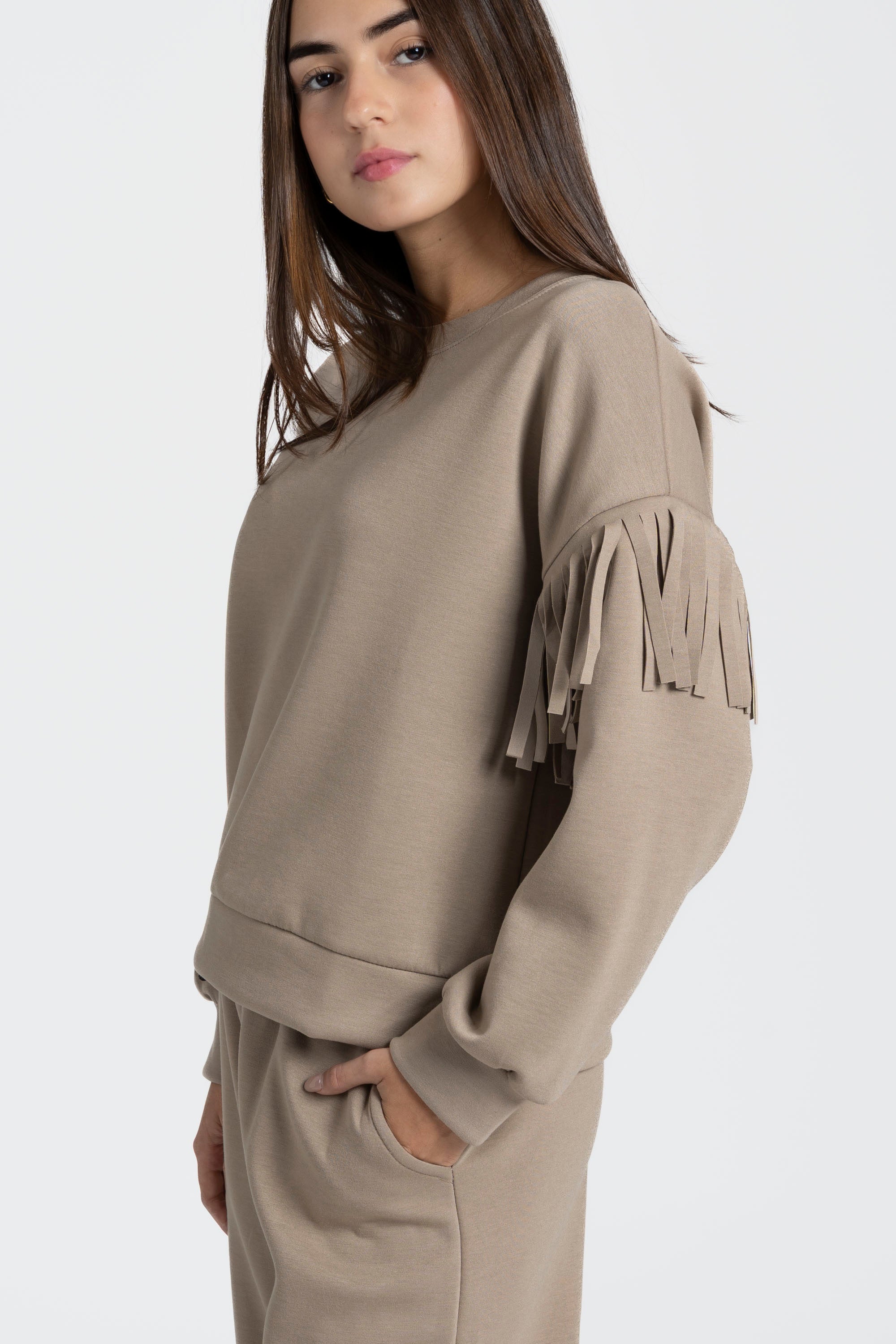 Conjunto de tejido estilo felpa. Sudadera de cuello redondo. Manga larga con flecos. Pantalón de tiro medio. Cintura elástica. Bolsillos...