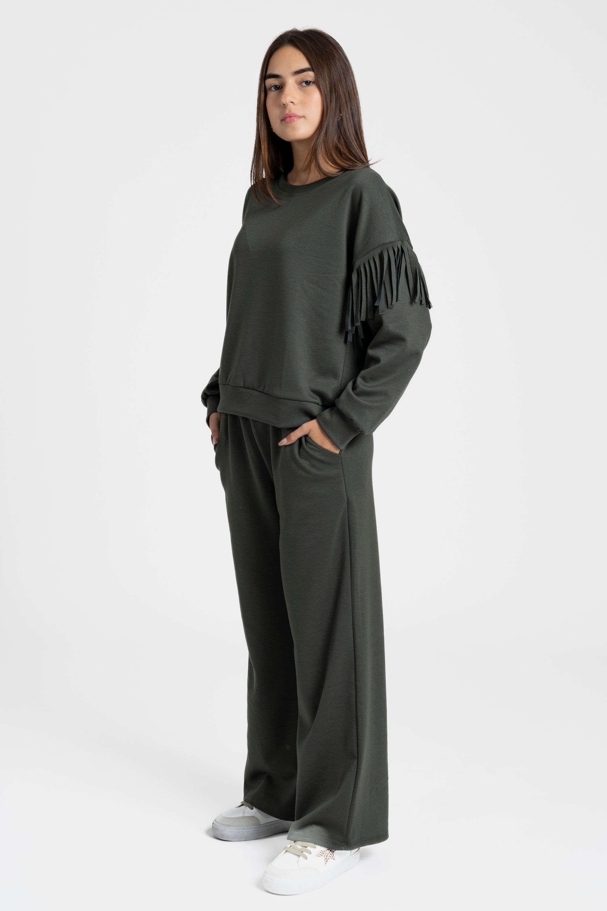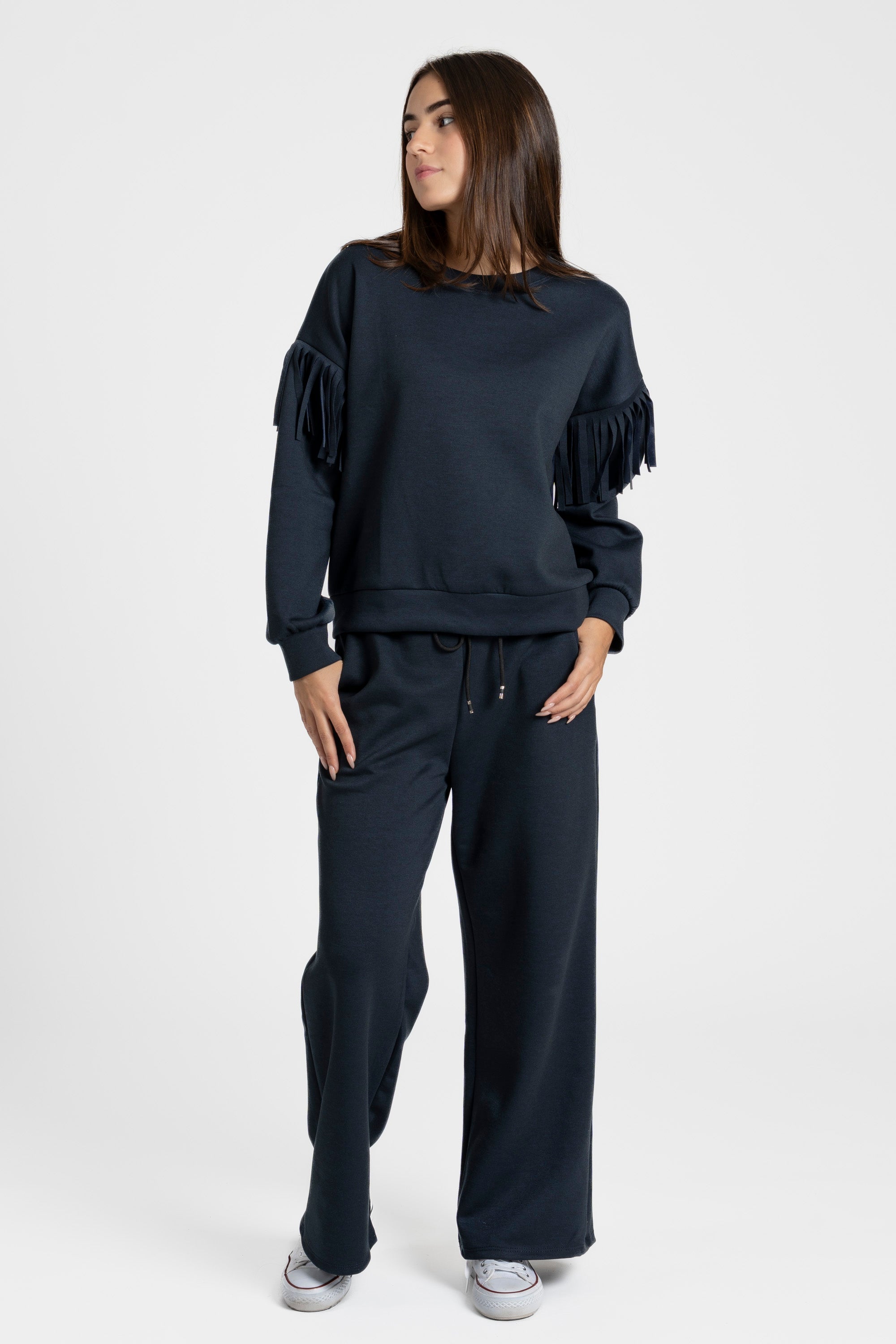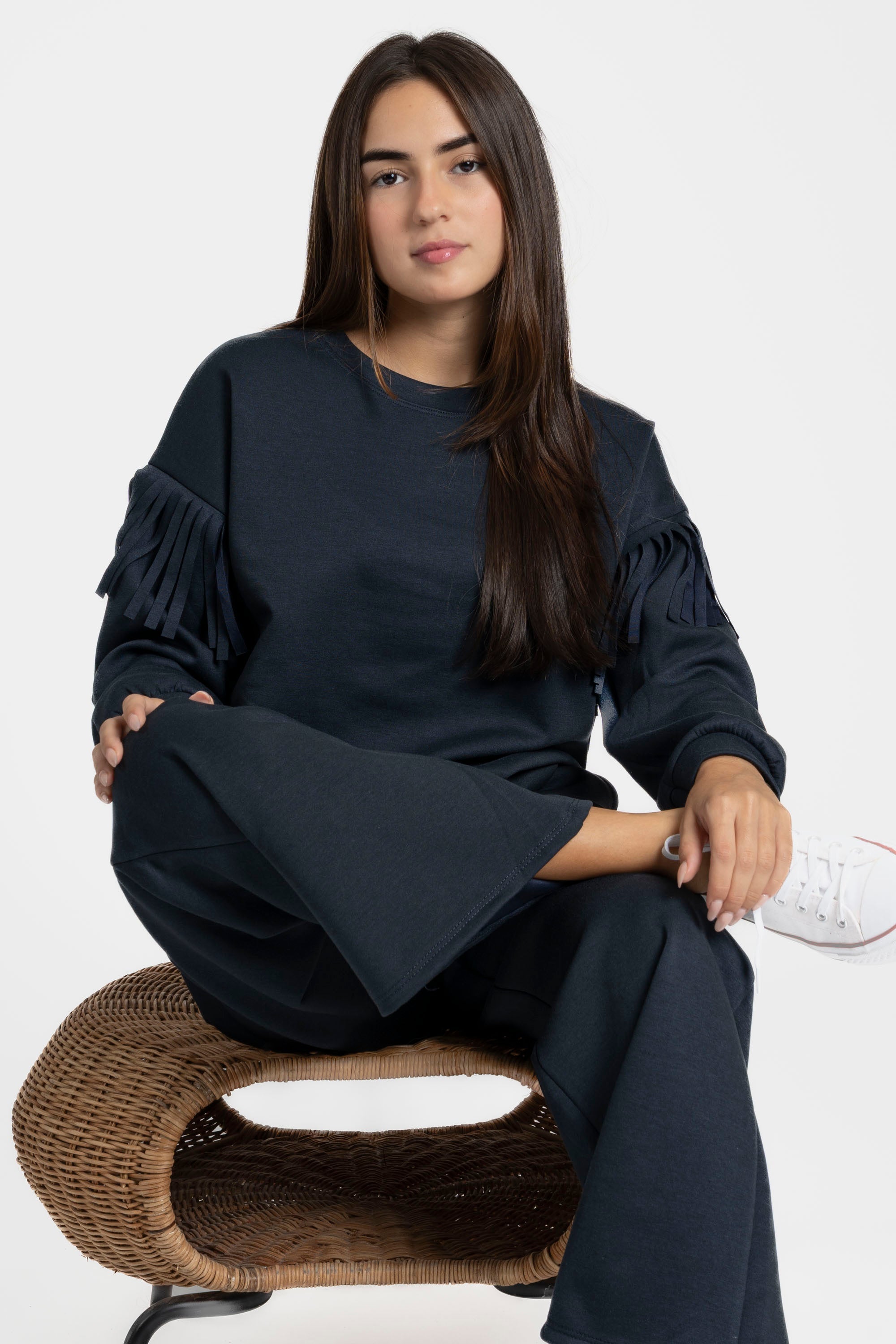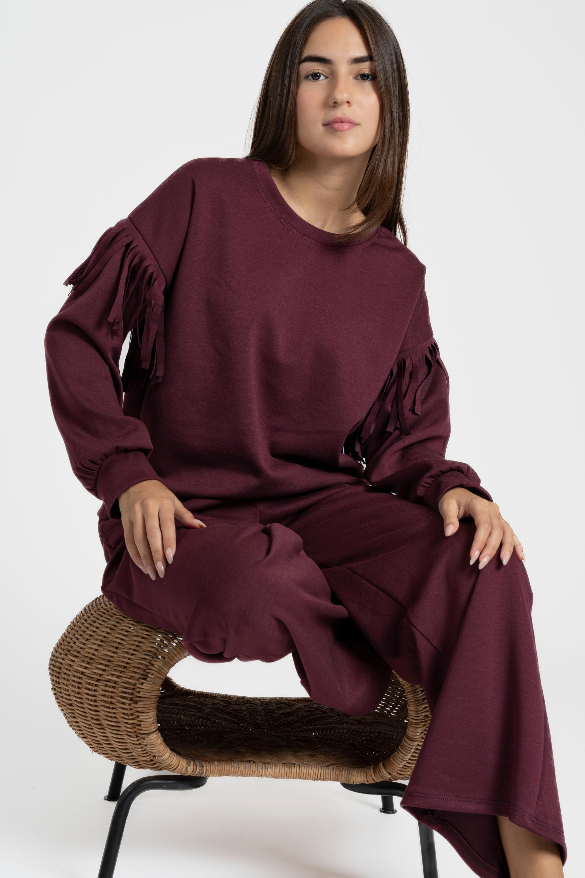 Conjunto de tejido estilo felpa. Sudadera de cuello redondo. Manga larga con flecos. Pantalón de tiro medio. Cintura elástica. Bolsillos...