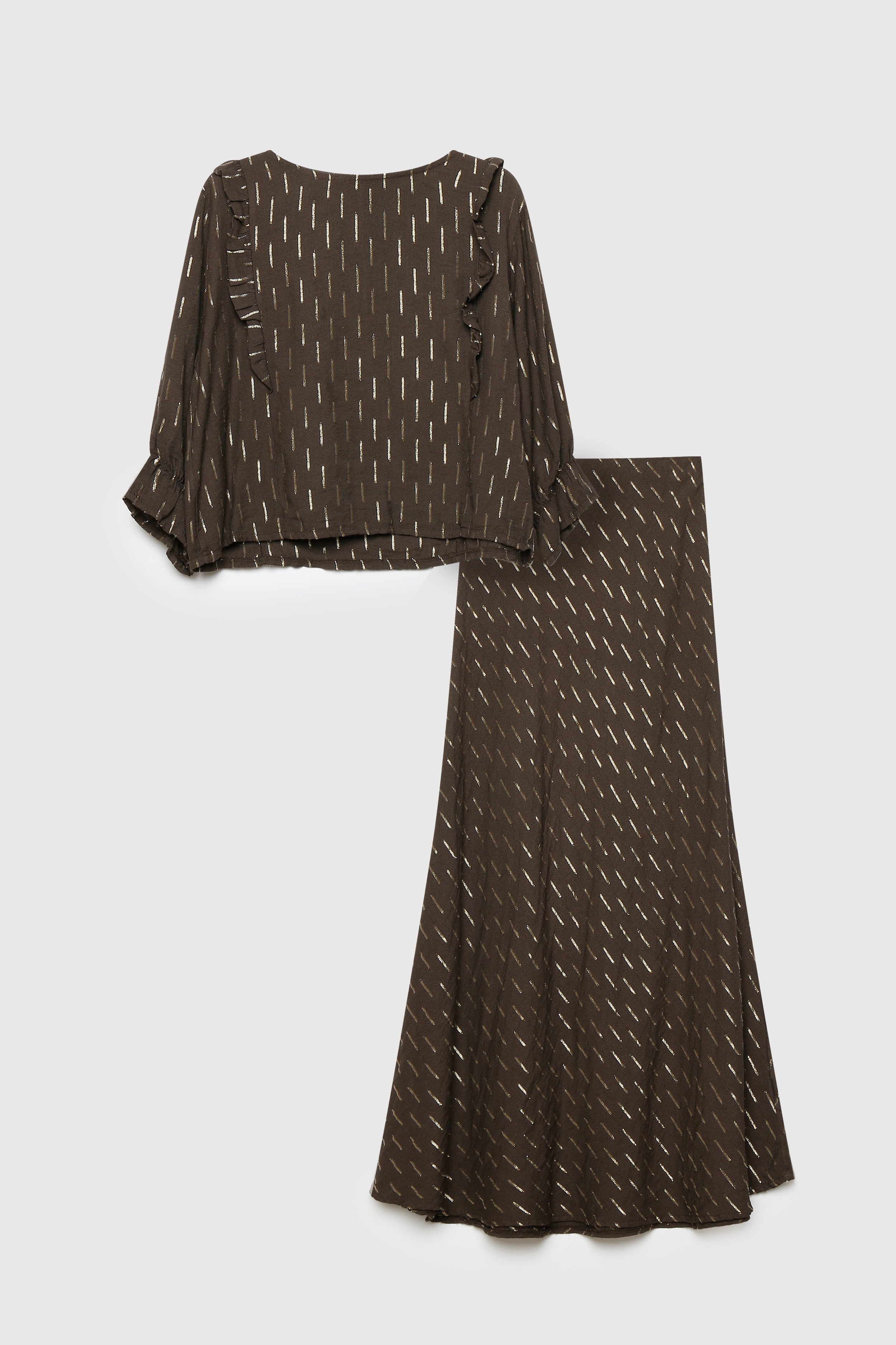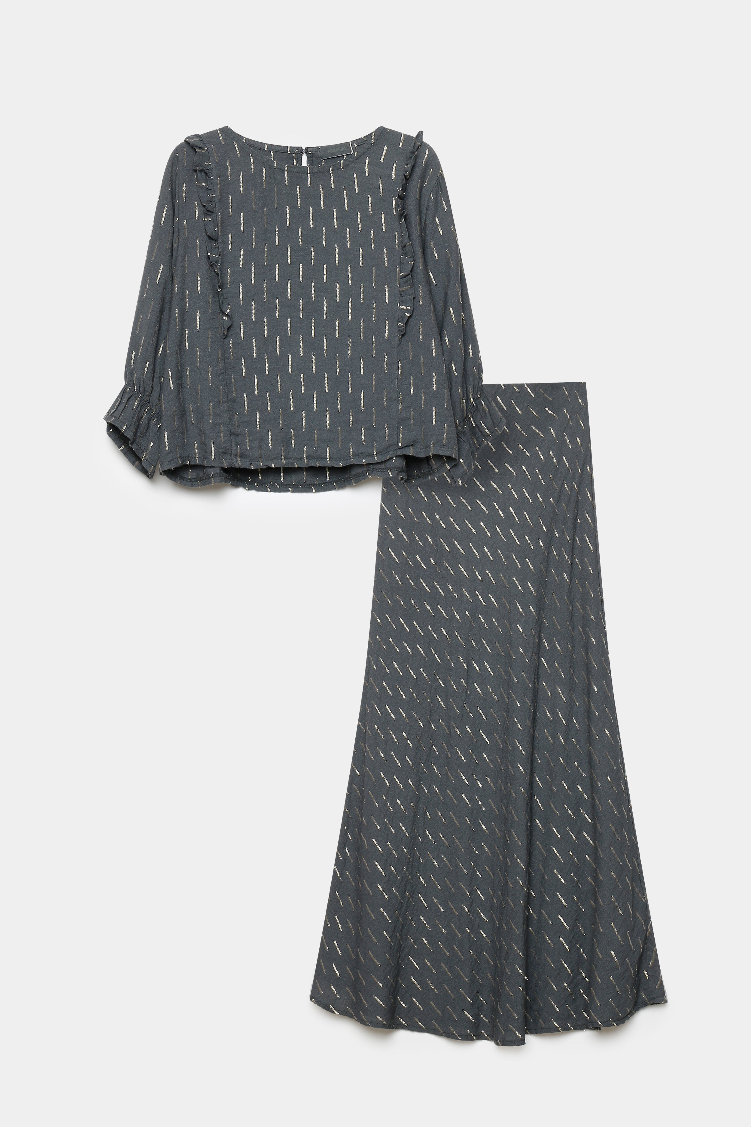 Blusa de cuello redondo. Manga 3/4. Cierre en la trasera con botón. Falda de tiro alto. Cintura elástica. Diseño largo. Composición:...