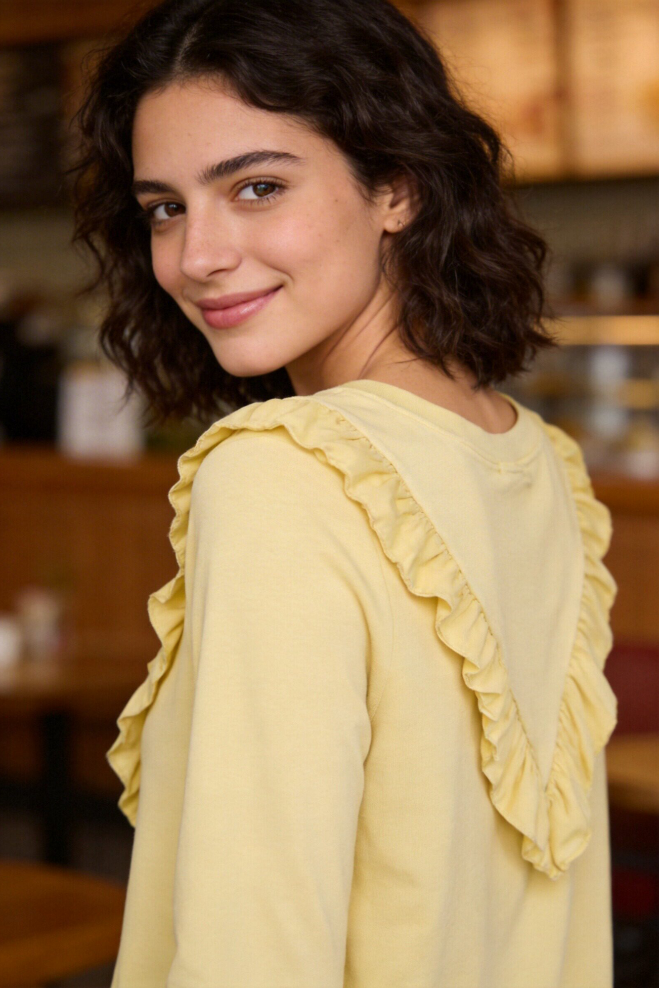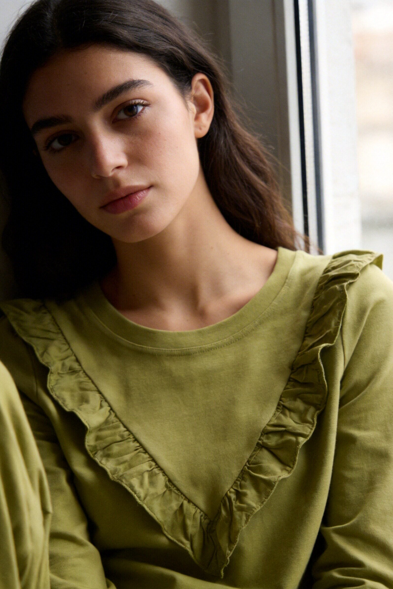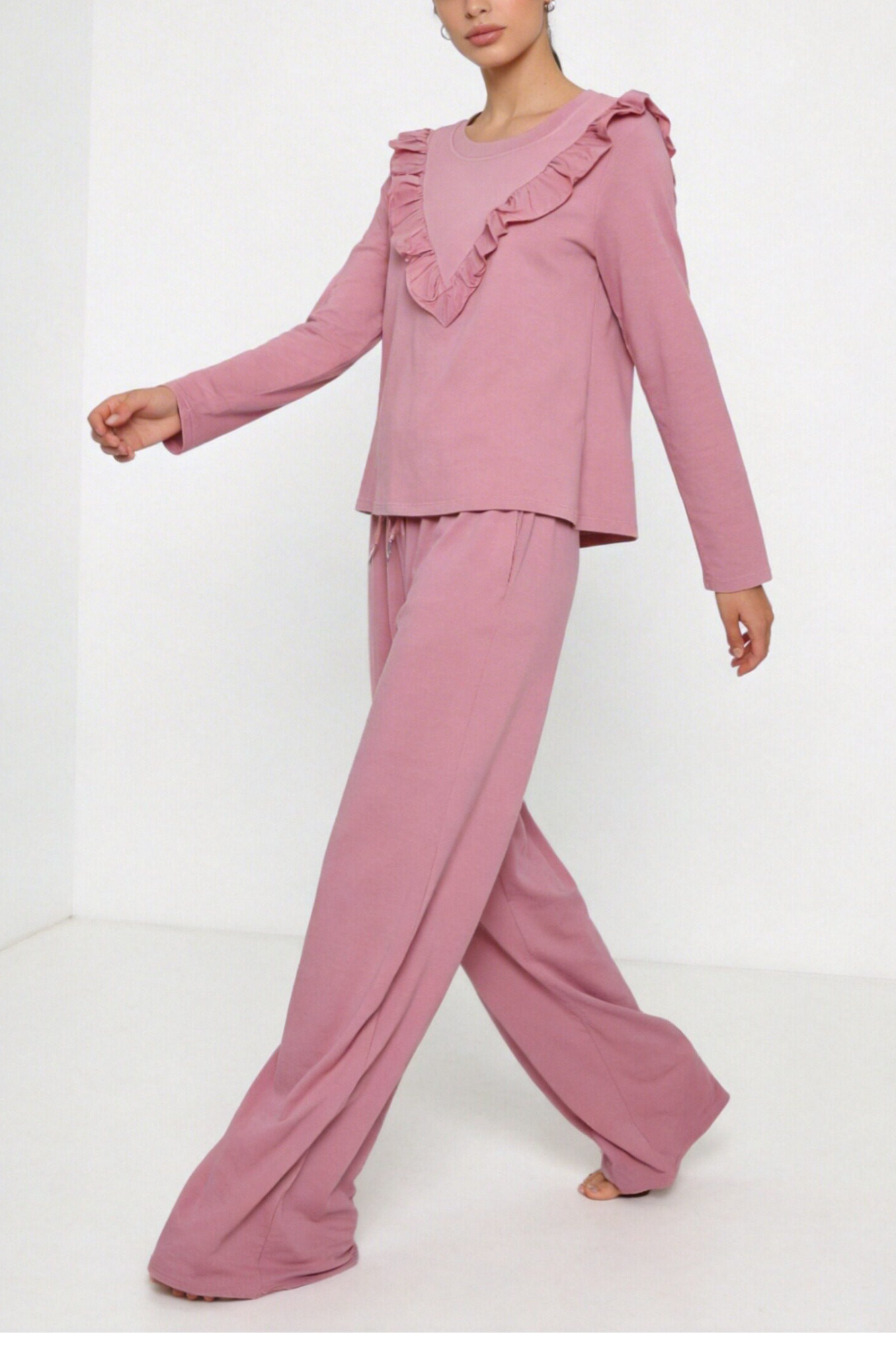 Conjunto de camiseta y pantalón. Tejido mezcla de algodón. Camiseta de cuello redondo y manga larga. Detalle de volantes. Pantalón...