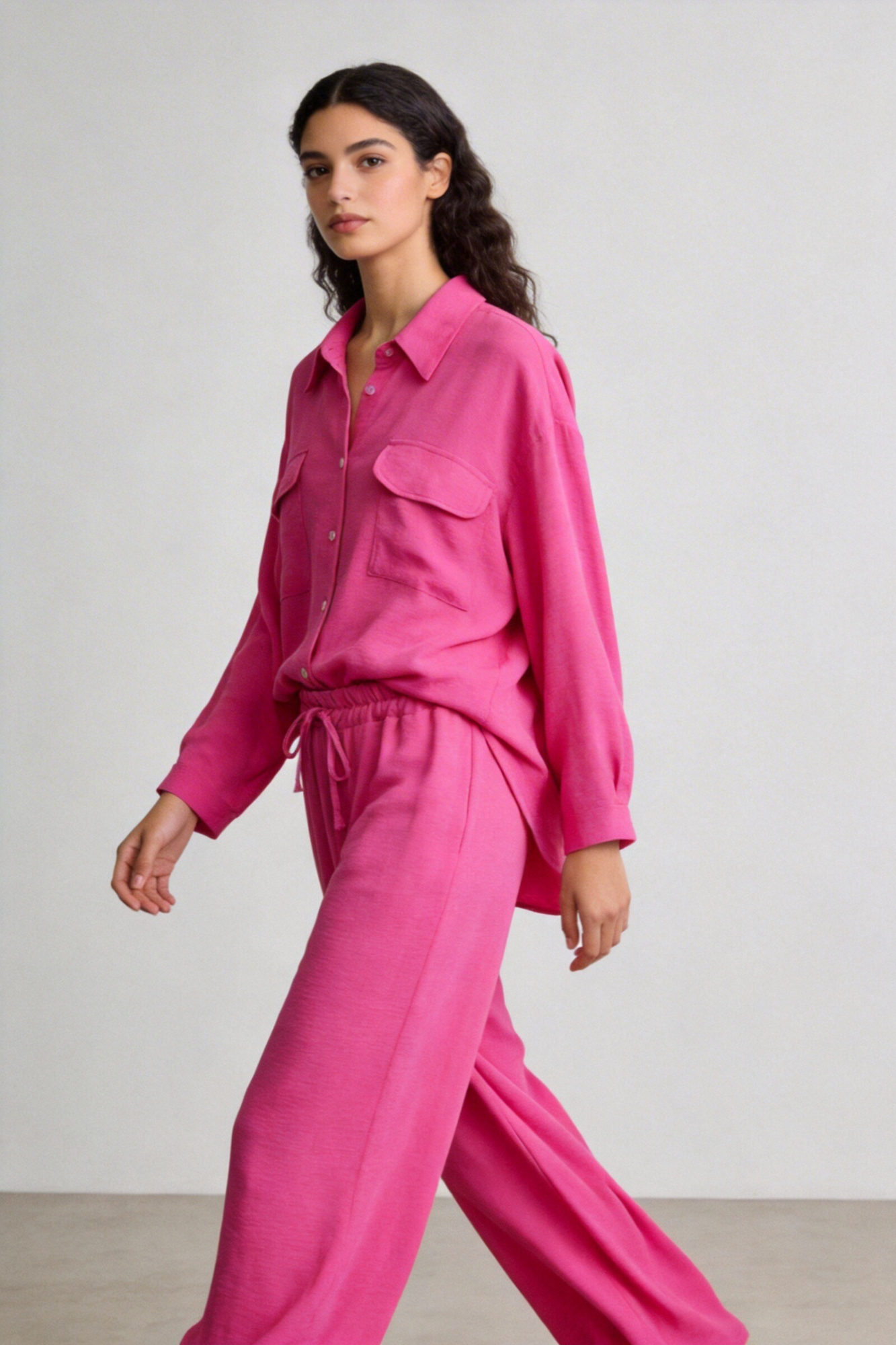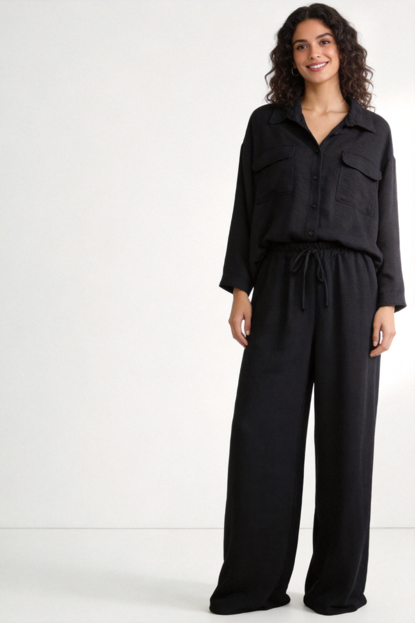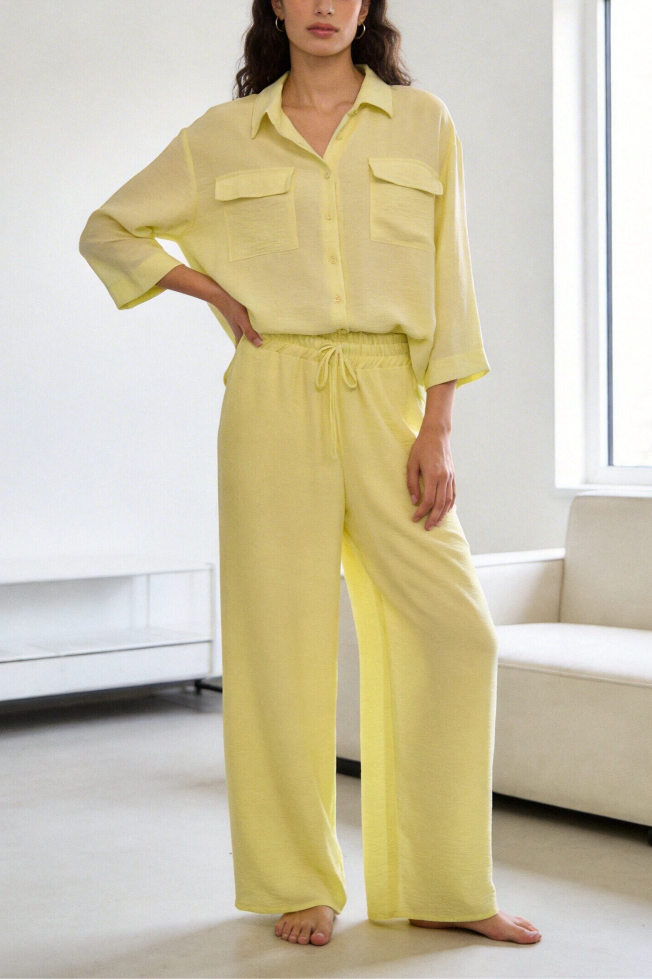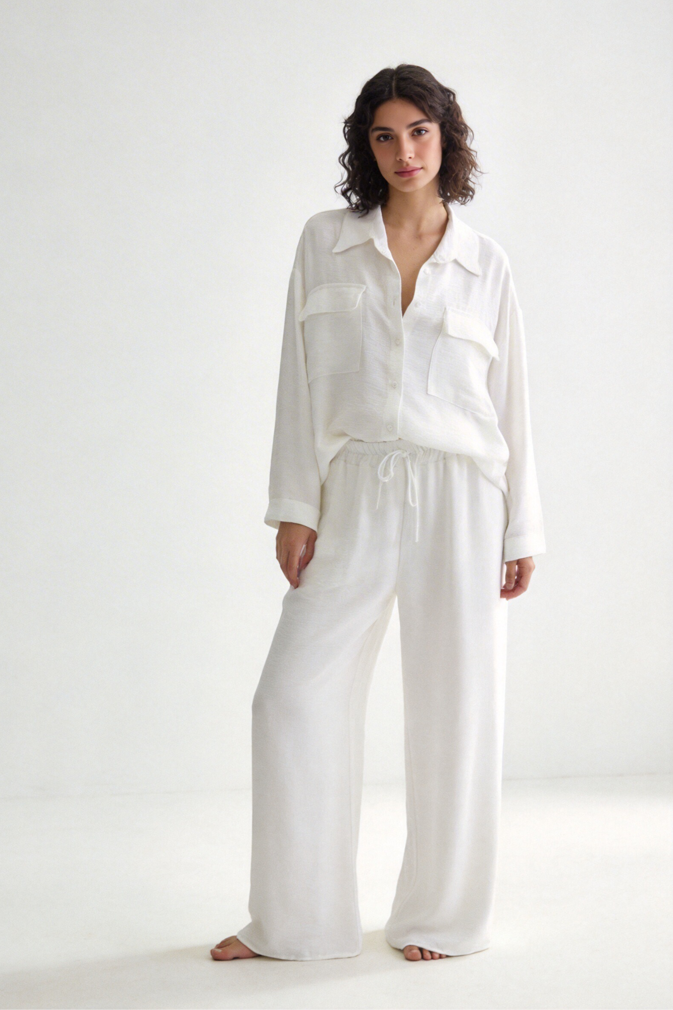 Conjunto de camisa y pantalón. Tejido de gasa. Tejido con textura. Camisa fluida. Bolsillos delanteros con solapa. Cierre de botones. Pantalón...
