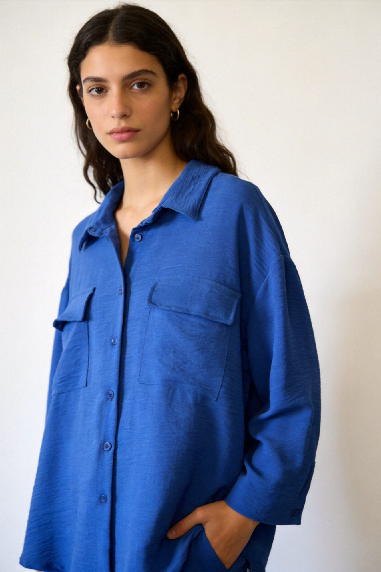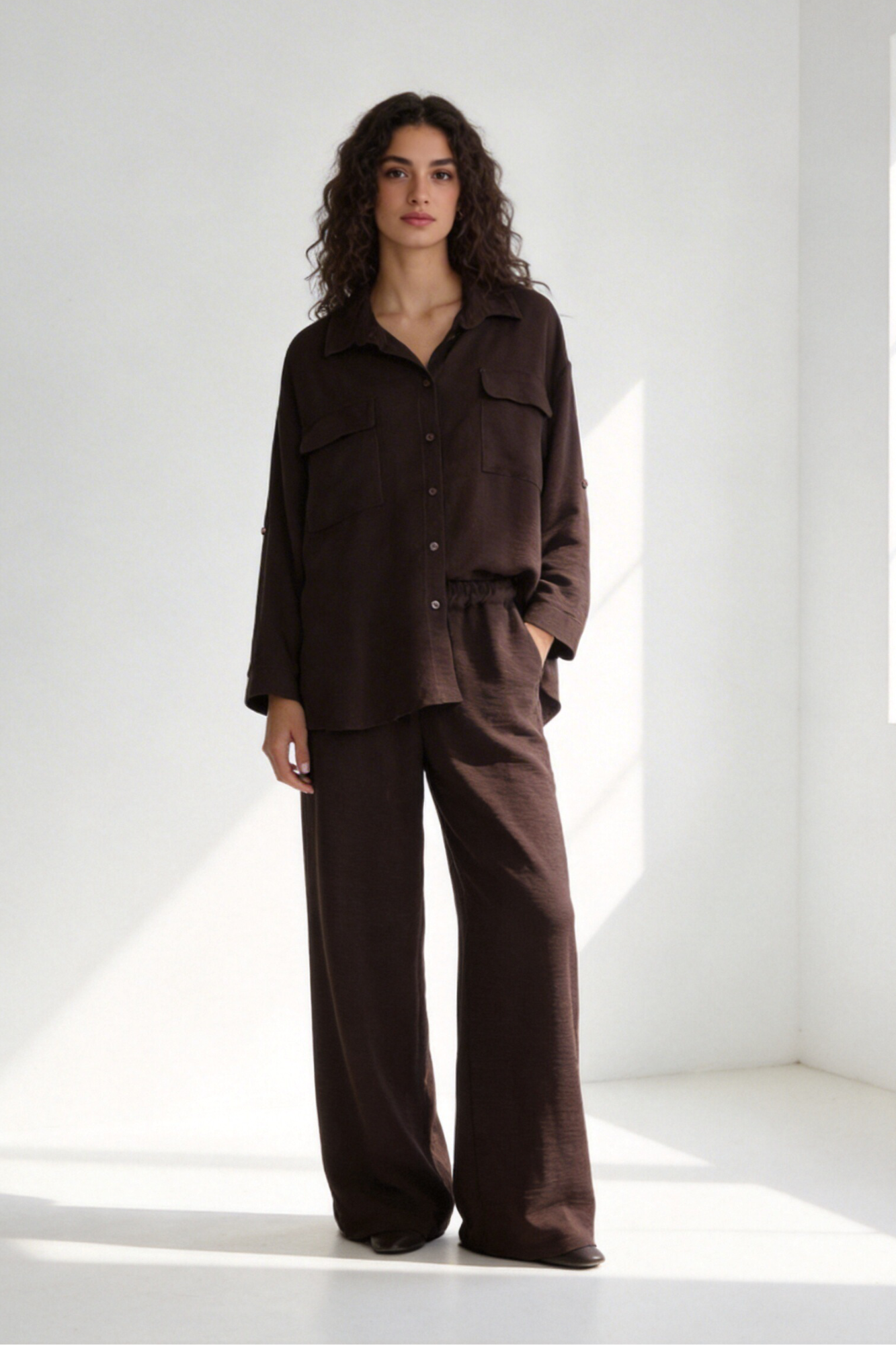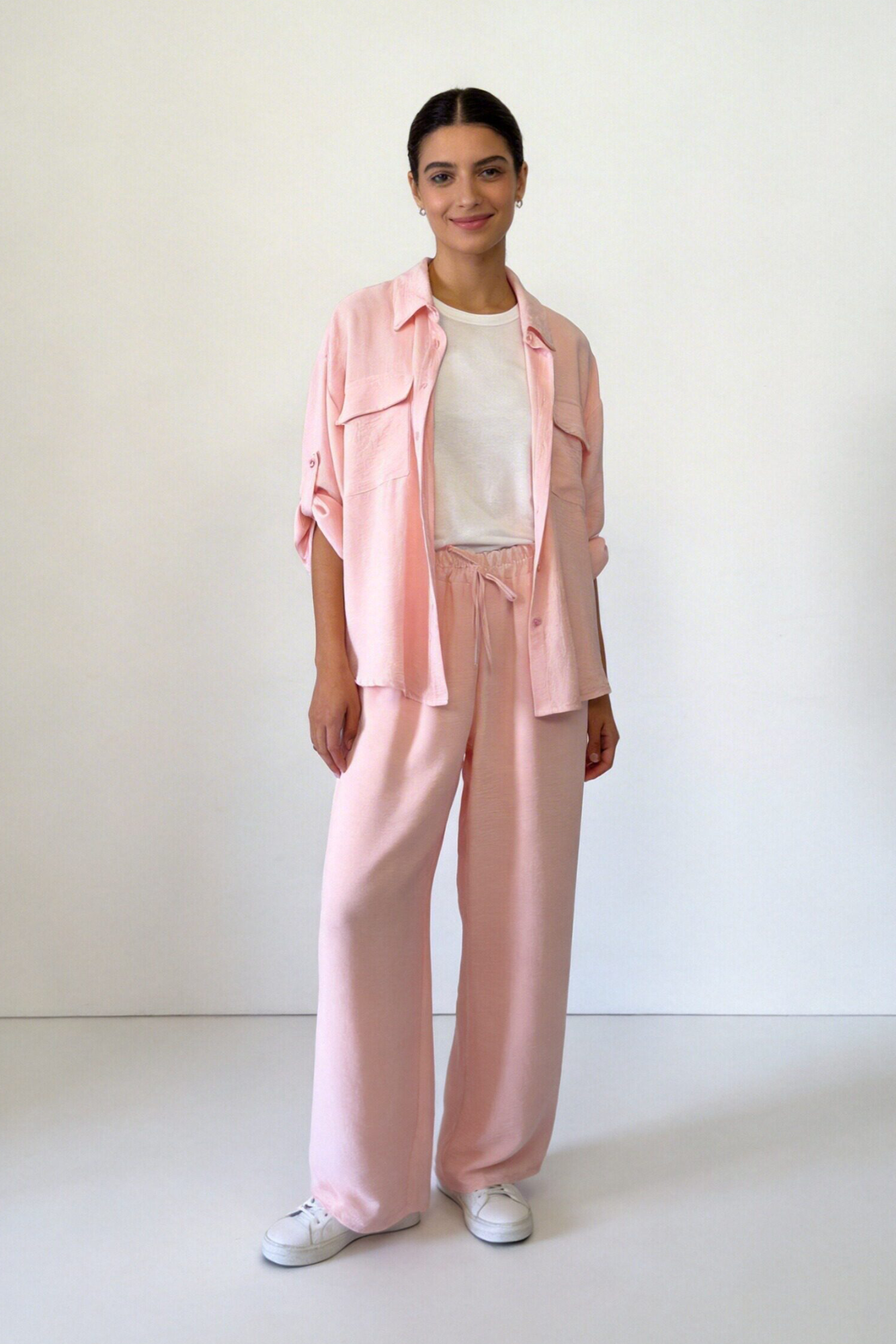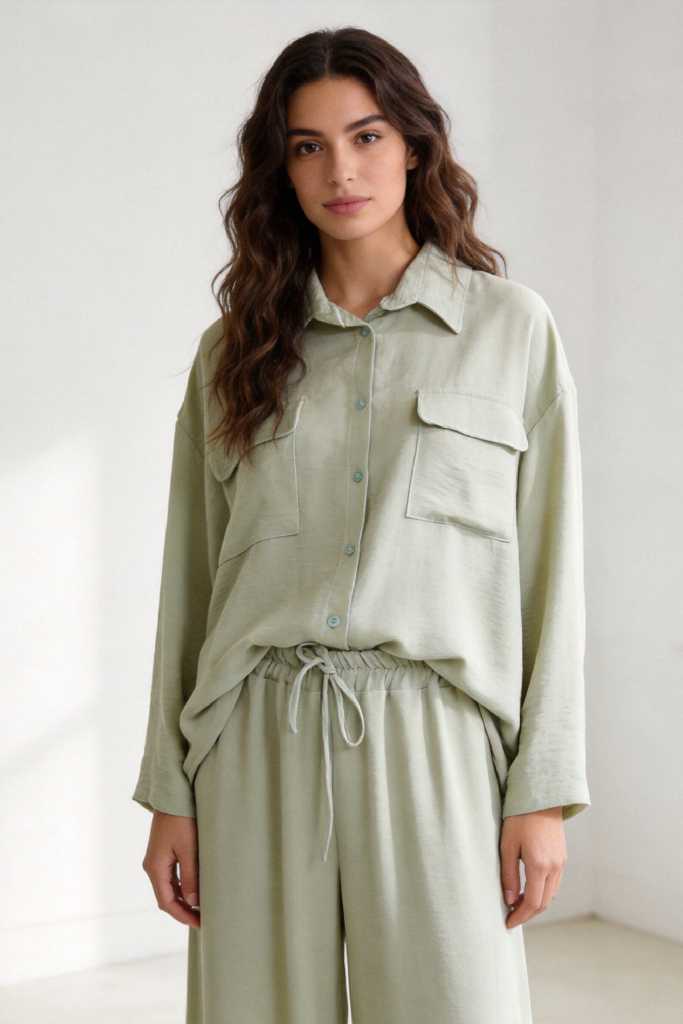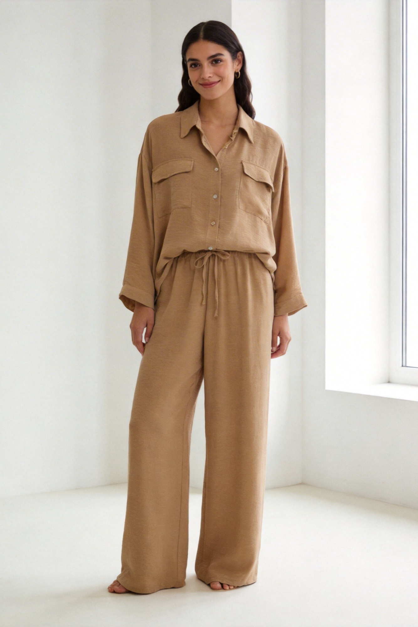 Conjunto de camisa y pantalón. Tejido de gasa. Tejido con textura. Camisa fluida. Bolsillos delanteros con solapa. Cierre de botones. Pantalón...