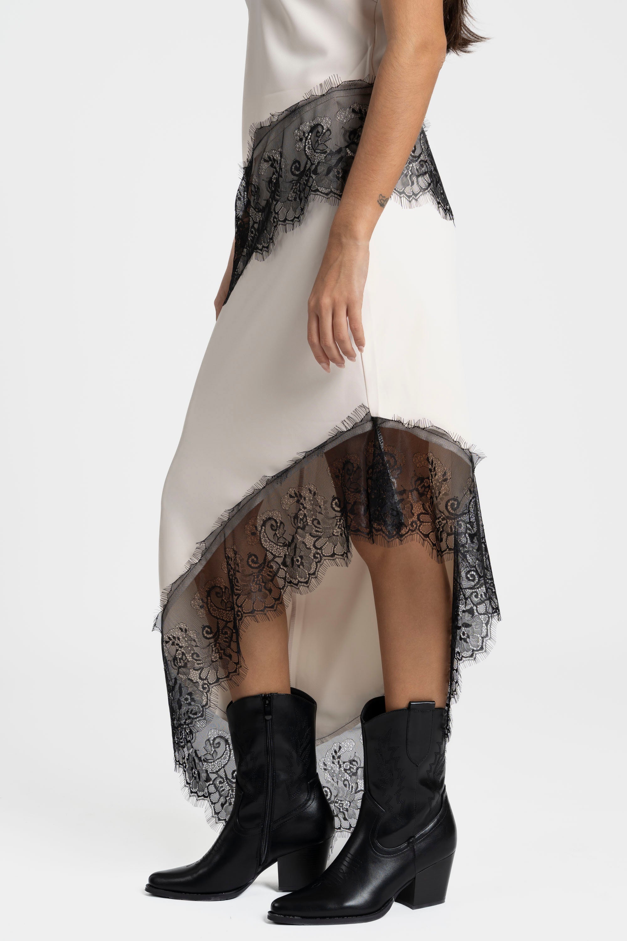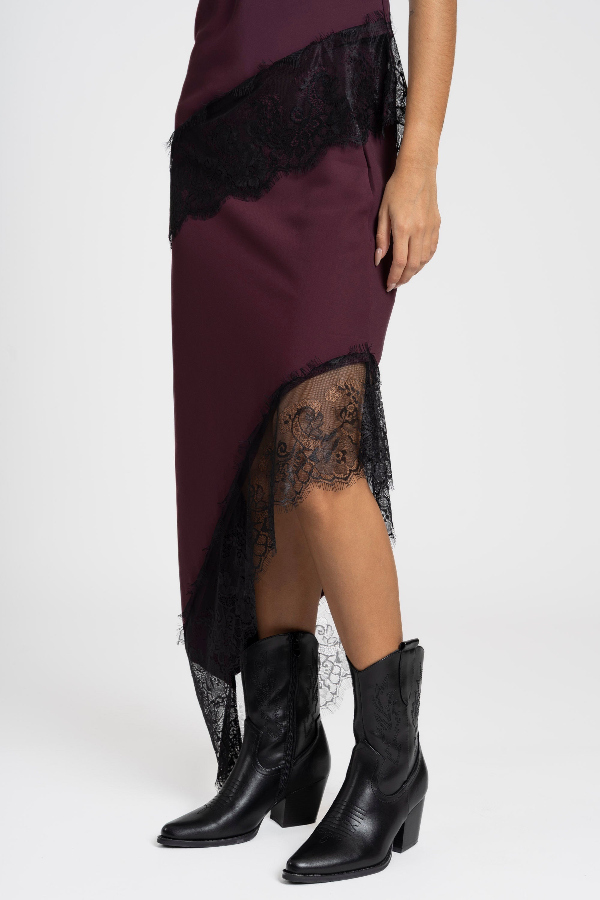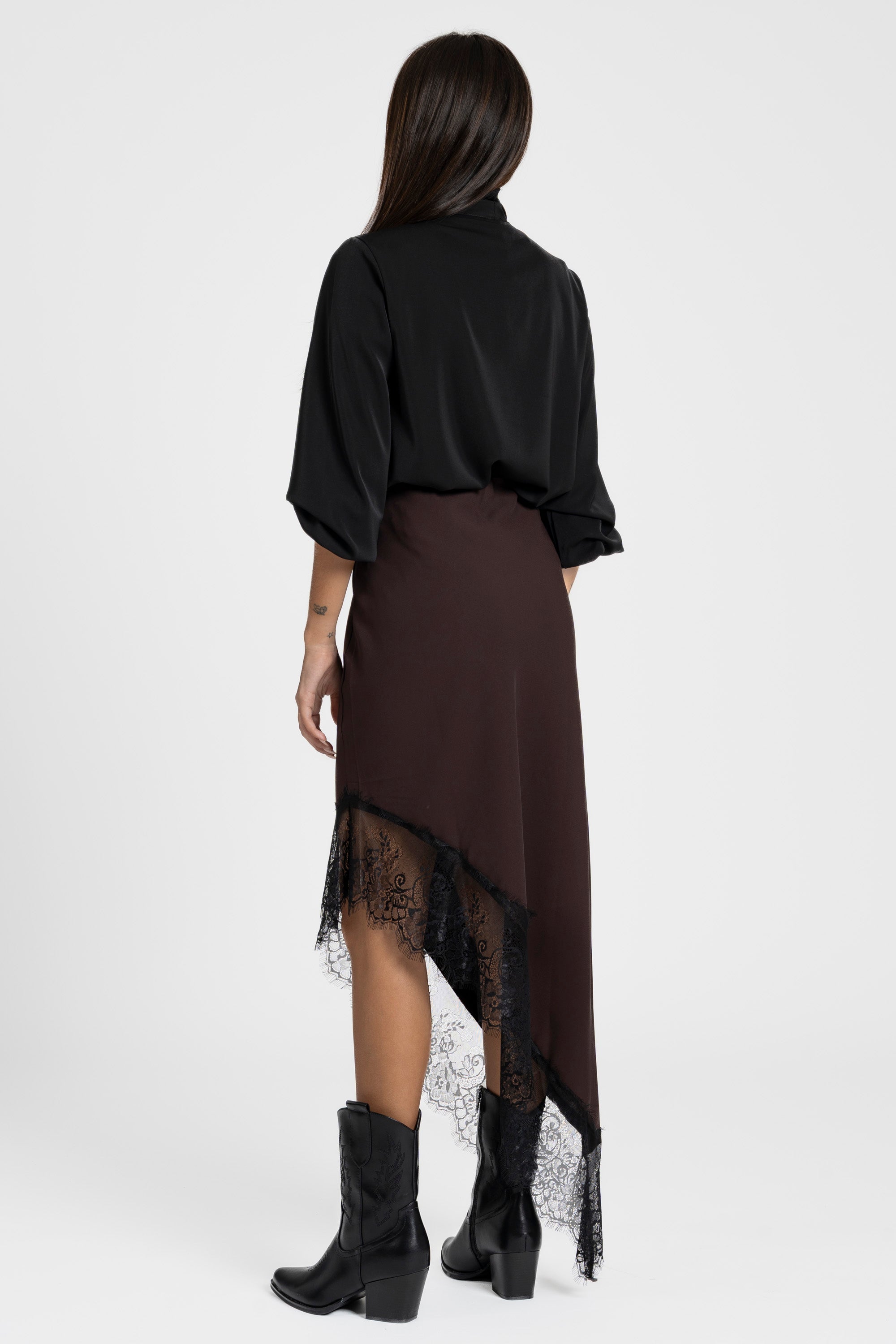 Tejido grueso con encaje. Cintura elástica. Bajo asimétrico. Composición: 95% Poliéster, 5% Elastano Hecho en Italia