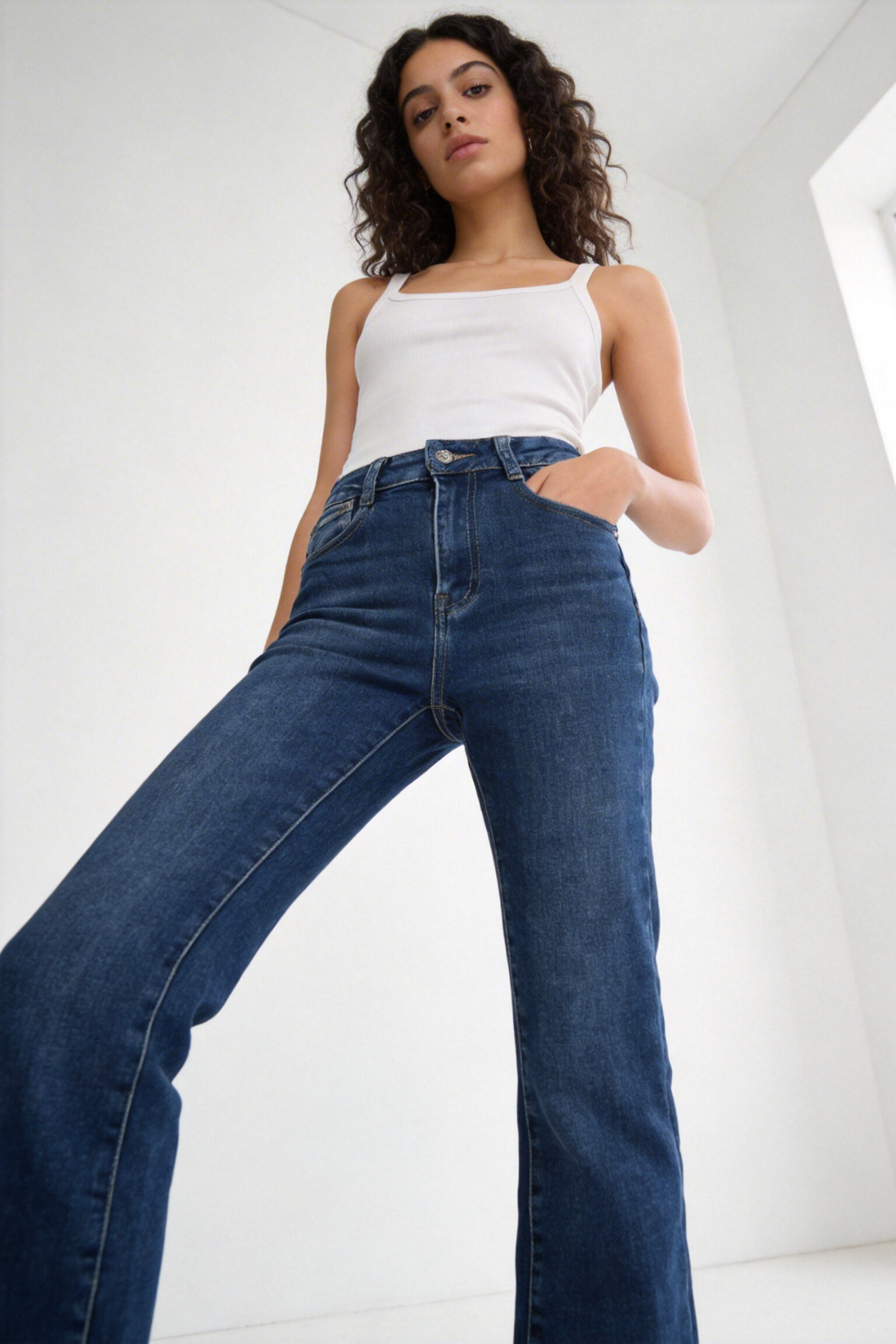 Tejido mezcla de algodón. Tiro alto. Cinco bolsillos. Cierre con cremallera y botón metálico. Diseño flare. Tejido elástico. Composición: 62%...