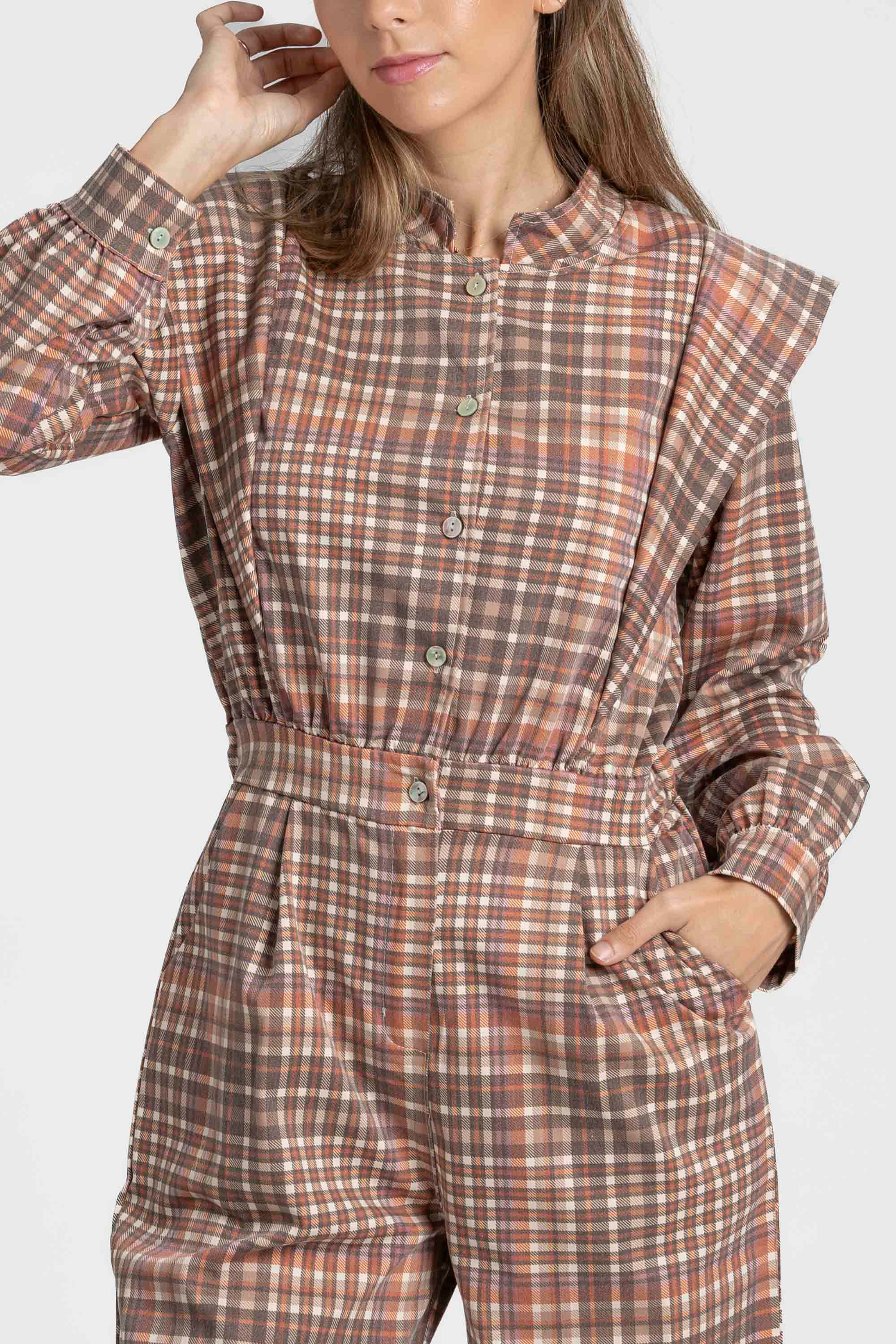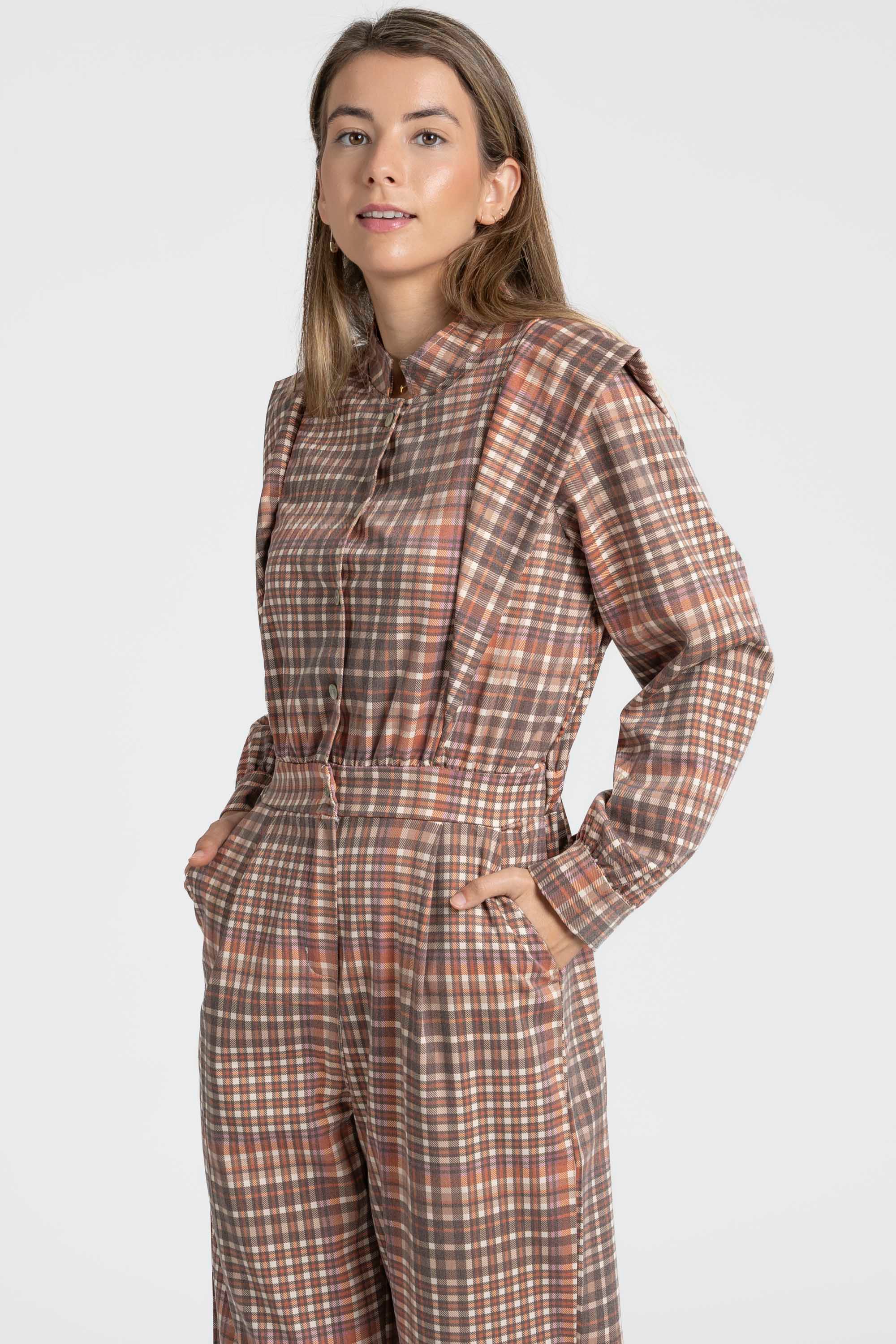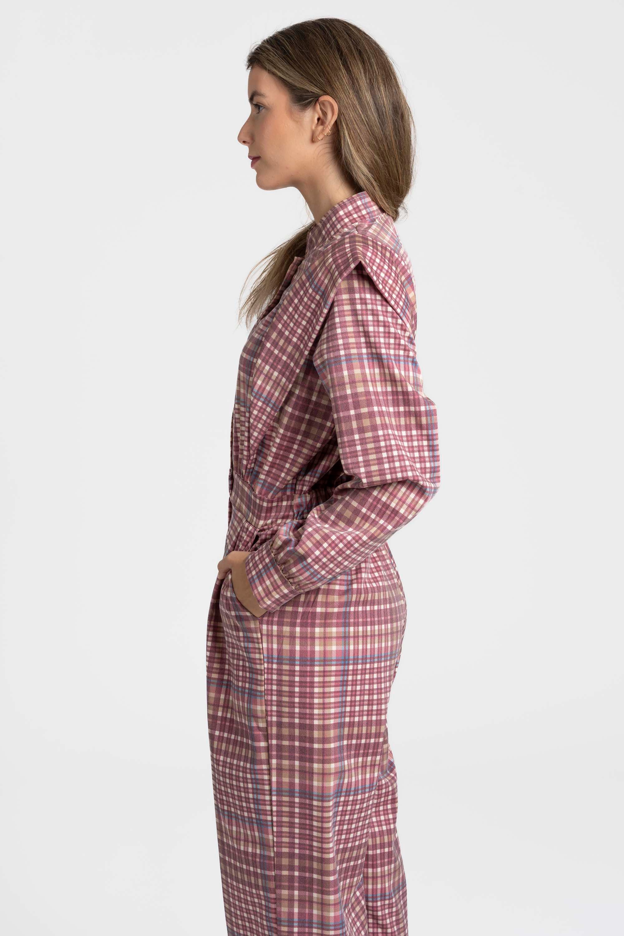 Tejido estampado cuadros. Cuello redondo. Manga larga. Cierre botones. Cintura elástica y cremallera. Pernera recta. Bolsillos laterales. Composición: 78% Viscosa, 18%...