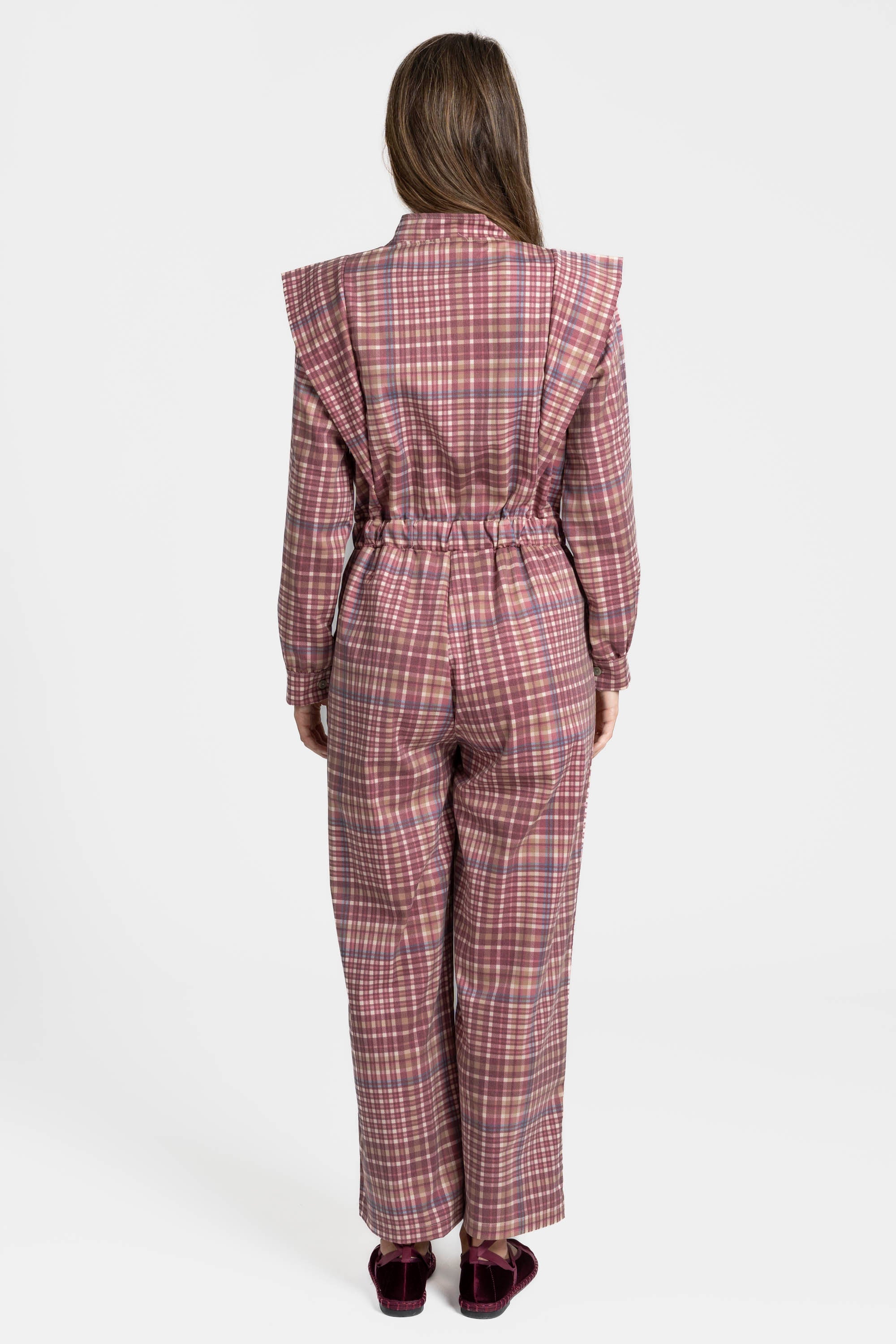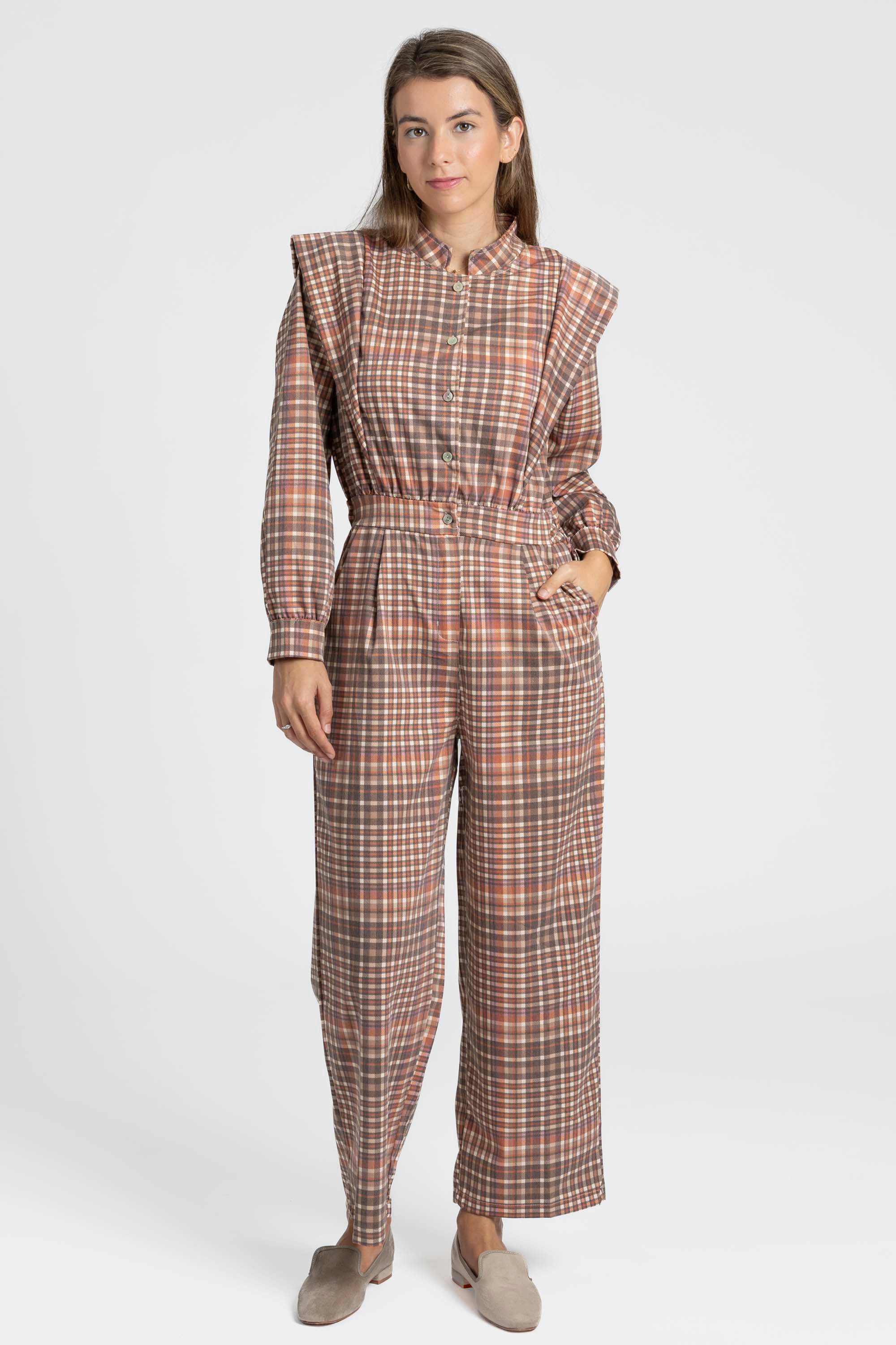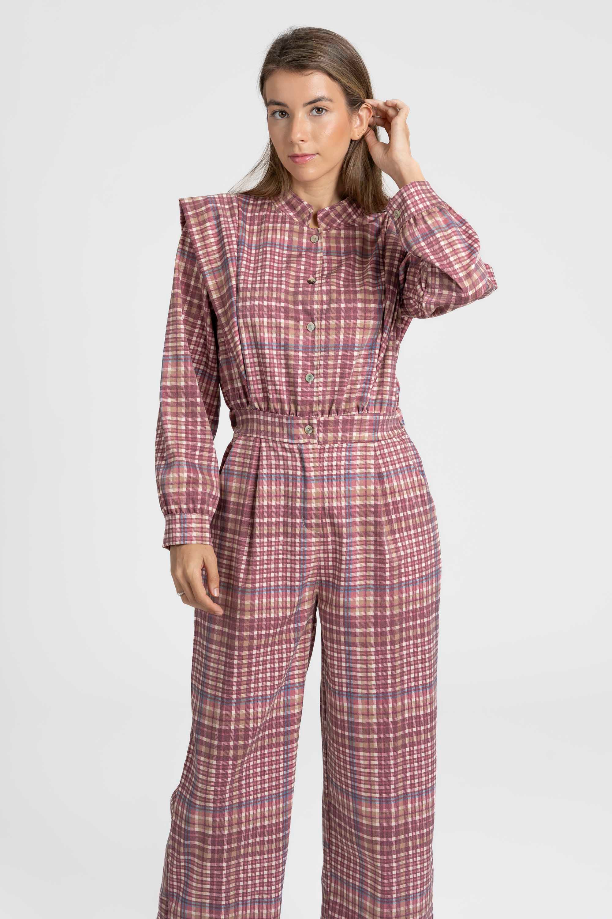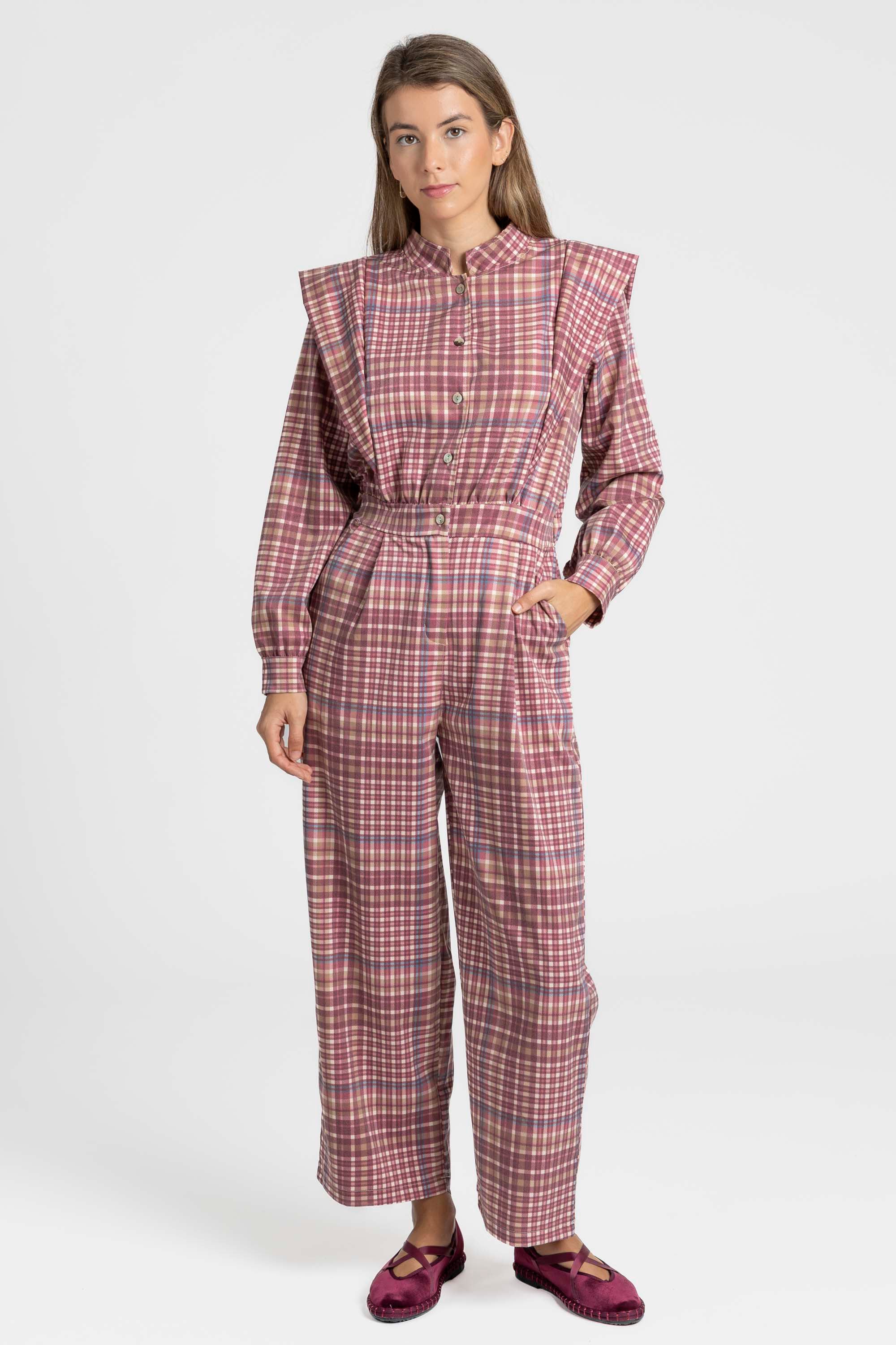 Tejido estampado cuadros. Cuello redondo. Manga larga. Cierre botones. Cintura elástica y cremallera. Pernera recta. Bolsillos laterales. Composición: 78% Viscosa, 18%...