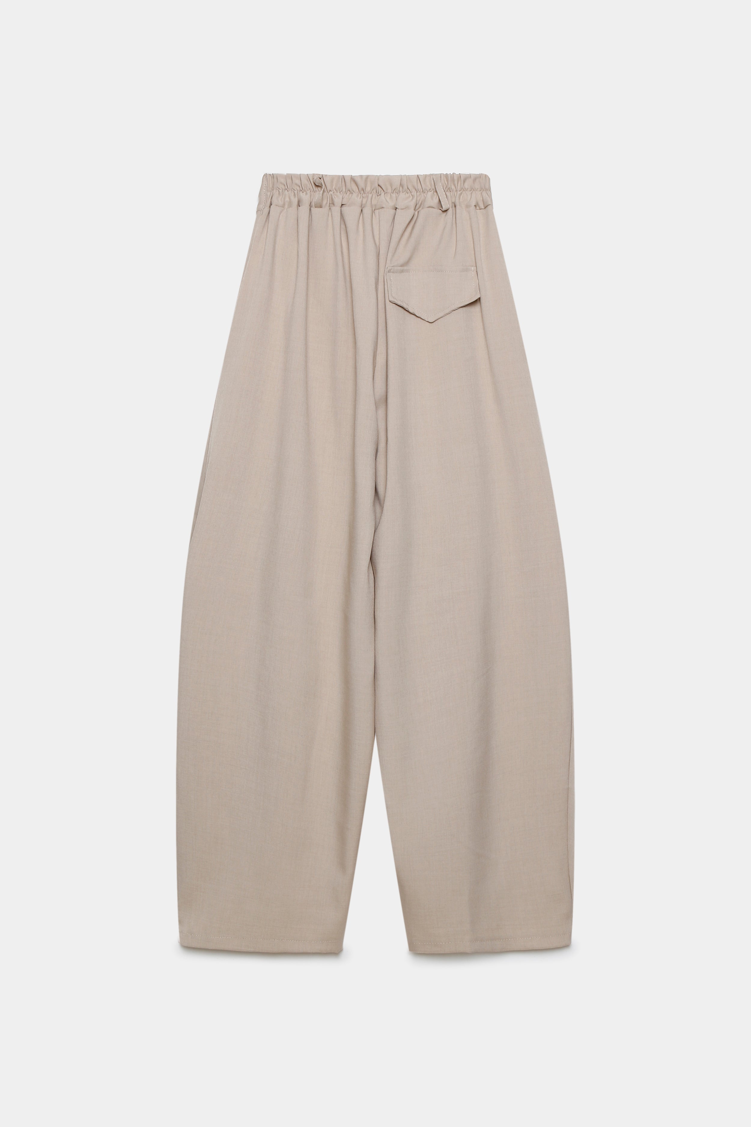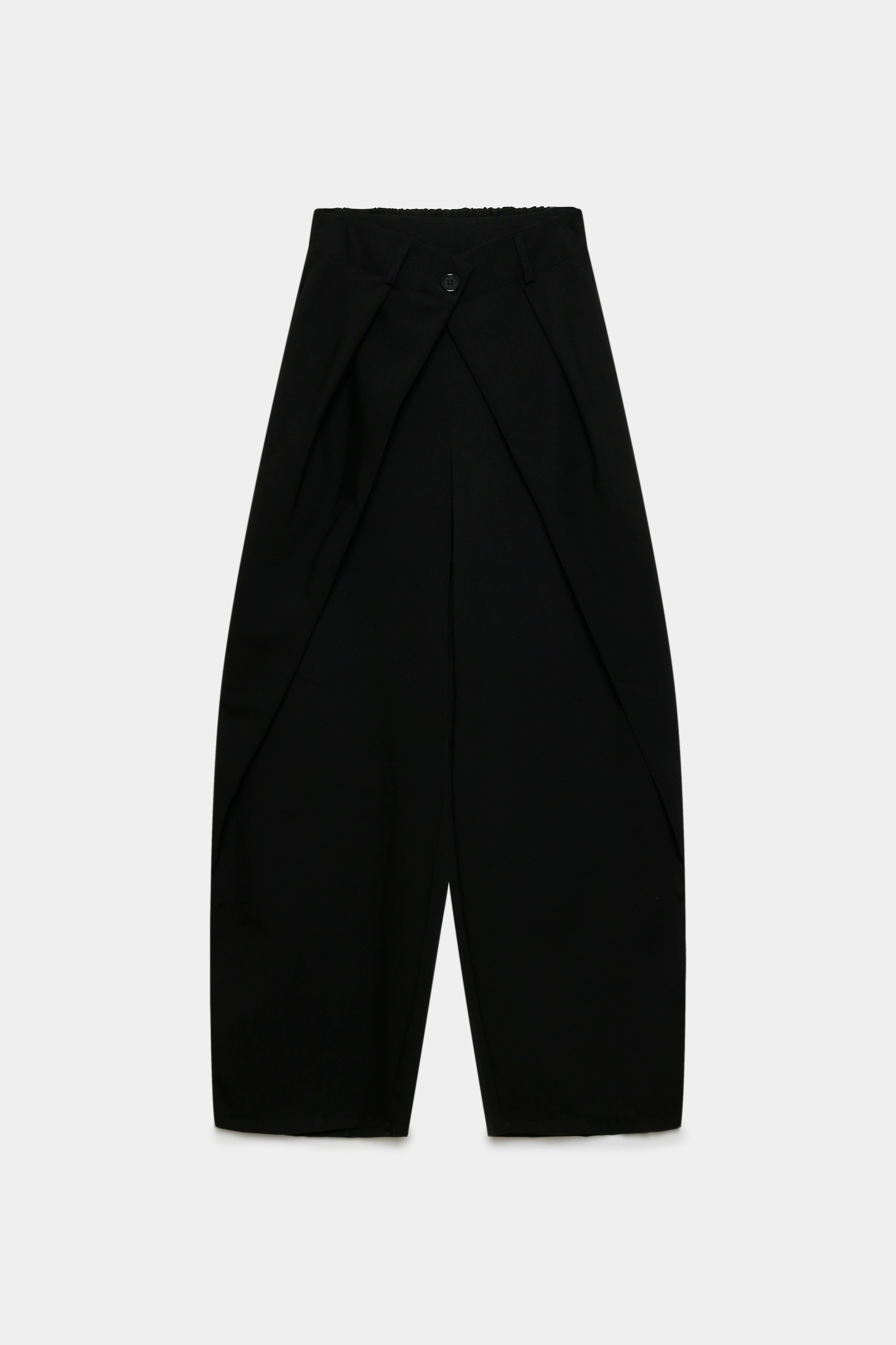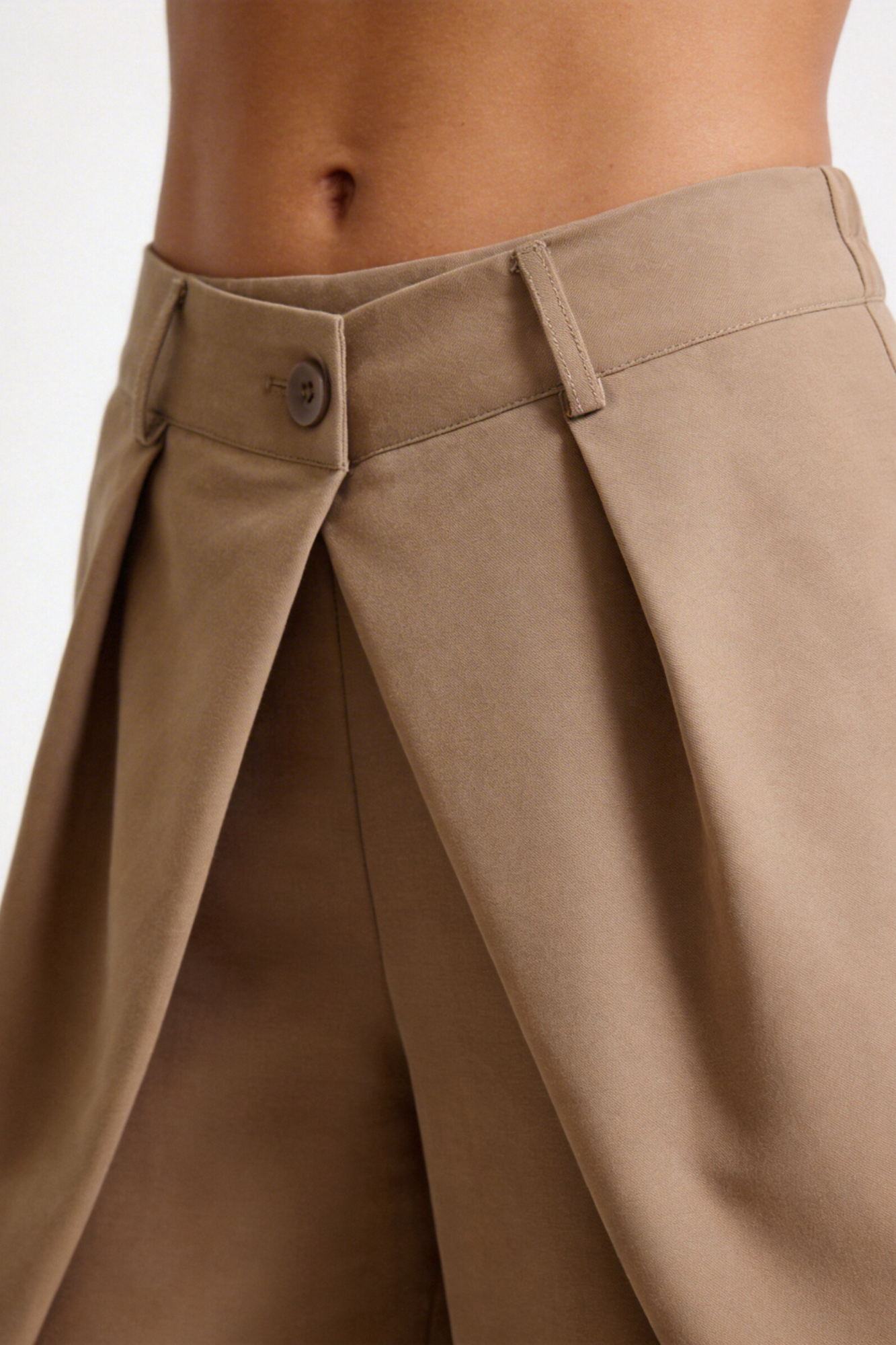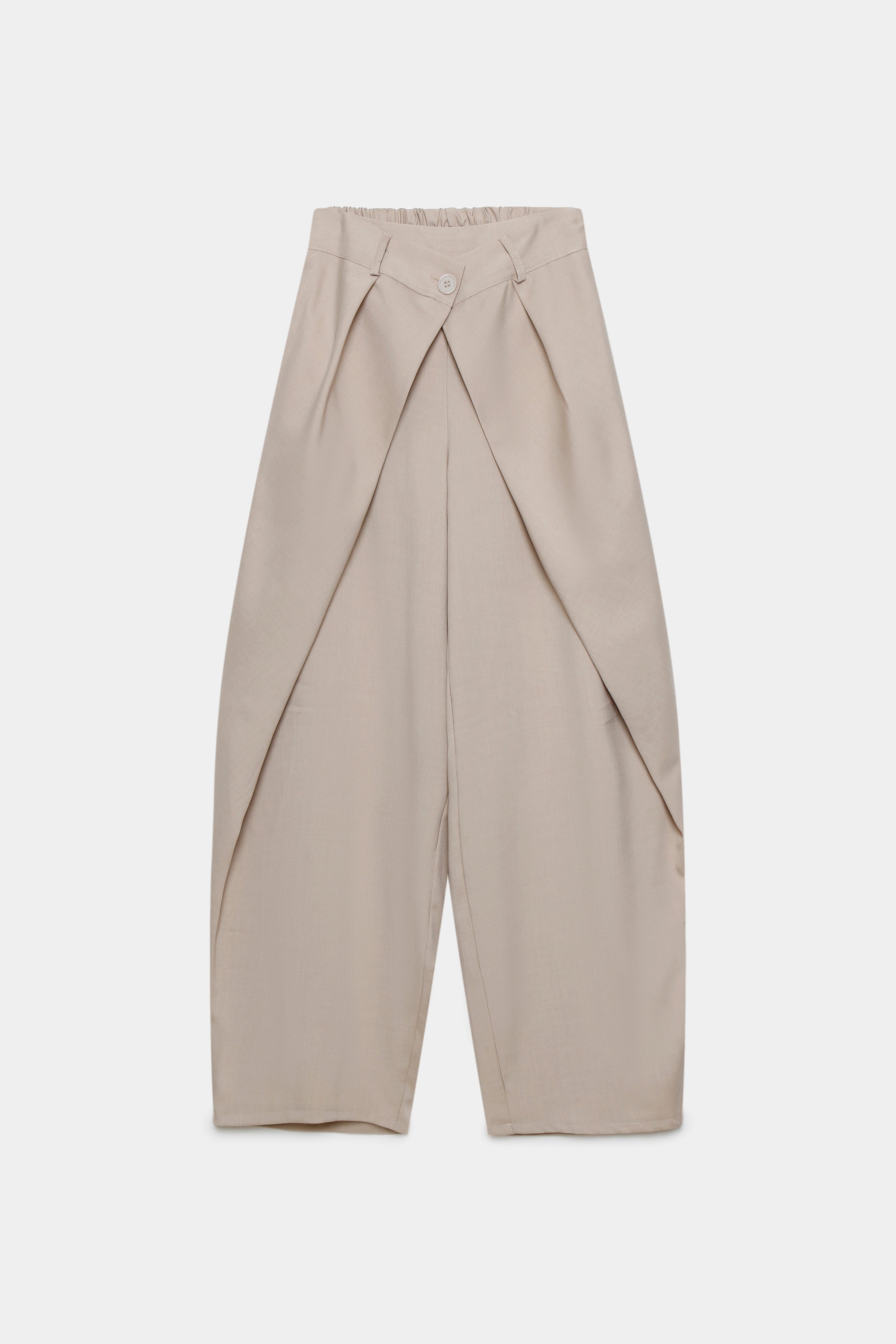 Tejido fluido. Pantalón de tiro alto con trabillas. Bolsillos en delantero de vivo. Detalle de tejido en superposición en delantero...