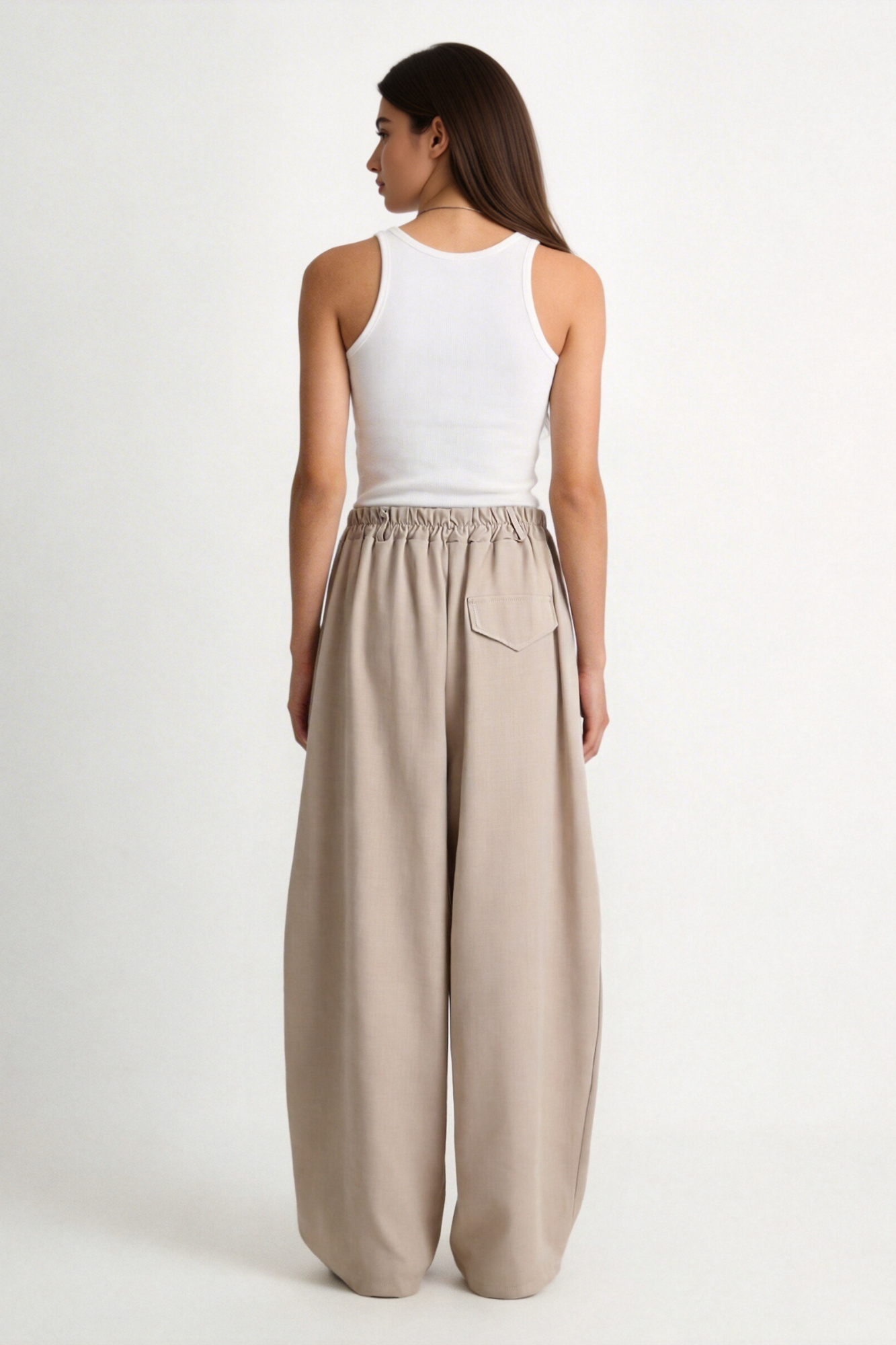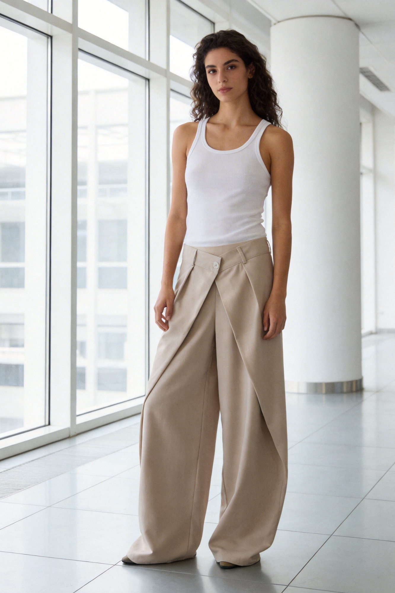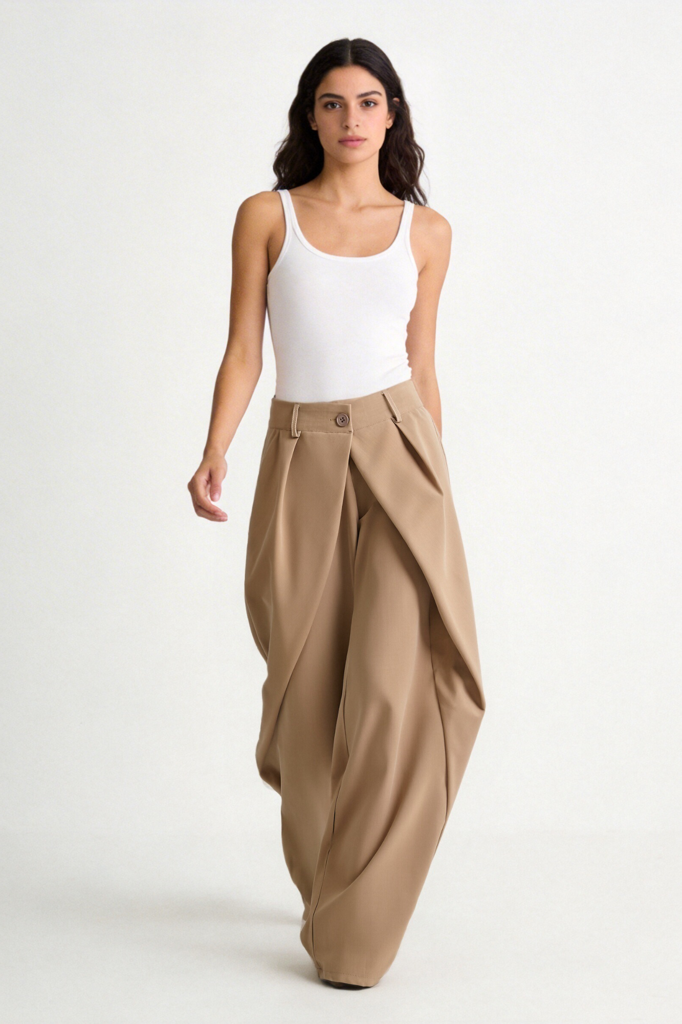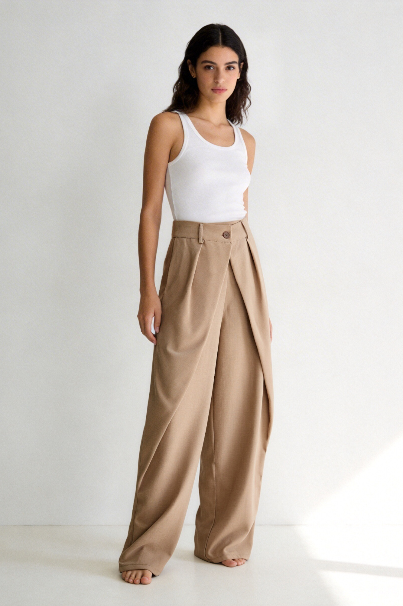 Tejido fluido. Pantalón de tiro alto con trabillas. Bolsillos en delantero de vivo. Detalle de tejido en superposición en delantero...