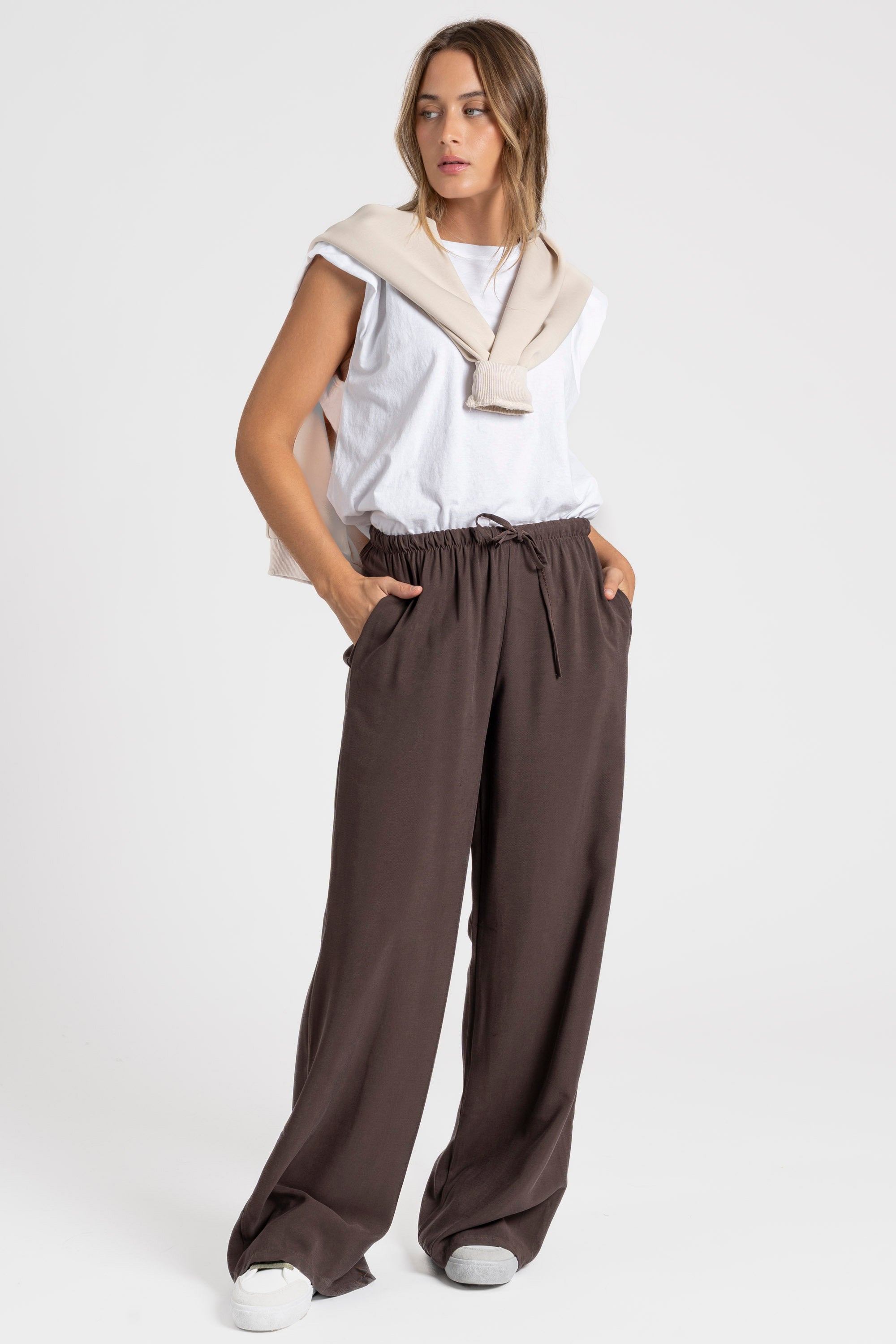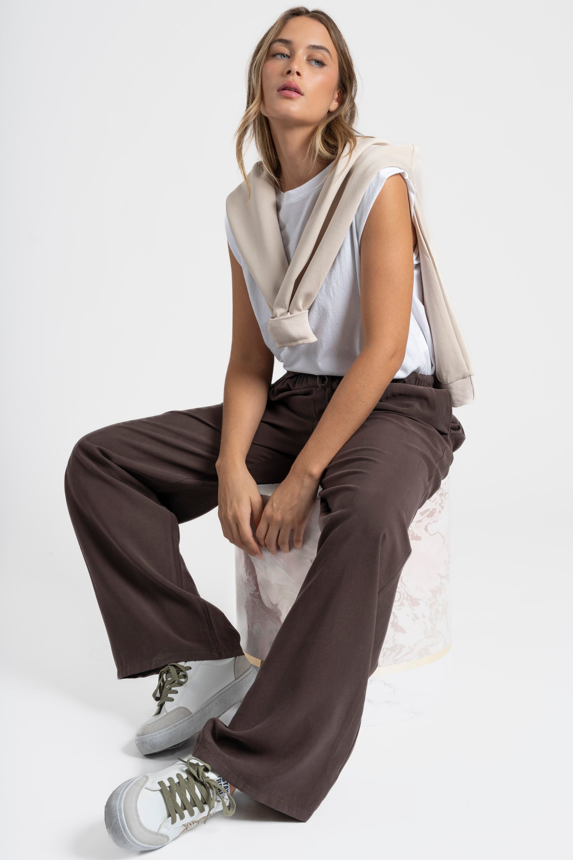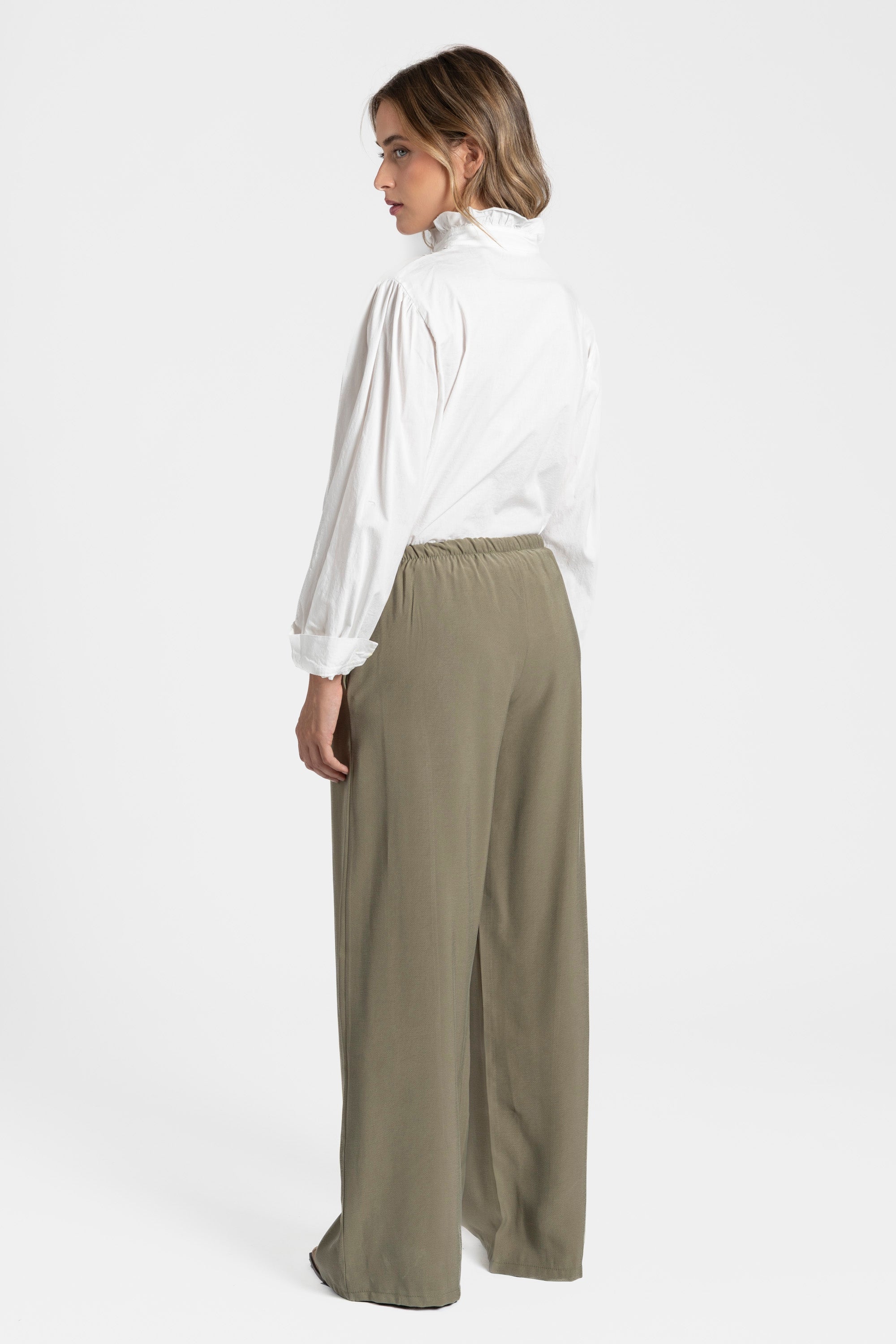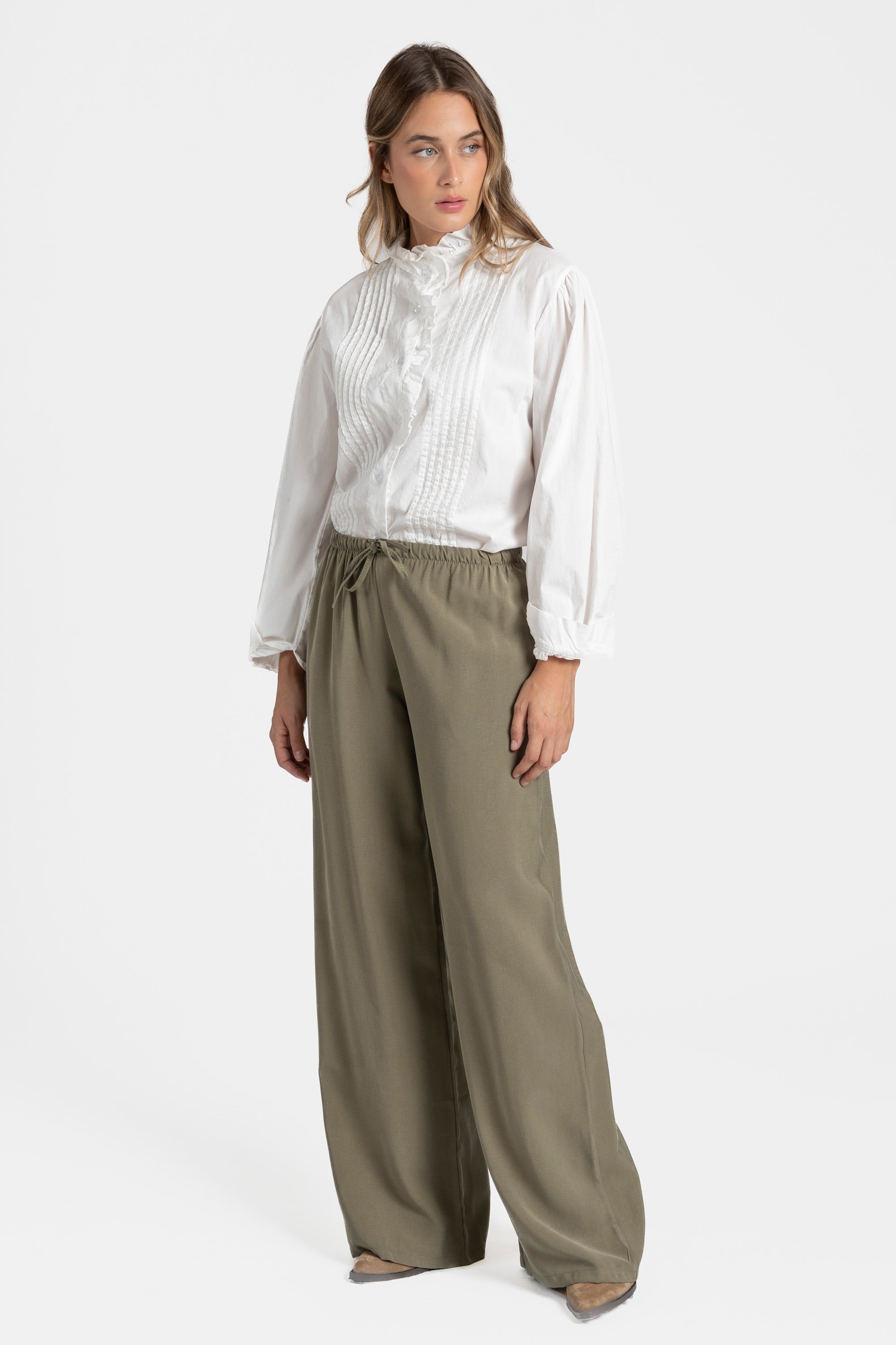 Tejido fluido. Cintura media. Cintura elástica ajustable con lazos. Bolsillos laterales. Pernera ancha. Composición: 90% Viscosa, 10% Poliérter Hecho en Italia