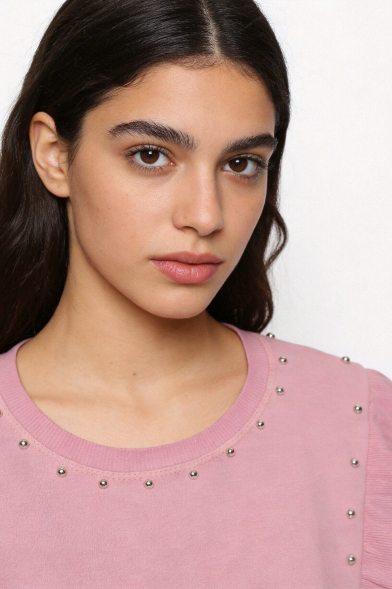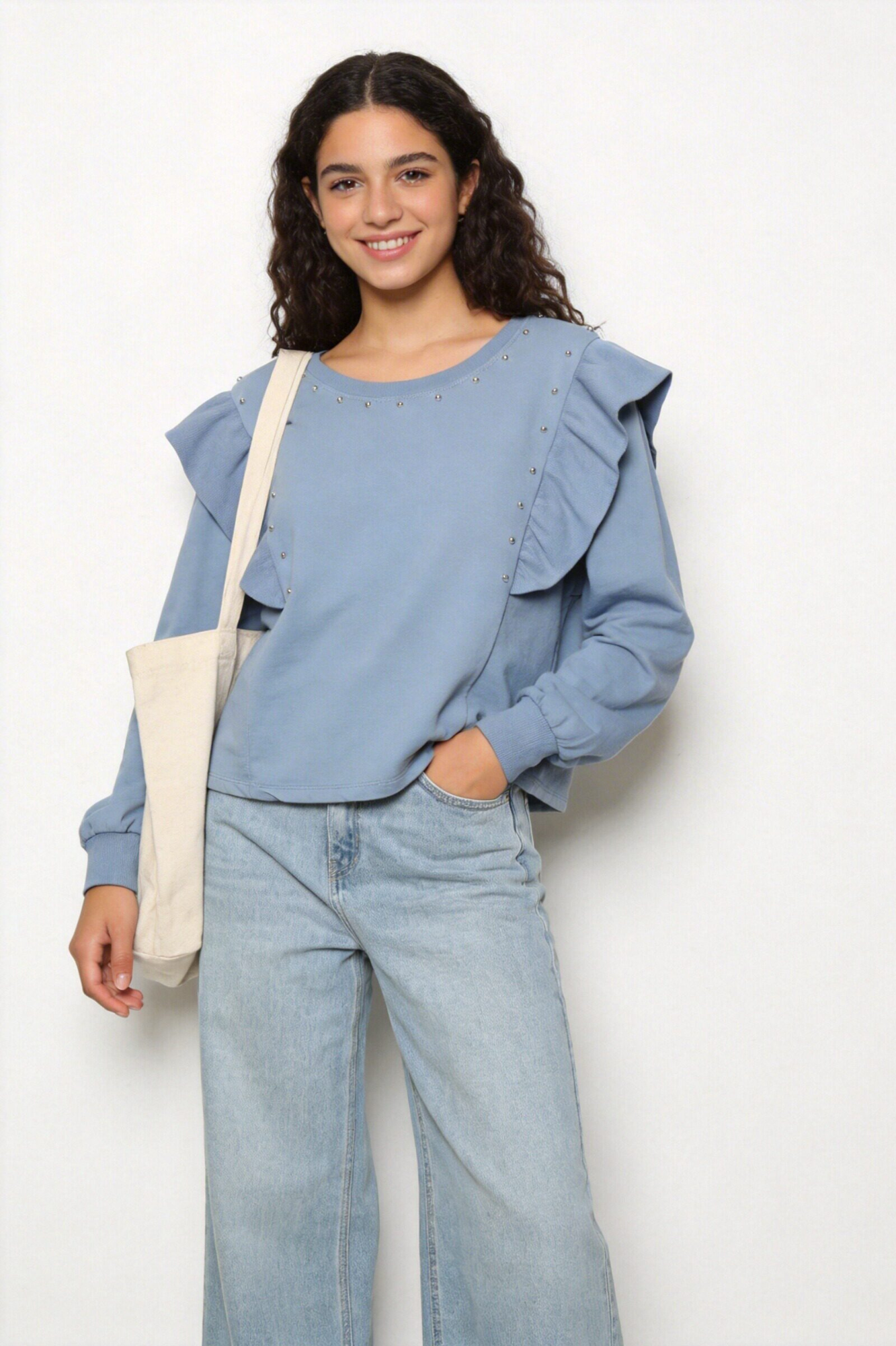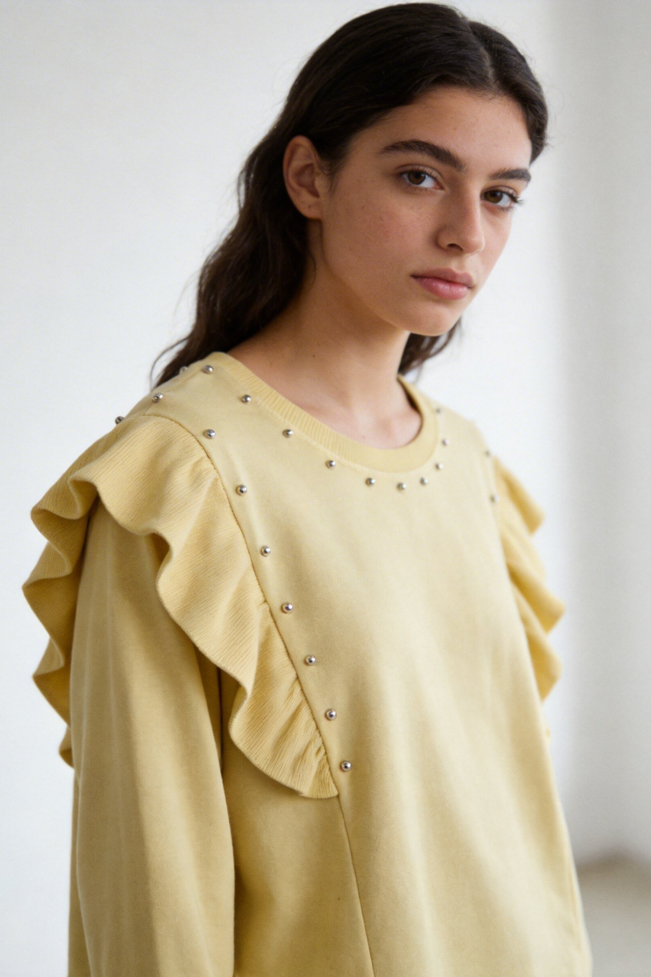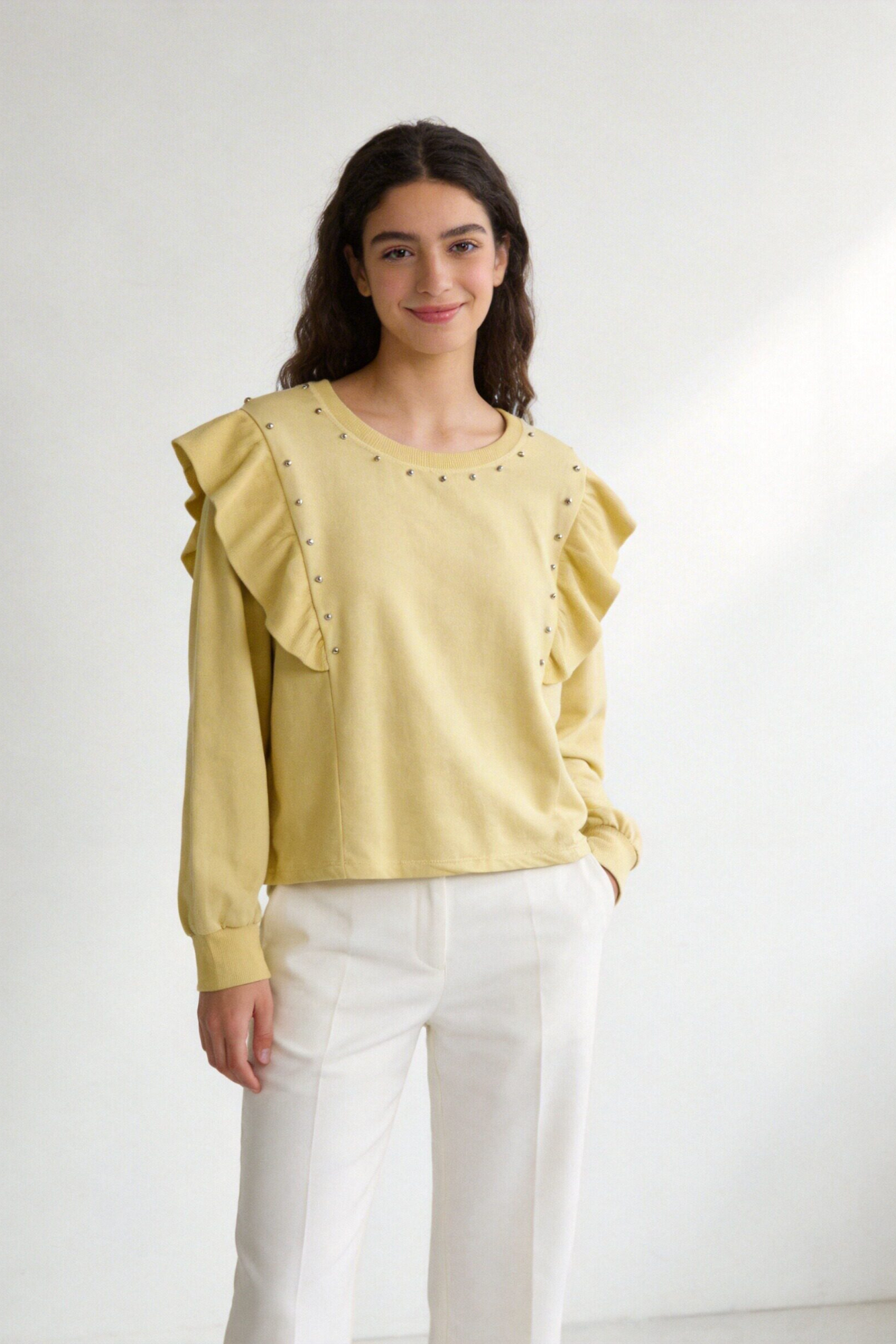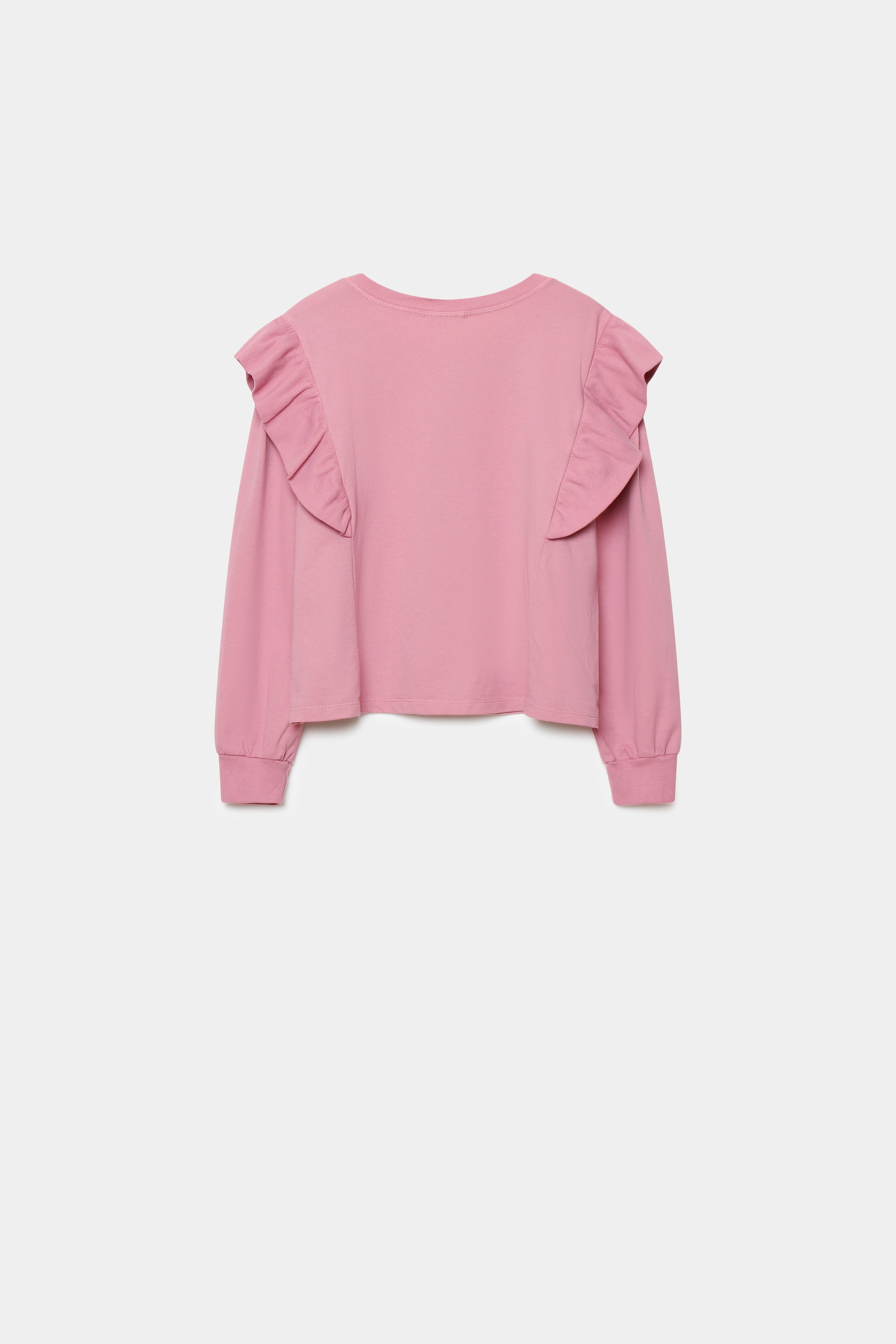 Tejido mezcla de algodón. Cuello redondo. Manga larga. Detalle tachuelas y volantes. Composición: 95% Algodón, 5% ElastanoHecho en Italia