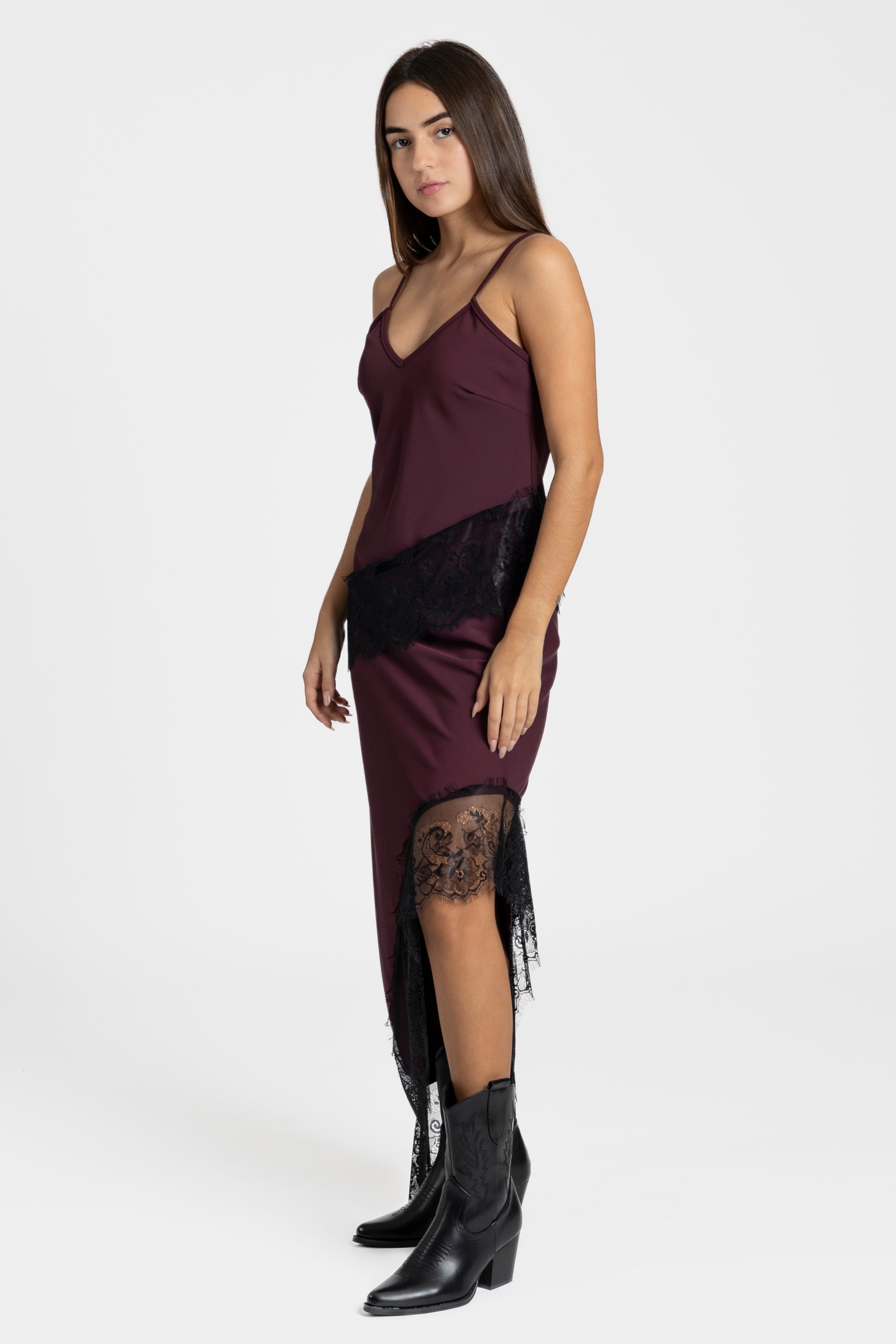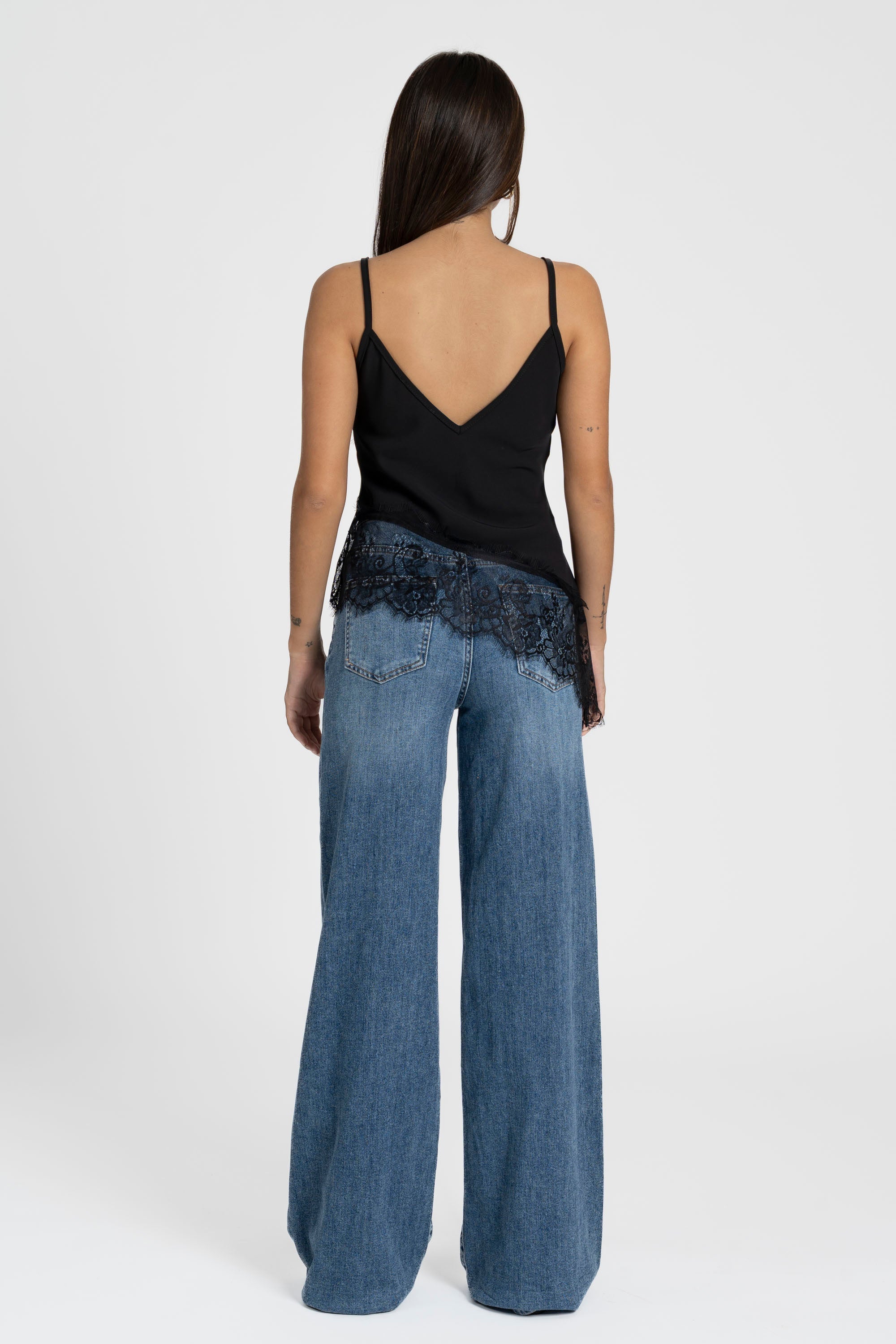 Tejido grueso. Encaje. Escote pico. Tirantes finos. Bajo asimetrico. Composición: 95% Poliéster, 5% Elastano Hecho en Italia