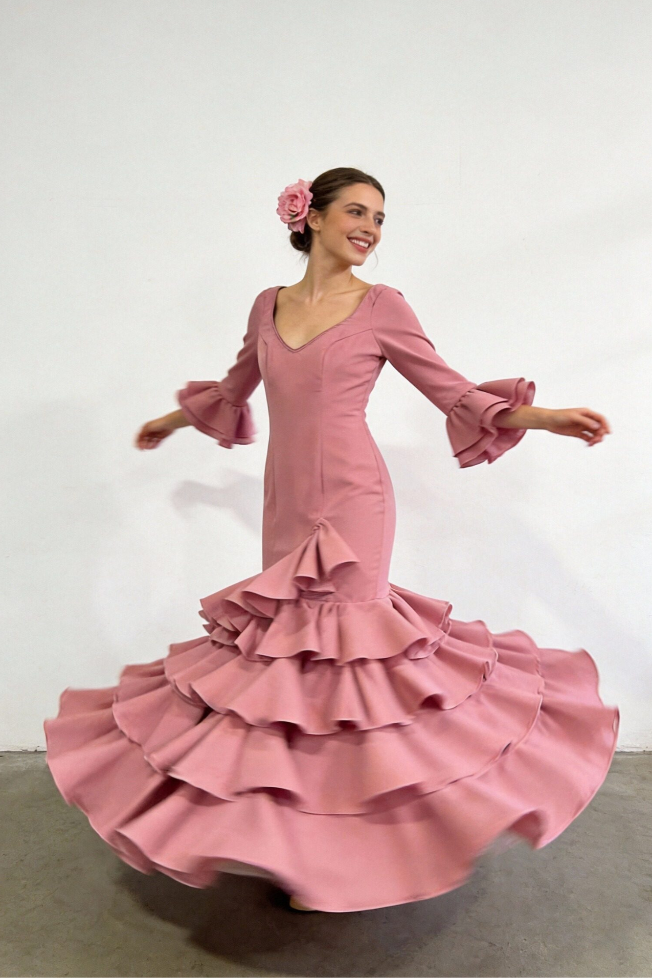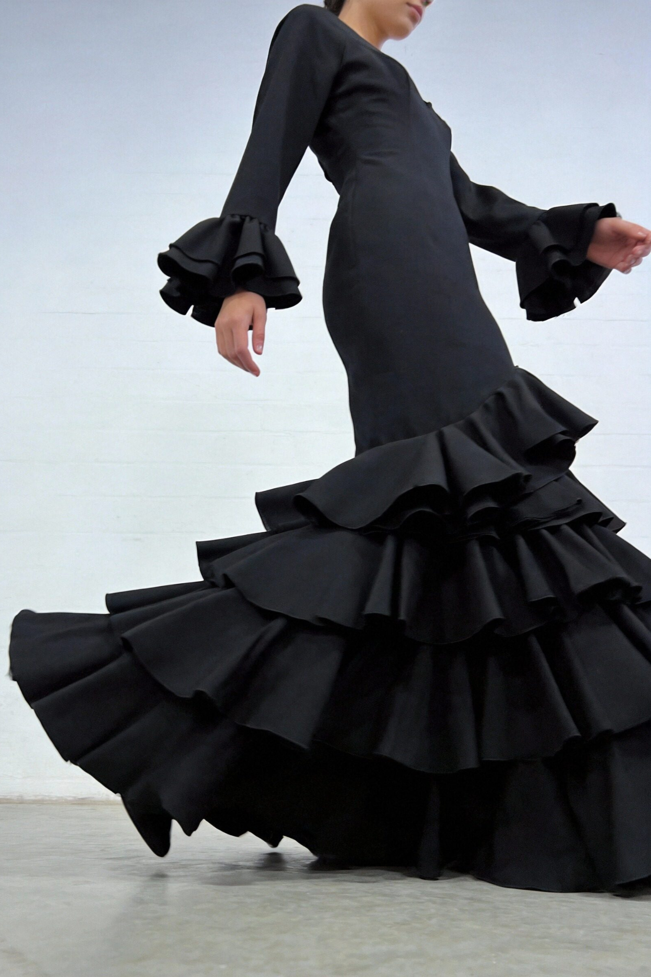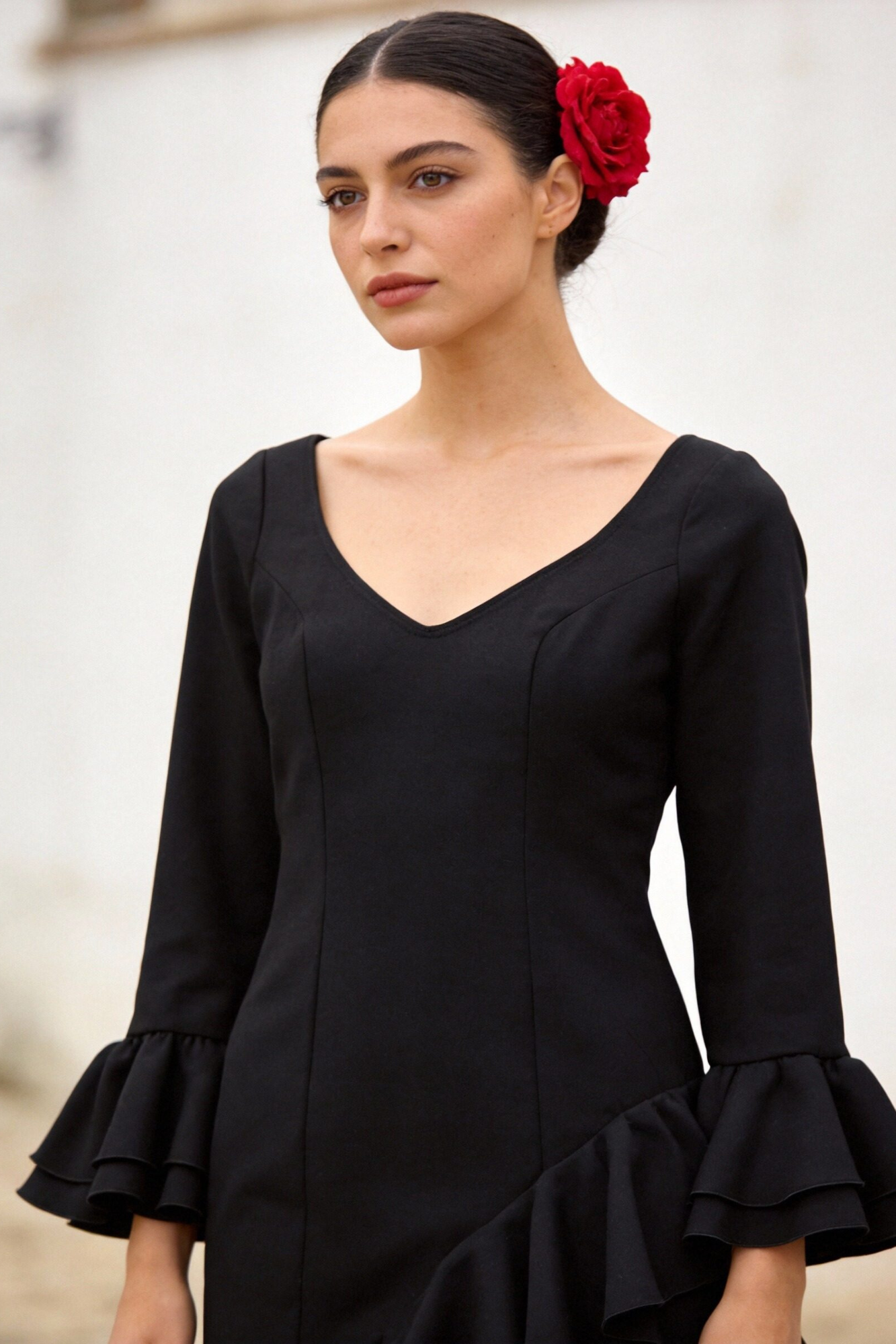 Tejido liso fluido. Traje de flamenca ajustado. De manga larga y volantes. Escote pico. Bolsillo interior. Cierre trasera con cremallera. Ajustable....