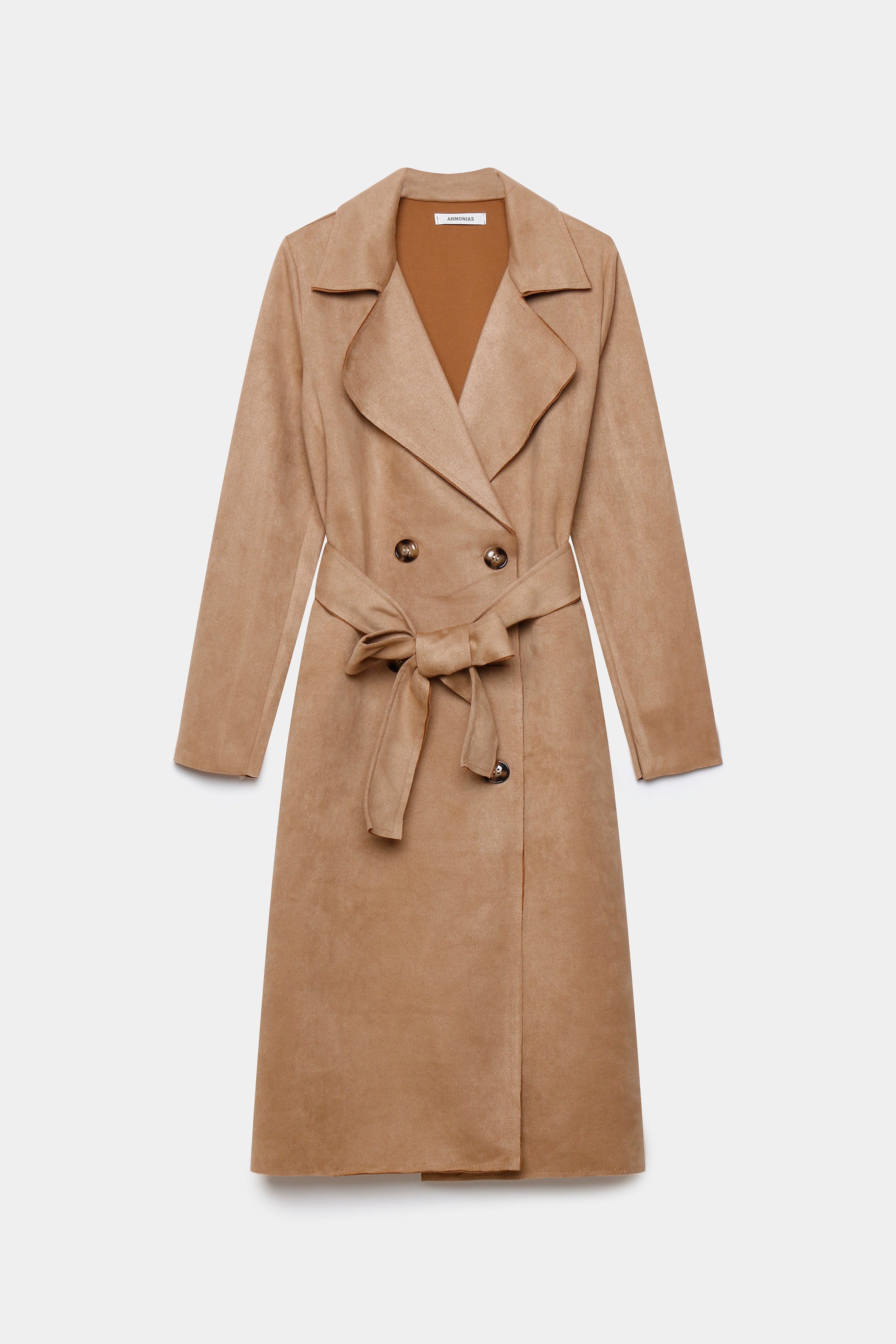 Trench de cuello solapa y manga larga. Bolsillos delanteros de vivo. Cierre frontal cruzado con botones y cinturón del mismo...
