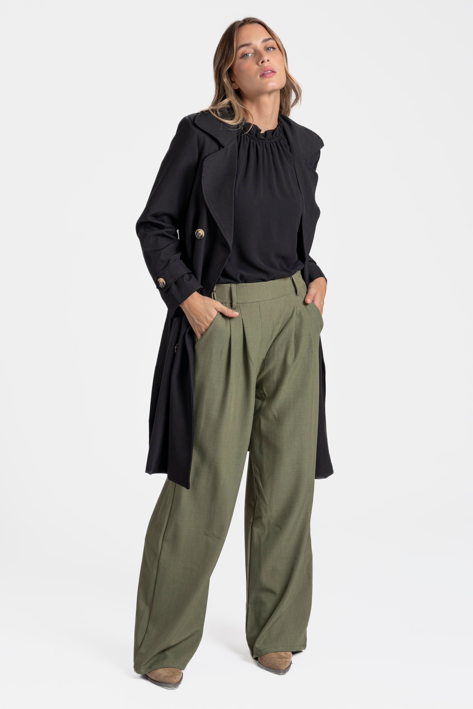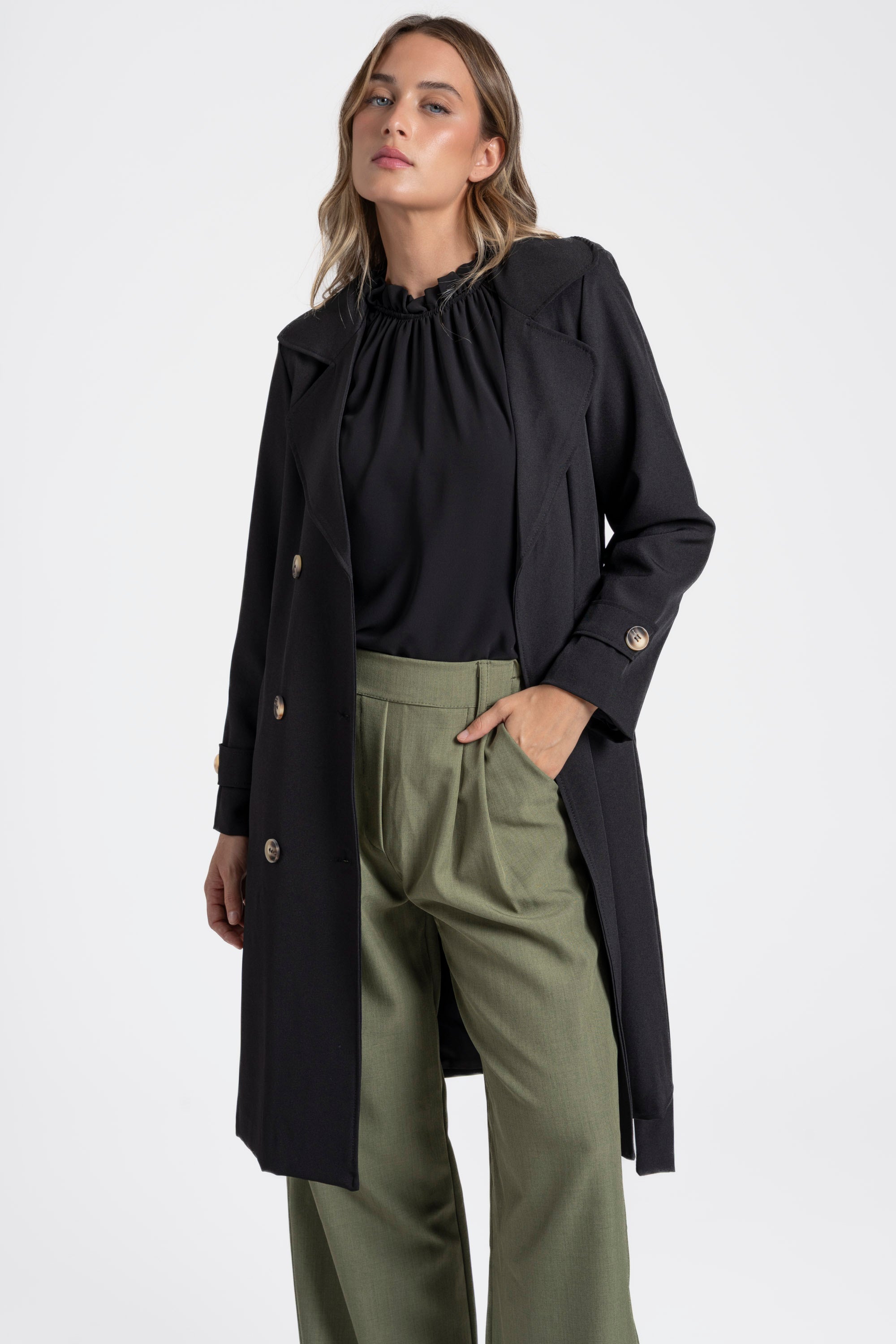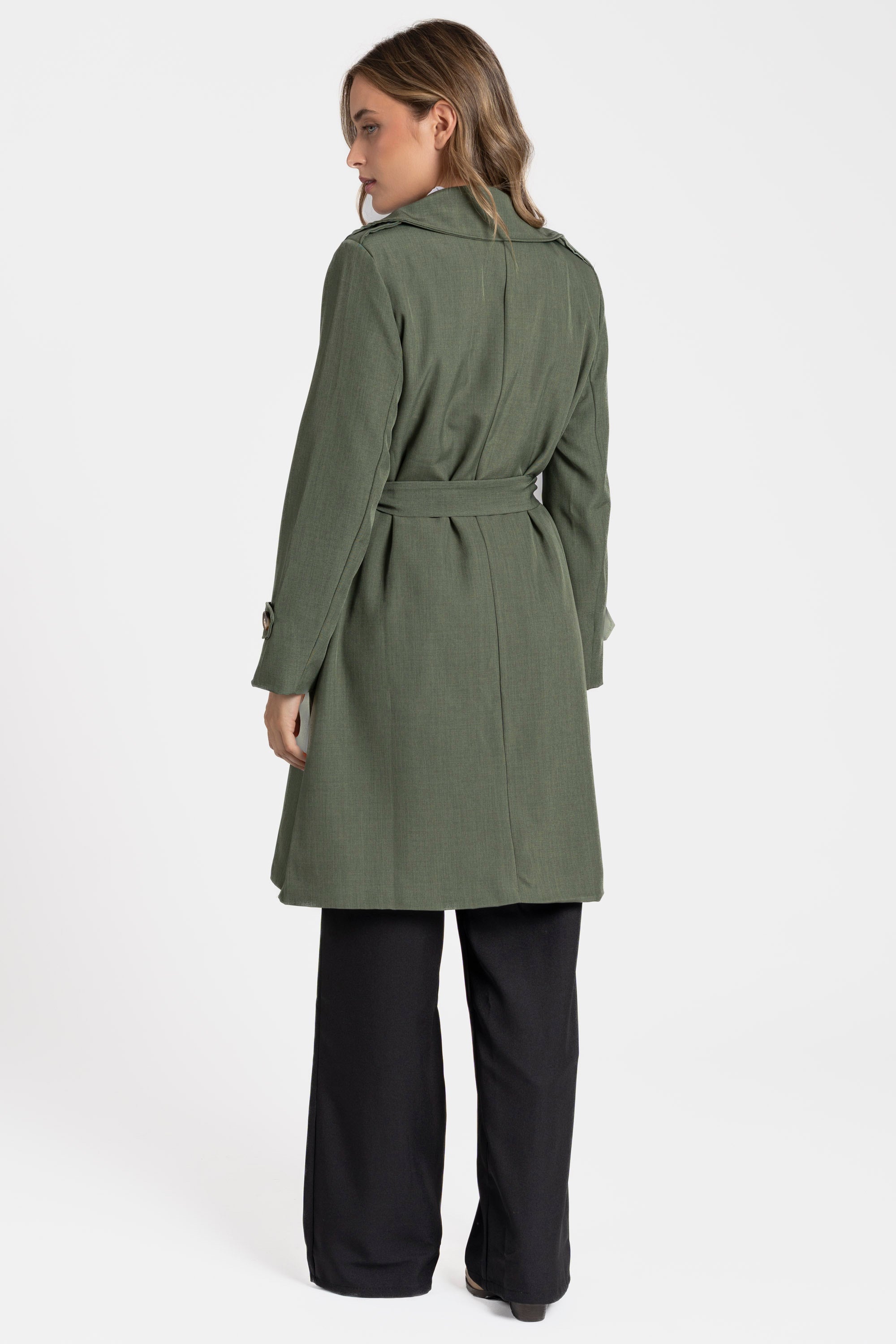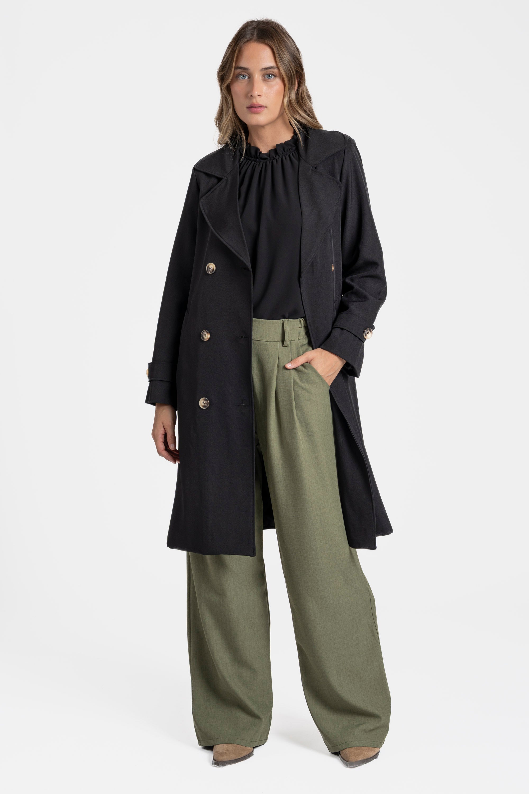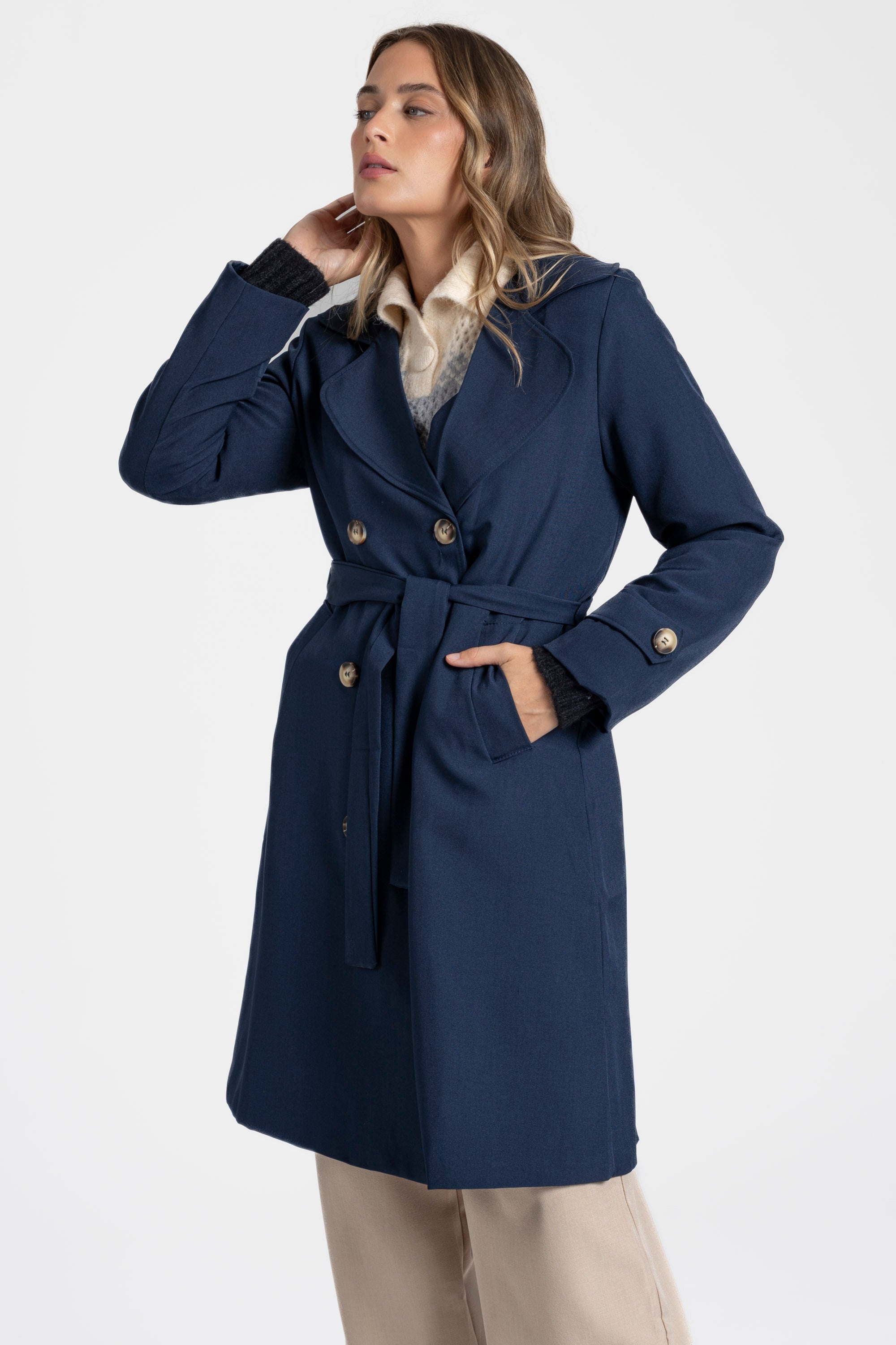 Trench de cuello solapa y manga larga. Bolsillos delanteros. Cierre frontal cruzado con botones y cinturón del mismo tejido. Composición: 95%...