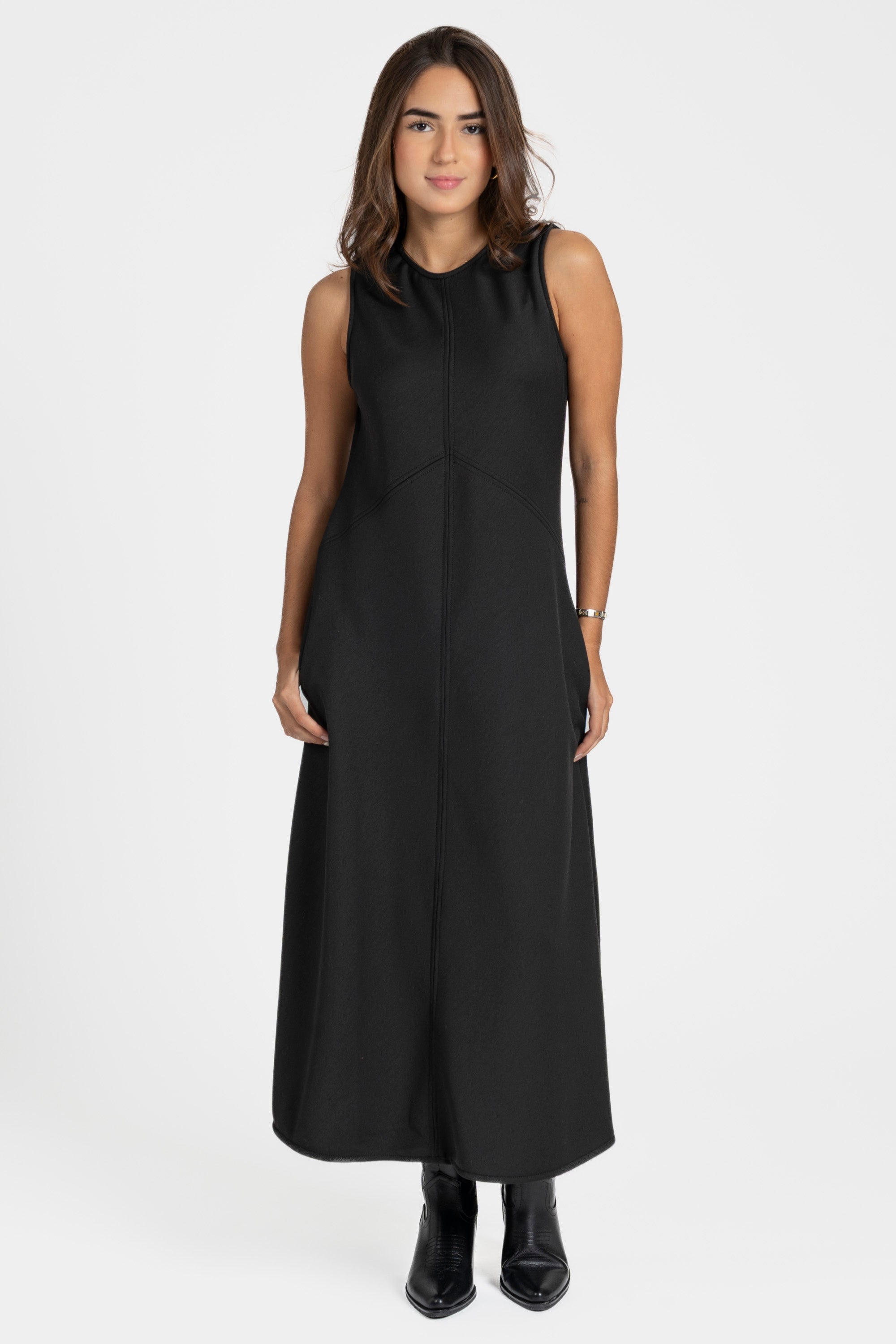 Tejido ancho suave. Cuello redondo. Manga sisa. Bolsillos laterales. Diseño largo. Composición: 95% Poliéster, 5% Elastano Hecho en Italia